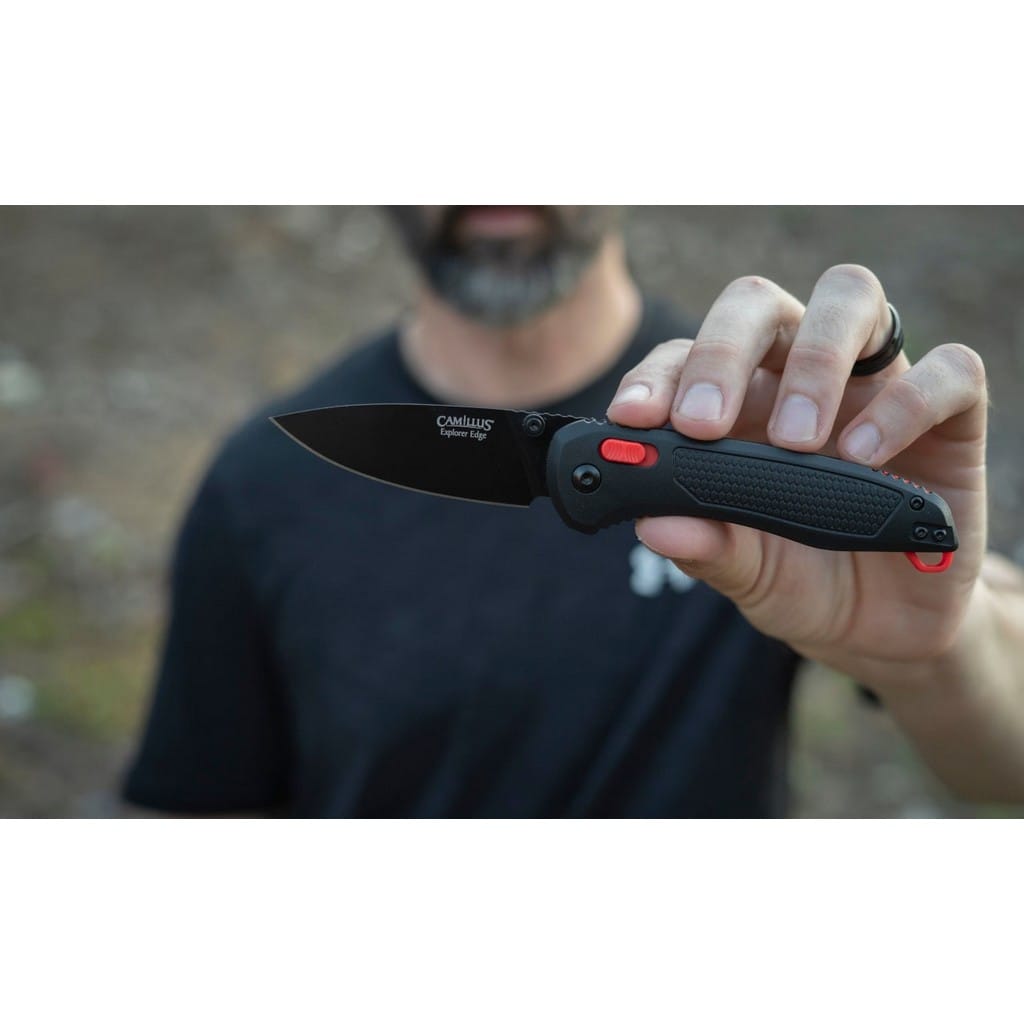 Camillus Explorer Edge to funkcjonalny folder EDC zaprojektowany do codziennych zadań. Model posiada ostrze o profilu Drop Point wykonane ze stali nierdzewnej 3Cr13 pokrytej czarną powłoką chroniącą przed korozją i negatywnym działaniem czynników zewnętrznych. Klingę osadzono na łożyskach kulkowych, która przy wykorzystaniu kołka wysuwa się płynnie i gładko. Prosta obsługa jedną ręką zadowoli zarówno osoby prawo, jak i leworęczne. Karbowany grzbiet głowni stanowi stabilne wsparcie dla kciuka, co pomaga przy precyzyjnych zadaniach. Wysoki poziom bezpieczeństwa zapewnia mechanizm Crossbar Lock w postaci obustronnego bolca na rękojeści. Okładziny chwytu z nylonu wzmocnionego włóknem szklanym charakteryzują się antypoślizgową fakturą, zwiększającą przyczepność do dłoni użytkownika. Na zakończeniu znajduje się otwór na linkę umożliwiający przełożenie breloka ozdobnego lub paracordu. Konstrukcję uzupełnia dwupozycyjny klips mocujący do wygodnego przenoszenie foldera w kieszeni spodni lub przy wyposażeniu. Firma Camillus Cutlery od 1876 roku dostarcza niezawodne narzędzia, które wytrzymują próbę czasu. Jest to jeden z najstarszych amerykańskich producentów noży, cieszący się uznaniem na całym świecie.