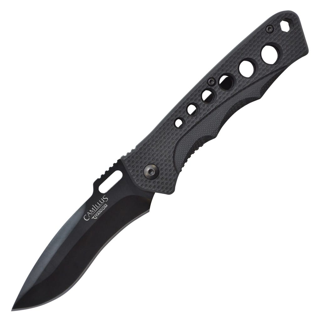 Camillus Rage to przystępny cenowo taktyczny nóż składany, zaprojektowany do codziennego użytku. Model posiada ostrze o uniwersalnym profilu Drop Point z kształtem fali, wykonane ze stali nierdzewnej 440. Pokryto ją opatentowaną przez producenta czarną powłoką Carbonitride Titanium. Jest to związek tytanu tworzący nieprzywierającą warstwę ochronną, która czyni klingę o dziesięć razy twardszą w stosunku do nieobrobionej stali. Dodatkowo zabezpiecza przed korozją i rysowaniem się powierzchni. W szybkim rozłożeniu narzędzia jedną ręką pomaga otwór na głowni. Bezpieczeństwo pracy zapewnia klasyczny mechanizm Liner Lock oraz karbowanie na grzbiecie noża stanowiące stabilne wsparcie dla kciuka. Czarne okładziny chwytu zrobiono z nylonu wzmocnionego włóknem szklanym o antypoślizgowej fakturze zwiększające przyczepność do dłoni. Rękojeść charakteryzuje się również ergonomicznym wyprofilowaniem pod zaciskające się palce, co gwarantuje pewny chwyt w każdych warunkach. Na zakończeniu znajduje się sześciokątny otwór na linkę umożliwiający przełożenie breloka ozdobnego lub paracordu. Konstrukcję uzupełnia klips mocujący do wygodnego przenoszenie foldera w kieszeni spodni lub przy wyposażeniu. Firma Camillus Cutlery od 1876 roku dostarcza niezawodne narzędzia, które wytrzymują próbę czasu. Jest to jeden z najstarszych amerykańskich producentów noży, cieszący się uznaniem na całym świecie.