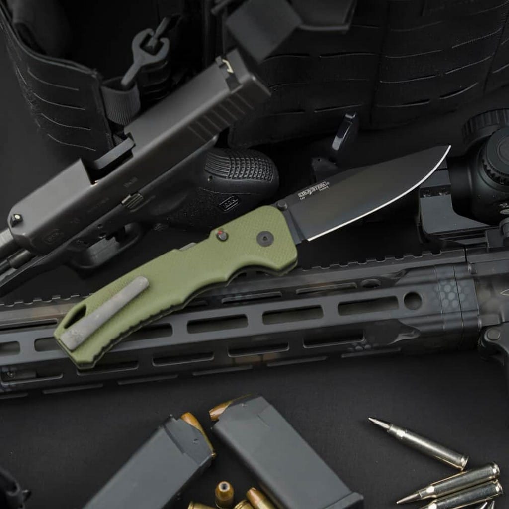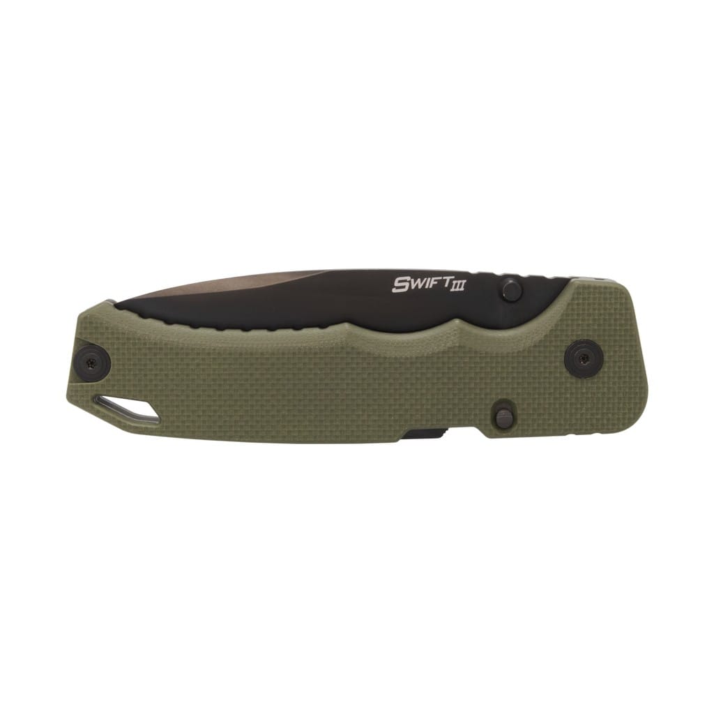 Swift III to wszechstronny nóż składany zaprojektowany przez renomowaną firmę Cold Steel jako niezawodne narzędzie do codziennej pracy. Model posiada uniwersalne ostrze o profilu Drop Point wykonane z wysokowydajnej stali narzędziowej CPM M4. Charakteryzuje się ona doskonałym trzymaniem ostrości, wytrzymałością i odpornością na korozje. W celu zabezpieczenia głowni przed negatywnym działaniem czynników zewnętrznych pokryto ją czarną i antyodblaskową powłoką ochronną. Sprawne i płynne rozłożenie foldera jedną ręką umożliwia obustronny kołek. Dodatkowo wspomaganie wysuwania klingi sprawia, że nóż jest gotowy do działania w ułamku sekundy. W pozycji rozłożonej narzędzie utrzymywane jest pewnie, dzięki innowacyjnej blokadzie Atlas Lock umiejscowionej na grzbiecie produktu. Ten opatentowany przez producenta system mocno trzyma ostrze na miejscu, eliminując ryzyko przypadkowego jego zamknięcia oraz poprawiając ogólne bezpieczeństwo. Przed wysunięciem głowni należy w pierwszej kolejności zwolnić blokadę suwakiem na rękojeści, aż pojawi się czerwona kropka. Okładziny chwytu zrobiono z odpornego na warunki atmosferyczne materiału G10 o antypoślizgowej fakturze. W połączeniu z ergonomicznym wyprofilowaniem zapewniają dobrą przyczepność do dłoni w każdych warunkach oraz komfort użytkowania. Na zakończeniu umieszczono otwór umożliwiający przełożenie breloka ozdobnego lub paracordu. Konstrukcję uzupełnia dwupozycyjny klips mocujący pozwalający na wygodne przenoszenie noża w kieszeni spodni lub przy wyposażeniu.
