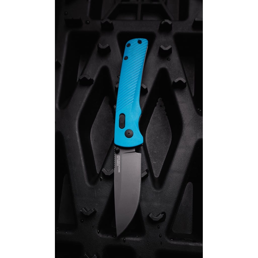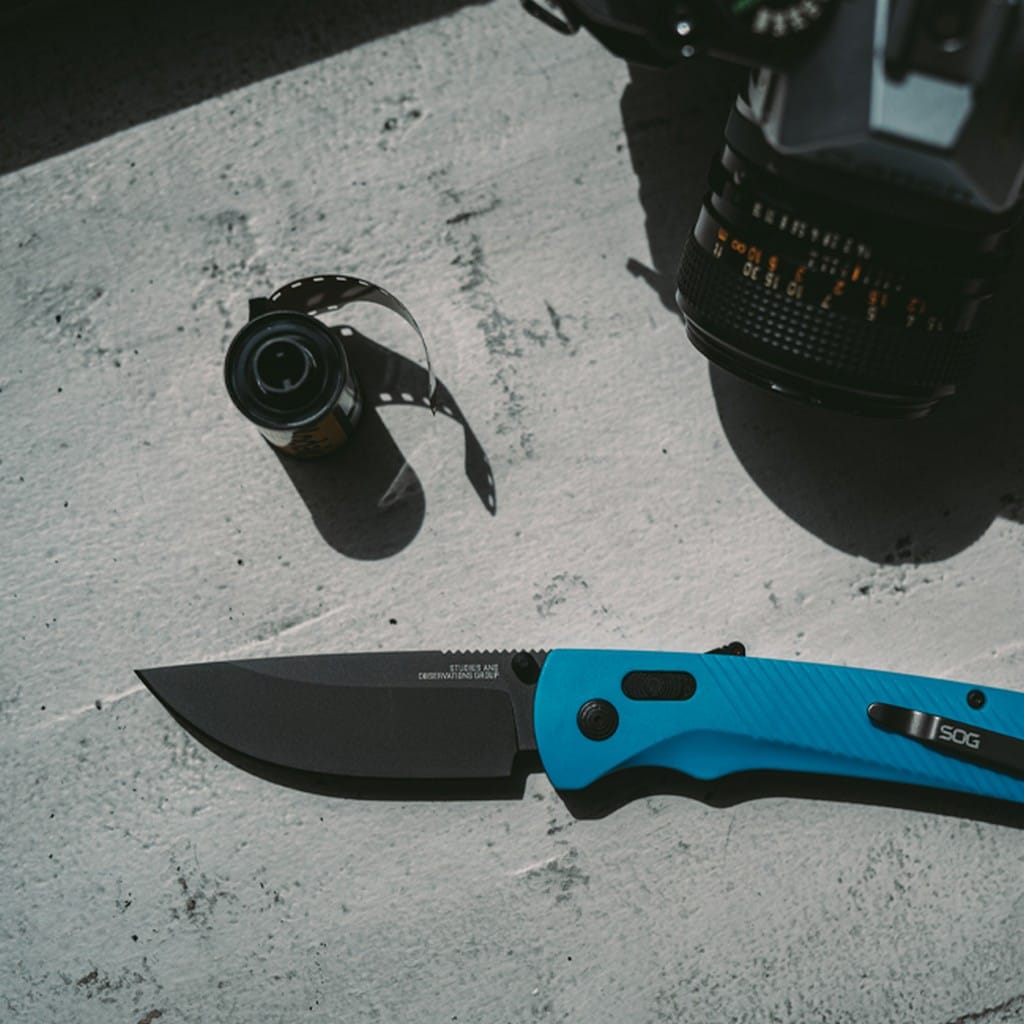 Flash AT to prosty i funkcjonalny model zaprojektowany przez amerykańską firmę Sog z myślą o codziennych czynnościach. Doskonale sprawdzi się w biurze, w domu, w drodze, na mieście, jednym słowem zawsze i wszędzie gwarantując niezawodność w działaniu. Ostrze o profilu Drop Point zostało wykonane z wysokiej jakości stali narzędziowej D2 poddanej kriogenicznej obróbce cieplnej, dzięki czemu pozostaje ona dłużej ostra i jest bardziej odporna na pęknięcia i wykruszenia. Pokrycie jej czarnym azotkiem tytanu (Titanium Nitride) zwiększa twardość głowni i wytrzymałość na zarysowania. Rękojeść w niebieskim kolorze z nylonu wzmocnionego włóknem szklanych posiada charakterystyczne nacięcia i wyprofilowanie pod palec, wszystko to zapewnia komfort użytkowania oraz dobrą przyczepność do dłoni i łatwą obsługę nawet w rękawicach. W szybkim wysunięciu klingi jedną ręką pomaga obustronny kołek na głowni, co w połączeniu ze wspomaganiem Assisted Technology (AT) sprawia, że ostrze jest gotowe do użycia w ułamku sekundy. Opatentowana przez producenta blokada AT-XR gwarantuje bezpieczeństwo, a dodatkowo zabezpieczenie SAFETY 2.0 w postaci oburęcznego bolca na grzbiecie chroni przed przypadkowym rozłożeniem się noża. Dodatkowo karbowane oparcie pod kciuk pomaga przy precyzyjnych zadaniach. Konstrukcję uzupełnia klips mocujący do głębokiego przenoszenia foldera w kieszeni spodni. Model Flash AT zachowuje odpowiedni balans pomiędzy nowoczesnym designem, a wydajnością cechującą poprzednie wersje tego modelu.
