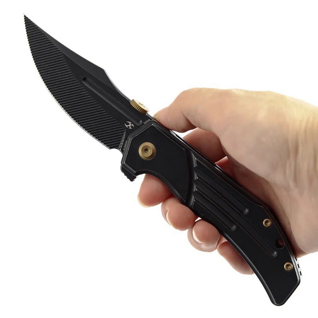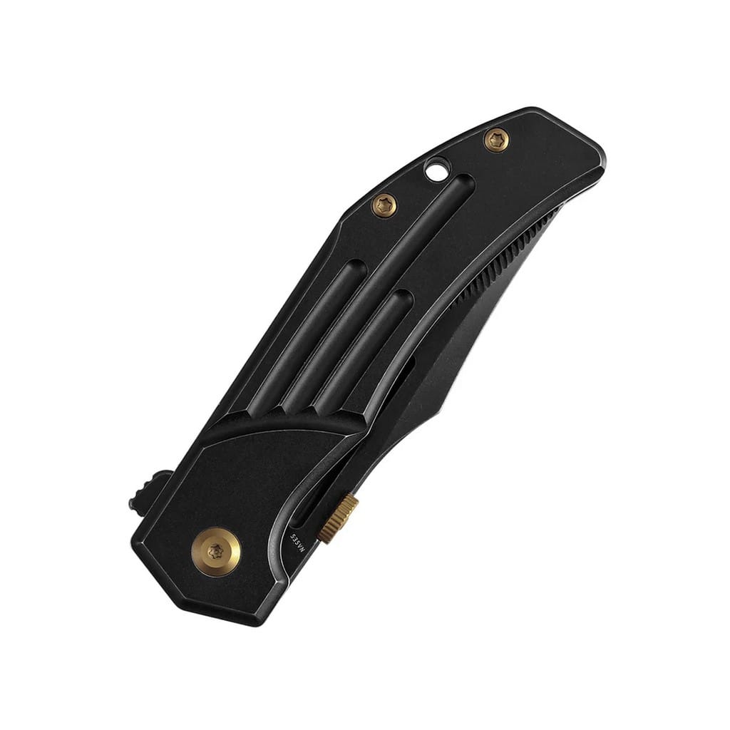 JB Stout z zawodu jest mechanikiem, który z pasją tworzy również noże, a model Orion to prawdziwe dzieło sztuki. Został zaprojektowany dla firmy Kanspet Knives i wyprodukowany w limitowanej ilości 800 sztuk. Fakt ten z pewnością ucieszy kolekcjonerów poszukujących folderów z ograniczoną dostępnością na rynku, co stanowi swoistą perełkę w gablocie. Orion posiada ostrze o profilu Clip Point zrobione z amerykańskiej stali nierdzewnej klasy premium CPM S35VN. Odpowiednio dobrane proporcje wanadu i niobu wpływają na jej twardość, wytrzymałość i odporność na korozję. Wykończenie głowni na czarno metodą Blackwash pozostawia nieregularną powłokę dobrze maskującą rysy i zadrapania powstające podczas eksploatacji. Przyciągające wzrok frezowania na klindze nadają interesującego i unikatowego wyglądu. Ostrze osadzono na ceramicznych łożyskach kulkowych, która przy wykorzystaniu dysku lub dużego flippera, pełniącego również funkcję jelca, wysuwa się płynnie i gładko. Prosta obsługa jedną ręką zadowoli zarówno osoby prawo, jak i leworęczne. Bezpieczeństwo pracy zapewnia solidny i niezawodny mechanizm Frame Lock skutecznie blokujący narzędzie po rozłożeniu. Ergonomicznie wyprofilowana, tytanowa rękojeść gwarantuje wysoki komfort użytkowania. Na zakończeniu umieszczono otwór umożliwiający przełożenie breloka ozdobnego lub paracordu ułatwiających chwytanie noża. Konstrukcję uzupełnia klips mocujący z tytanu służący do wygodnego przenoszenia foldera w kieszeni spodni. W zestawie znajduje się ściereczka z mikrofibry oraz wysokiej jakości pokrowiec transportowy, a całość zapakowano w czarne pudełko prezentowe. Kansept Knives to uosobienie najnowocześniejszych technologii i praktycznego wzornictwa. Jej motto brzmi “Nie tylko produkujemy noże, czynimy je lepszymi”, co doskonale oddaje profil tej marki. Firma wyróżnia się z tłumu innowacyjnymi koncepcjami angażując do współpracy najlepszych designerów z branży. Każdy element jest skrupulatnie obrabiany za pomocą zaawansowanych maszyn lub ręcznie, tworząc znakomite połączenie kunsztu i estetyki.