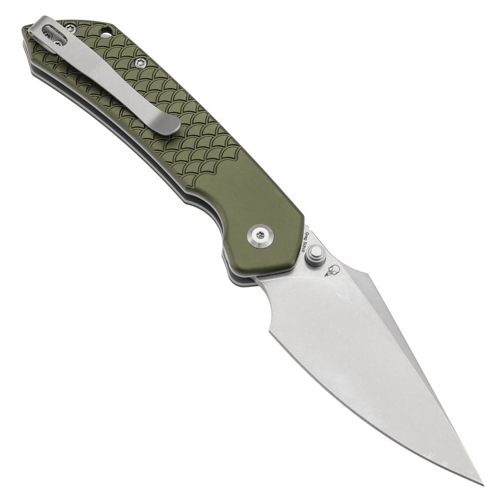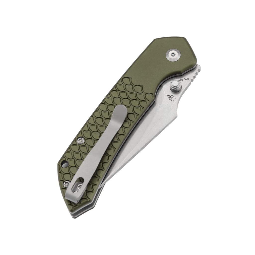 Fenrir to ciekawy folder EDC należący do przystępnej cenowo serii Tenable firmy Kansept Knives. Został zaprojektowany we współpracy z Gregiem Schobem, założycielem Sparrow Knife, który służy w Straży Przybrzeżnej USA na wybrzeżu Zatoki Meksykańskie, a w wolnych chwilach produkuje noże. Model posiada drapieżny kształt głowni o profilu Harpoon, wykonany ze stali nierdzewnej Nitro-V wzbogaconej o azot i wanad. Pierwiastki te zwiększają twardość i zapewniają wyjątkową wydajność krawędzi tnącej, a także odporoność na korozję, dzięki czemu folder idealnie sprawdzi się również w wilgotnym środowisku. Wykończenie ostrza metodą Stonewash pozostawia nieregularną powłokę dobrze maskującą rysy i zadrapania powstające podczas eksploatacji. Klingę osadzono na ceramicznych łożyskach kulkowych, która przy wykorzystaniu obustronnego kołka wysuwa się płynnie i gładko. Prosta obsługa jedną ręką zadowoli zarówno osoby prawo, jak i leworęczne. Niewielkie karbowanie na grzbiecie głowni stanowi wsparcie dla kciuka, a nad bezpieczeństwem czuwa blokada Top Liner Lock z przyciskiem na rękojeści, służącym do składania narzędzia. Okładziny o teksturze rybiej łuski zrobiono z aluminium anodowanego na zielono. Antypoślizgowa faktura oraz wyprofilowanie pod palec gwarantują pewny chwyt w każdej sytuacji. Na zakończeniu umieszczono otwór umożliwiający przełożenie breloka ozdobnego lub paracordu. Konstrukcję uzupełnia dwupozycyjny klips mocujący ułatwiający wygodne przenoszenie noża w kieszeni spodni lub przy wyposażeniu. Dodatkowo w zestawie znajduje się ściereczka z mikrofibry do czyszczenia produktu. Kansept Knives to uosobienie najnowocześniejszych technologii i praktycznego wzornictwa. Jej motto brzmi “Nie tylko produkujemy noże, czynimy je lepszymi”, co doskonale oddaje charakter tej marki. Firma wyróżnia się z tłumu innowacyjnymi koncepcjami angażując do współpracy najlepszych projektantów z branży. Każdy element jest skrupulatnie obrabiany za pomocą zaawansowanych maszyn lub ręcznie, tworząc znakomite połączenie kunsztu i estetyki.
