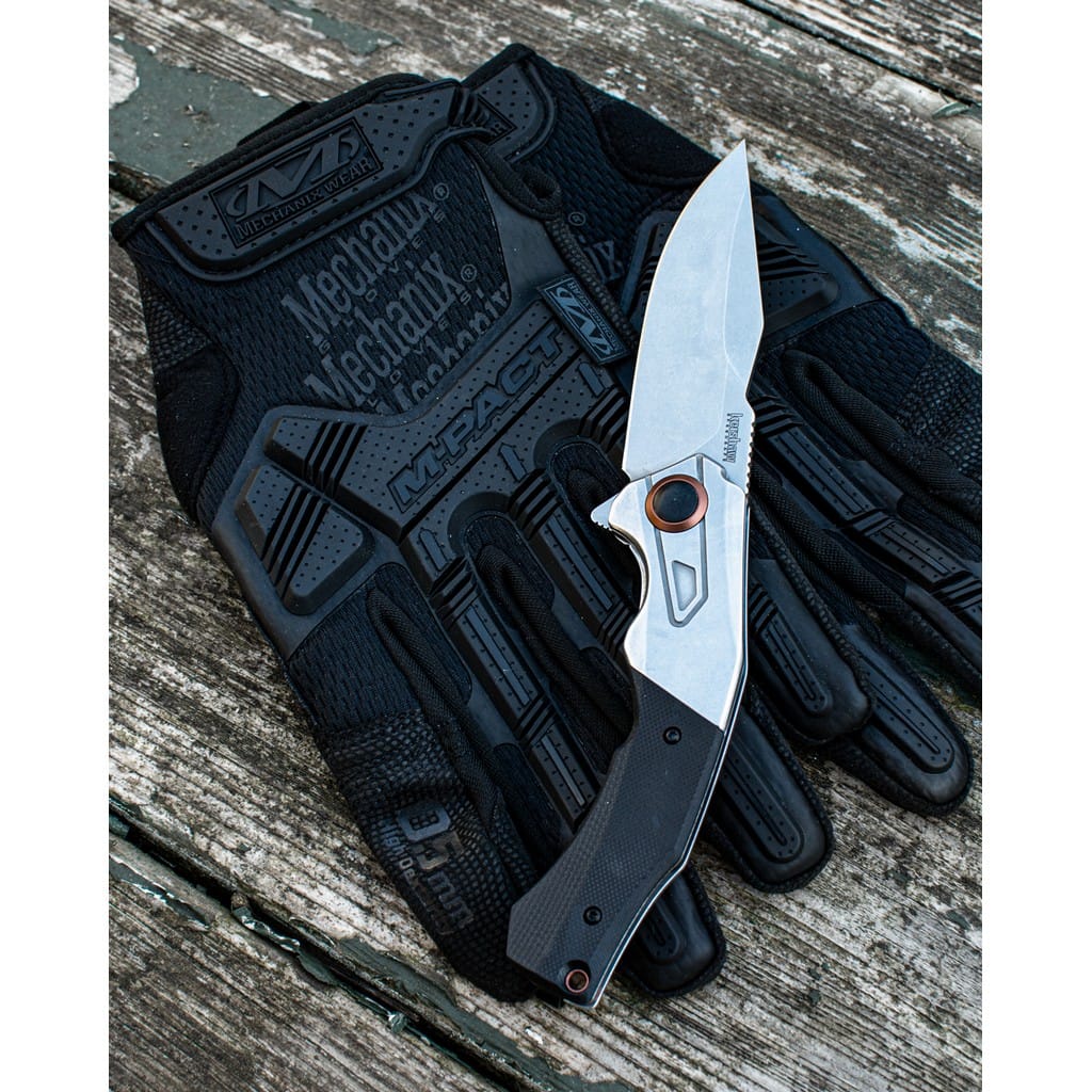 Payout to folder EDC charakteryzujący się bardzo dobrym wykonaniem i eleganckim wyglądem przyciągającym uwagę, który świetnie poradzi sobie z codziennymi zadaniami. Szerokie ostrze o profilu Clip Point wykonano z wysokiej jakości stali nierdzewnej D2 długo utrzymującej ostrość i bardzo wytrzymałej. Wykończenie jej metodą Stonewash pozostawia nieregularną powłokę dobrze maskującą rysy powstające podczas eksploatacji. Szybkie i płynne wysunięcie klingi jedną ręką umożliwia flipper, pełniący jednocześnie funkcję jelca, wspomagany systemem SpeedSafe. Bezpieczeństwo pracy zapewnia solidna blokada Frame Lock oraz karbowany grzbiet głowni stanowiący stabilne podparcie dla kciuka. Rękojeść to połączenie stali z lekkim tworzywem G10 o antypoślizgowej fakturze. Ergonomiczne wyprofilowanie okładzin pozwala na pewne ułożenie dłoni i wysoki komfort pracy. Anodyzowane na miedziany kolor akcenty ozdobne dodają pazura konstrukcji. Całość uzupełnia otwór na linkę oraz dwupozycyjny klips mocujący do głębokiego przenoszenia noża w kieszeni spodni.