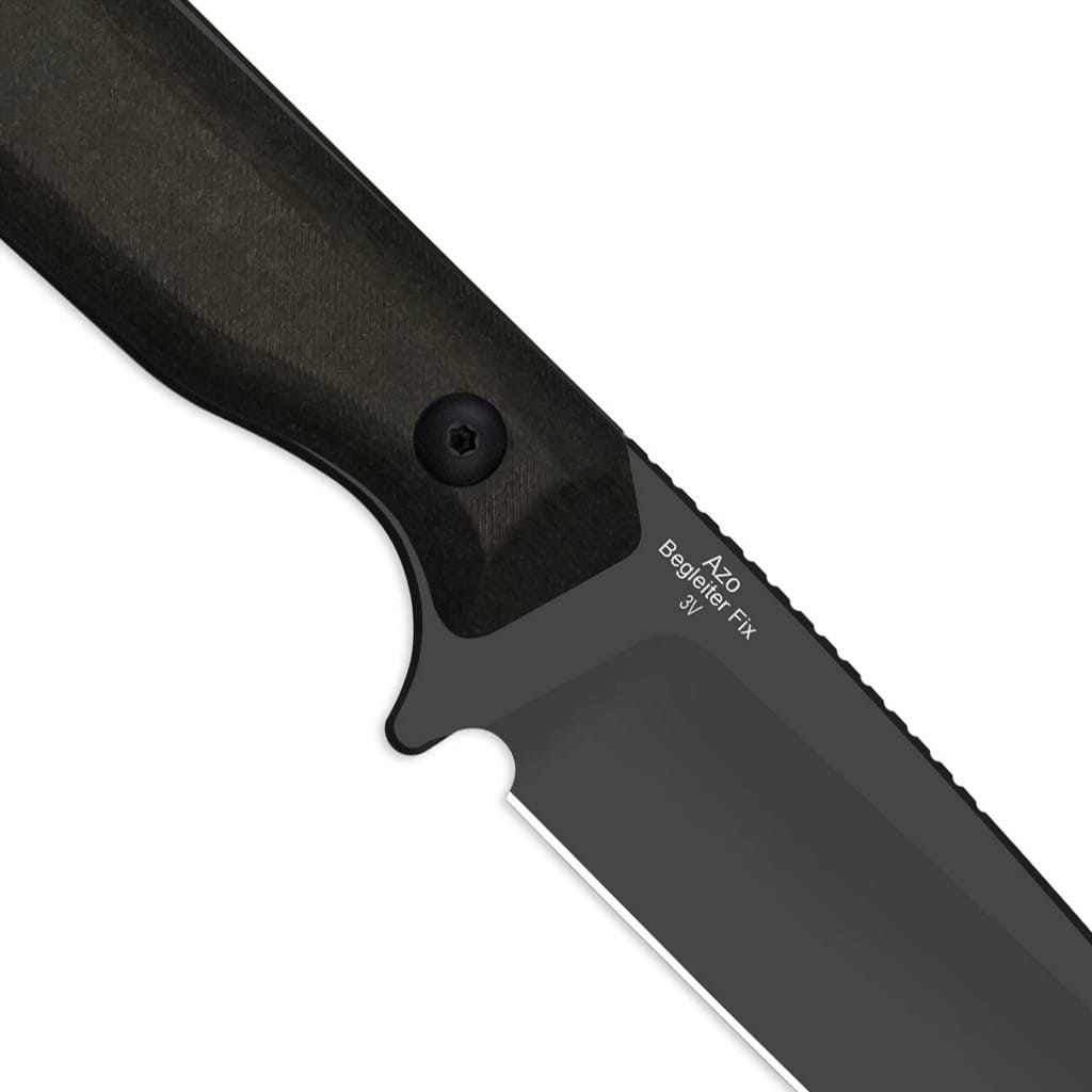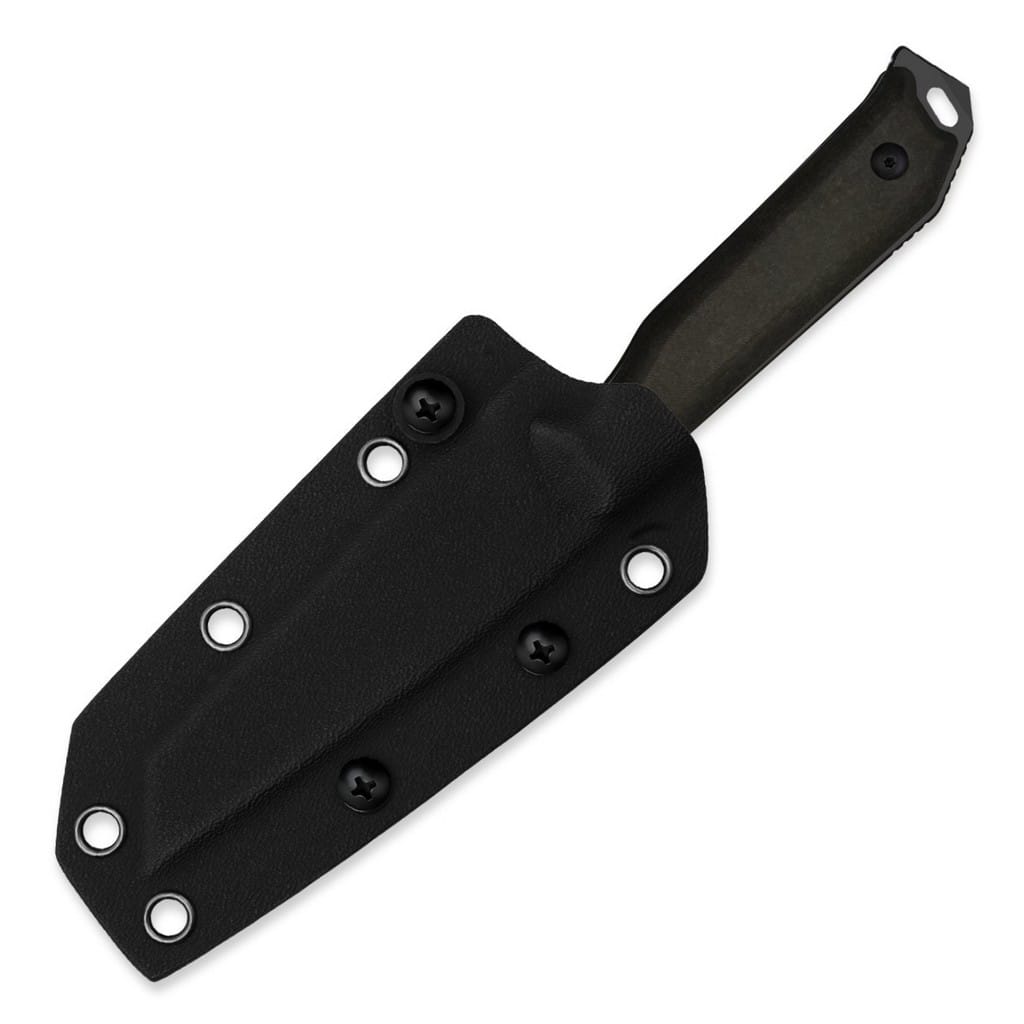 Begleiter Fix to nóż z ostrzem stałym zaprojektowany przez Azo, doświadczonego knifemakera firmy Kizer, znanego z prostych i praktycznych konstrukcji do codziennego użytku. Model doskonale sprawdzi się na świeżym powietrzu do wymagających zadań. Łączy industrialny wygląd z praktyczną formą oferującą wydajność na wysokim poziomie. Głownia o taktycznym profilu Tanto została zrobiona z amerykańskiej stali proszkowej CPM 3V. Niezwykła twardość, odporność na pękanie i wykruszenia oraz bardzo dobre trzymanie ostrości to najważniejsze jej cechy. W celu zabezpieczenia ostrza przed negatywnym działaniem czynników zewnętrznych pokryto je czarną i antyodblaskową powłoką DLC (Diamond Like Carbon) o twardości zbliżonej do diamentu. Narzędzie charakteryzuje się precyzyjnym wklęsłym szlifem, który zapewnia płynne i lekkie cięcie. Bezpieczeństwo pracy wspiera jelec chroniący palce przed ich przypadkowym zsunięciem się na krawędź tnącą i skaleczeniem. Karbowany grzbiet klingi stanowi stabilne wsparcie dla kciuka, co pomaga przy precyzyjnych czynnościach. Nóż o budowie full tang, czyli wykonany z jednego kawałka stali, dostarcza odpowiednią wytrzymałość w terenie. Rękojeść o opływowym kształcie z ciemnobrązowego Richlite, czyli z trwałego i ekologicznego materiału kompozytowego, powstającego z prasowanego papieru poddanego obróbce żywicą fenolową, gwarantuje komfort użytkowania w każdej sytuacji. Na zakończeniu umieszczono otwór umożliwiający przełożenie paracordu i stworzenie oplotu na nadgarstek ułatwiającego chwytanie narzędzia. W zestawie znajduje się pochwa z kydexu wraz z funkcjonalnym mocowaniem typu Tek-Lok, dzięki któremu możemy bezpiecznie transportować nóż na pasku spodni, blisko ciała. Przelotki na krawędziach kabury oferują dodatkowe opcje montażu narzędzia do wyposażenia. Do kompletu dołączono również ściereczkę z mikrofibry, a całość zapakowano w czarne pudełko prezentowe. Firma Kizer współpracuje z projektantami z całego świata i skutecznie przekształca koncepcje w rzeczywistość. Wykorzystuje materiały pochodzące z USA i Japonii, aby dopracowanie każdego egzemplarza było na najwyższym poziomie. Posiada centrum badawczo-rozwojowe, a także linię przemysłową z nowoczesnymi i precyzyjnymi maszynami, które dostarczają funkcjonalność i niezawodność. Nie uznaje dróg na skróty, żadnych kompromisów, a każdy etap produkcji realizuje we właściwy i efektywny sposób.