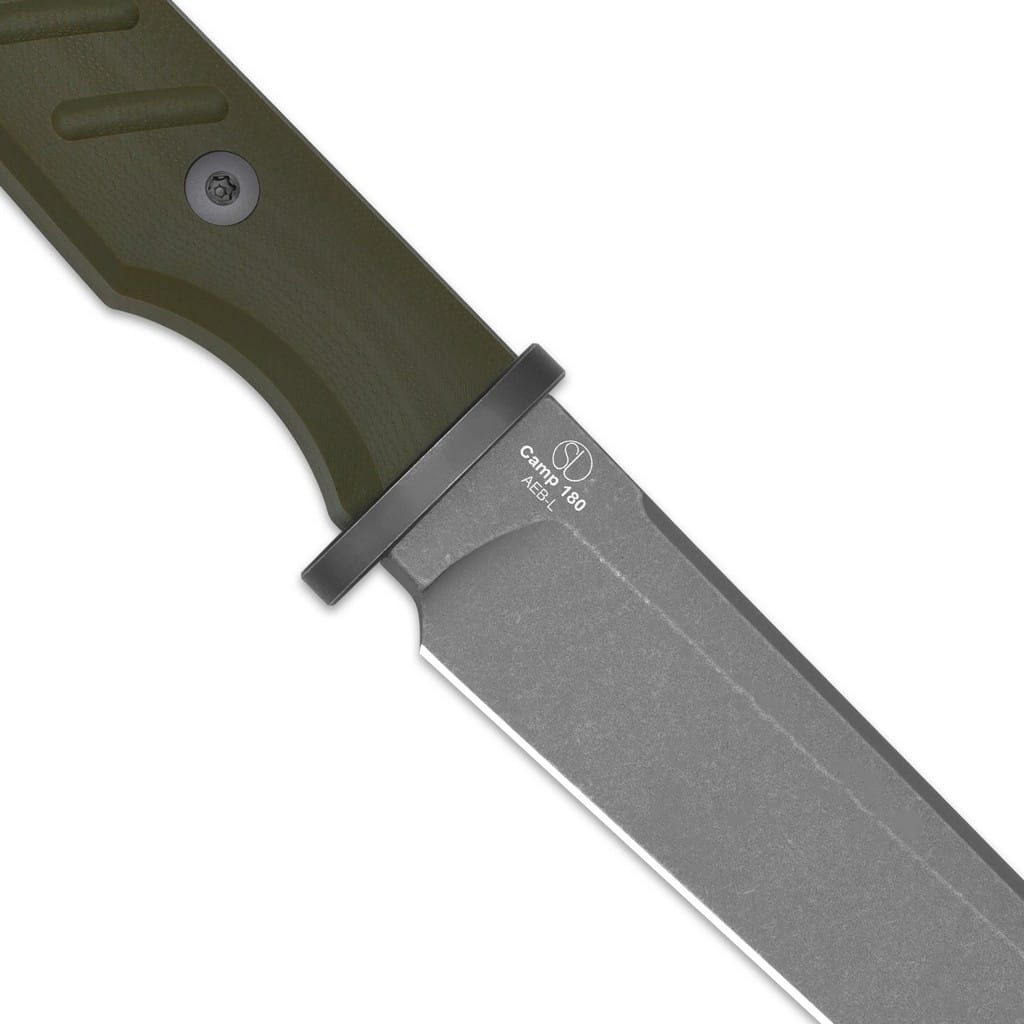 Kizer Camp 180 to duży nóż outdoorowy zaprojektowany przez Jonathan Styles, który aktywnie spędza czas wolny na świeżym powietrzu polując lub łowiąc ryby. Model doskonale sprawdzi się do wymagających zadań na kempingu, wyprawie survivalowej, a także w ręku myśliwego. Długa i smukła głownia o wszechstronnym profilu Drop Point została wykonana z niemieckiej stali nierdzewnej AEB-L odpornej na korozję i łatwej w ostrzeniu. Wykończenie jej na szaro metodą Stonewash pozostawia nieregularną powłokę dobrze maskującą rysy i zadrapania powstające podczas eksploatacji. Narzędzie charakteryzuje się wytrzymałą konstrukcją full tang, co zwiększa jego możliwości w terenie. Bezpieczeństwo pracy wspiera jelec chroniący palce przed ich przypadkowym zsunięciem się na krawędź tnącą i skaleczeniem. Zielona rękojeść z odpornego na warunki atmosferyczne materiału G10 z podłużnymi rowkami gwarantuje dobrą przyczepność do dłoni i pewny chwyt w każdych warunkach. Na zakończeniu umieszczono otwór umożliwiający przełożenie breloka ozdobnego lub paracordu i stworzenie oplotu na nadgarstek. Stalowa głowica w awaryjnej sytuacji może posłużyć jako zbijak do szyb. W zestawie znajduje się pochwa z kydexu wraz z funkcjonalnym mocowaniem typu Tek-Lok, dzięki któremu możemy wygodnie transportować narzędzie na pasku spodni, blisko ciała. Przelotki na krawędziach kabury oferują dodatkowe opcje montażu produktu do wyposażenia. Do kompletu dołączono również linkę i ściereczkę z mikrofibry, a całość zapakowano w czarne pudełko prezentowe. Firma Kizer współpracuje z projektantami z całego świata i skutecznie przekształca koncepcje w rzeczywistość. Wykorzystuje materiały pochodzące z USA i Japonii, aby dopracowanie każdego egzemplarza było na najwyższym poziomie. Posiada centrum badawczo-rozwojowe, a także linię przemysłową z nowoczesnymi i precyzyjnymi maszynami, które dostarczają funkcjonalność i niezawodność. Nie uznaje dróg na skróty, żadnych kompromisów, a każdy etap produkcji realizuje we właściwy i efektywny sposób.