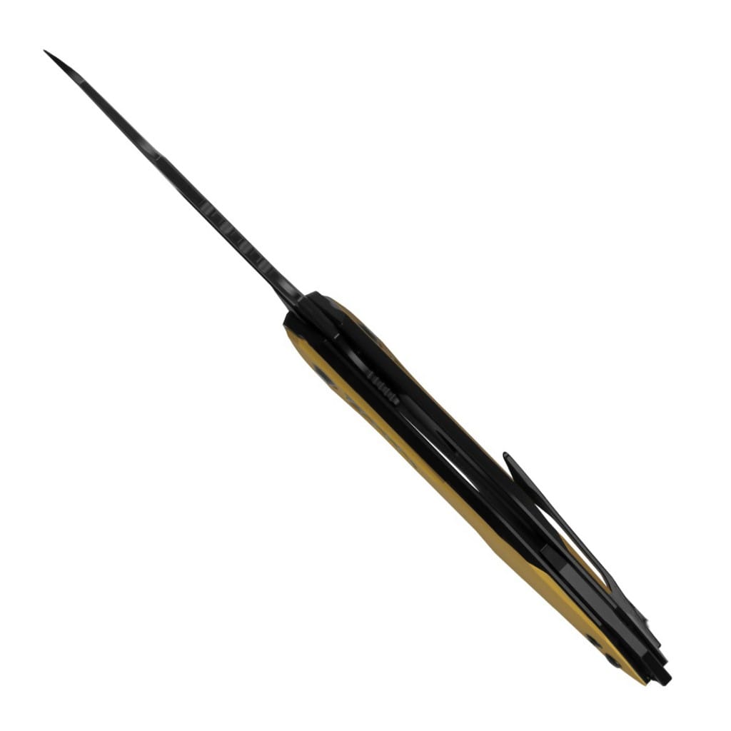 Folder Zero inspirowany trzmielem został zaprojektowany dla firmy Kizer przez polskiego, zdolnego knifemakera Macieja Torbe. Model łączy futurystyczny design z industrialną estetyką, tworząc doskonałe narzędzie do codziennych aktywności w domu i w terenie. Ostrze o charakterystyce Reverse Tanto wykonano z amerykańskiej stali nierdzewnej klasy premium CPM S35VN. Odpowiednio dobrane proporcje wanadu i niobu wpływają na jej twardość, wytrzymałość i odporność na korozję. W celu zabezpieczenia głowni przed negatywnym działaniem czynników zewnętrznych pokryto ją czarną, matową powłoką DLC (Diamond Like Carbon) o twardości zbliżonej do diamentu. Klingę osadzono na ceramicznych łożyskach kulkowych, która przy wykorzystaniu front flippera wysuwa się płynnie i gładko. Prosta obsługa jedną ręką zadowoli zarówno osoby prawo, jak i leworęczne. Bezpieczeństwo pracy zapewnia solidny i niezawodny mechanizm Frame Lock, zaś karbowany grzbiet ostrza stanowi stabilne wsparcie dla kciuka pomagając przy precyzyjnych zadaniach. Ergonomiczna rękojeść oferuje nie tylko atrakcyjny wygląd, ale przede wszystkim gwarantuje pewny i wygodny chwyt w każdej sytuacji. Zrobiono ją z ciemnego tytanu i aluminium anodowanego na żółto, co buduje wyrazisty kontrast. Na zakończeniu umieszczono otwór umożliwiający przełożenie breloka ozdobnego lub paracordu. Konstrukcję uzupełnia klips mocujący pozwalający na wygodne przenoszenie noża w kieszeni spodni lub przy wyposażeniu. W zestawie znajduje się ściereczka z mikrofibry, woreczek transportowy oraz zapasowe śrubki, a całość zapakowano w czarne pudełko prezentowe. Firma Kizer współpracuje z projektantami z całego świata i skutecznie przekształca koncepcje w rzeczywistość. Wykorzystuje materiały pochodzące z USA i Japonii, aby dopasowanie i wykończenie każdego egzemplarza było na najwyższym poziomie. Posiada centrum badawczo-rozwojowe, a także linię przemysłową z zaawansowanymi i precyzyjnymi maszynami dostarczającymi wydajność i niezawodność. Nie uznaje dróg na skróty, żadnych kompromisów, a każdy etap produkcji wykonuje we właściwy i efektywny sposób.