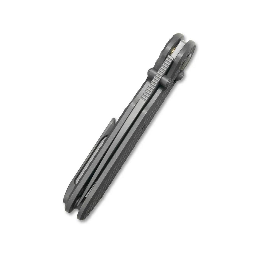 Ethereal Cutter to folder EDC, który zachwyca pod każdym względem, a zwłaszcza kunsztem wykonania, z którego słynie firma Geo Knife. Model, dzięki kompaktowym rozmiarom doskonale sprawdzi się w codziennym użytkowaniu zarówno w domu, jak i podczas aktywności na świeżym powietrzu. Ostrze o profilu Drop Point zostało zrobione z austriackiej stali nierdzewnej klasy premium Bohler M390, charakteryzującej się świetną odpornością na korozję i ścieranie. Odpowiednia kompozycja wanadu, molibdenu i wolframu sprawia, że krawędź tnąca jest ostra przez długi czas. Wykończenie głowni na szaro metodą Darkwash pozostawia nieregularną powłokę dobrze maskującą rysy i zadrapania powstające podczas eksploatacji. Klingę osadzono na podkładkach z brązu, a do jej płynnego rozłożenia służy kołek na ostrzu. Prosta obsługa jedną ręką zadowoli osoby prawo i leworęczne. Karbowanie na grzbiecie głowni stanowi stabilne wsparcie dla kciuka, ułatwiając realizację precyzyjnych zadań. Wysoki poziom bezpieczeństwa zapewnia mechanizm Crossbar Lock w postaci obustronnego bolca na okładzinach i wewnętrznych sprężyn, przypominających literę omega. Ergonomicznie wyprofilowana rękojeść z tytanu pozwala na intuicyjny chwyt w każdej sytuacji. Antypoślizgowa faktura zwiększa przyczepność do dłoni użytkownika, nawet gdy jest mokra lub w rękawicy. Całość dopełnia tytanowy klips mocujący do wygodnego przenoszenia noża blisko ciała. Na uwagę zasługują jeszcze inne detale, jak tytanowe śruby oraz pierścień wokół pivota z naprzemiennych warstw stopu tytanu, tworzących barwny wzór damasceński. W zestawie znajduje się również ściereczka z mikrofibry do czyszczenia narzędzia, a także zapasowe sprężynki do blokady. Producent Geo Knife koncentruje się na projektowany noży składanych z wysokiej jakości materiałów, dobieranych pod kątem ponadczasowej niezawodności. Ich domeną jest precyzja, łatwość konserwacji oraz intuicyjna i prosta obsługa.
