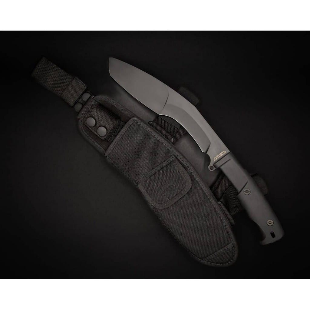 Model KS firmy Extrema Ratio to kompaktowa maczeta łącząca nowoczesny styl z antyczną koncepcją. Zaprojektowana w oparciu o kukri, tradycyjny nóż wojowniczego ludu Ghurków, pochodzących z Nepalu, który wywodzi się ze starożytnych greckich mieczy w kształcie sierpów. Model posiada odpowiednio wyważoną i wytrzymałą konstrukcję, dlatego idealnie sprawdzi się jako narzędzie do wymagających zadań w terenie. Bez problemu przenika przez drewno oraz tnie uporczywą roślinność. Grubą na ponad sześć milimetrów głownię wykonano z austriackiej stali nierdzewnej Bohler N690 charakteryzującej się wysoką odpornością na korozję i długim trzymaniem ostrości. W celu zabezpieczenia jej przed zarysowaniami i negatywnym działaniem czynników zewnętrznych pokryto ją czarną i antyodblaskową powłoką MIL-C-13924. Bezpieczeństwo użytkowania zapewnia jelec chroniący palce przed ich przypadkowym zsunięciem się na krawędź tnącą. Rękojeść z termoplastycznego elastomeru o nazwie Forprene gwarantuje doskonałą ergonomię chwytu świetnie dopasowując się do dłoni, nawet gdy jest ona w rękawicy. Cechuje się niewrażliwością na chemikalia oraz ekstremalne temperatury, co pozwala jej przechodzić rygorystyczne testy NATO. Całość dopełnia otwór umożliwiający zamocowanie linki i stworzenie oplotu na nadgarstek. W zestawie znajduje się wielofunkcyjna pochwa z odpornego na przetarcia nylonu, kompatybilna z systemem Molle. Umożliwia ona wygodne transportowanie maczety w pozycji pionowej przy pasie lub wyposażeniu. Dodatkowo posiada kieszonkę na drobne akcesoria oraz dwie taśmy do mocowania całości do uda. Extrema Ratio to włoska manufaktura z siedzibą w Prato, w regionie Toskanii. Firma od 1997 roku mistrzowsko projektuje niesamowicie mocne noże taktycznie i myśliwskie, które nie mają sobie równych w przemyśle militarnym. Produkcja opiera się jedynie na wysokiej jakości materiałach i najnowocześniejszych technologiach. Co w połączeniu z tradycyjnym rzemiosłem i ręcznym wykończeniem każdego egzemplarza tworzy produkt spełniający najostrzejsze normy wojskowe.
