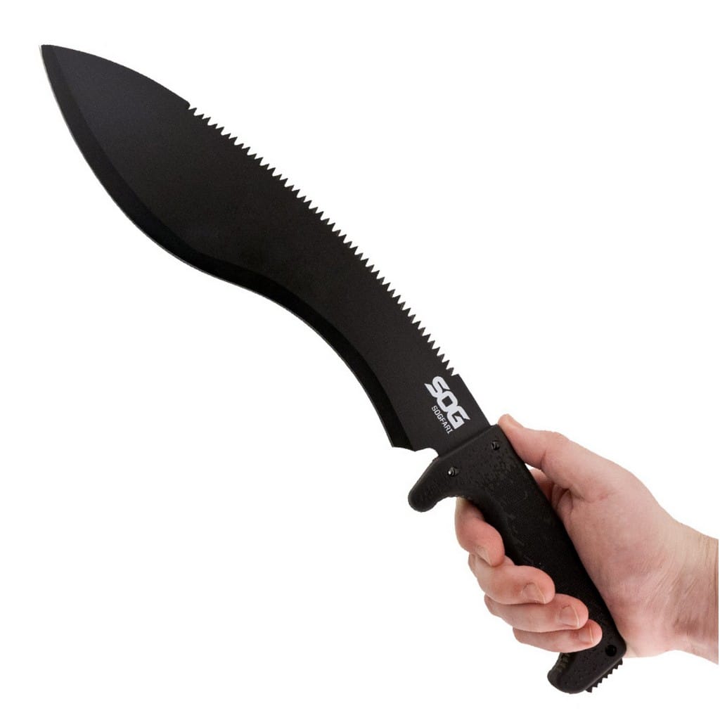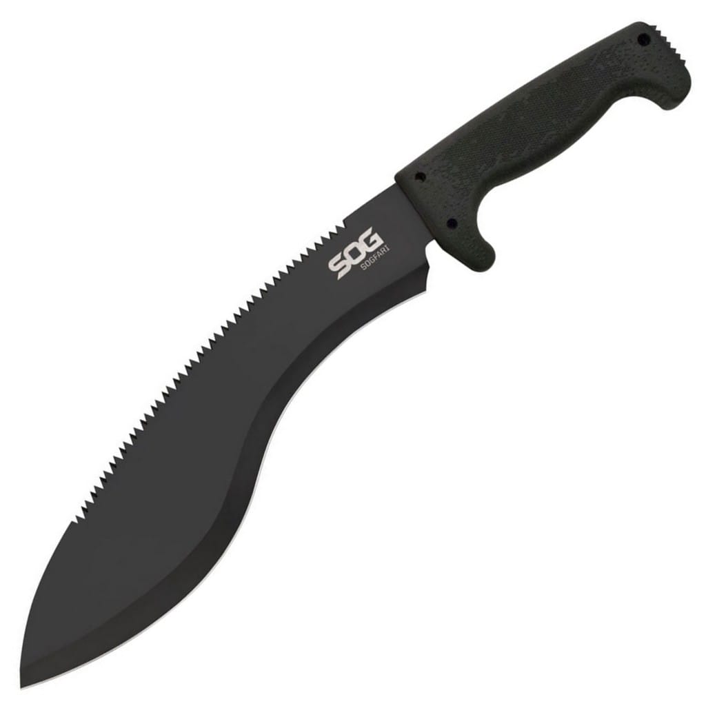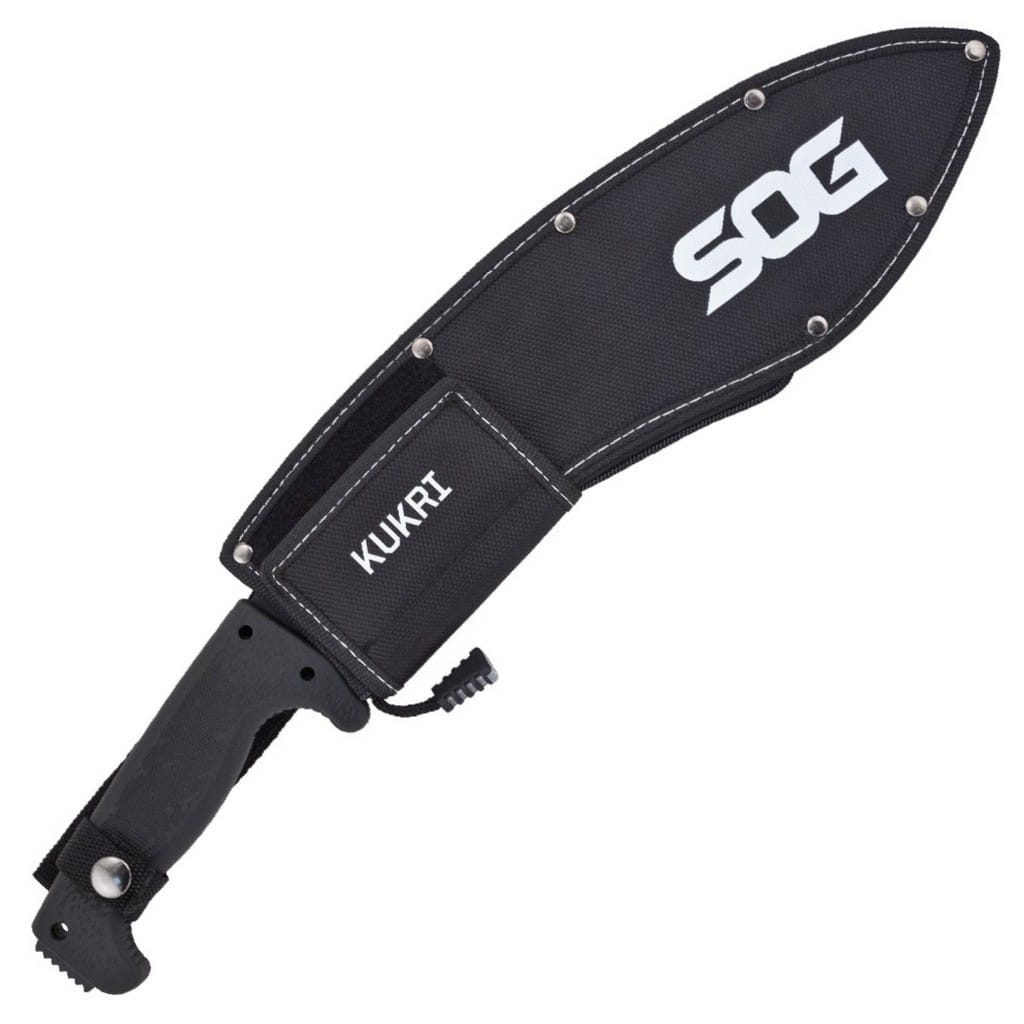 Maczety to jedne z najbardziej użytecznych narzędzi na świecie. Za ich pomocą wycina się chaszcze, przeciera się nowe szlaki, rąbie drewno, tworzy schronienie, zbiera plony, przygotowuje się posiłki, czy chroni własną skórę. Przy projektowaniu maczety Kukri firma SOG poświęciła wiele uwagi aspektom takim jak odpowiednia waga oraz wykonanie rękojeści tak, aby była jak najbardziej komfortowa podczas długotrwałego użytkowania. Ostrze o charakterystyce Drop Point ze stali nierdzewnej 3CR13 pokryto czarną farbą, która zabezpiecza przed korozją oraz odblaskami. Po przeciwnej stronie ostrza maczety znajdują się zęby, dzięki czemu mamy narzędzie, które sprawdzi się jako piła. W końcówce rękojeści wykonanej z Kratonu również umiejscowiono ząbki, które mogą służyć za skrobak. Ponadto chwyt posiada otwory na zamocowanie linki. W komplecie znajduje się nylowy pokrowiec, który pozwala na wygodne transportowanie maczety.