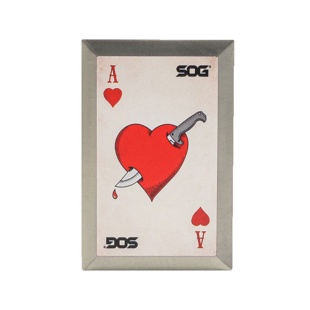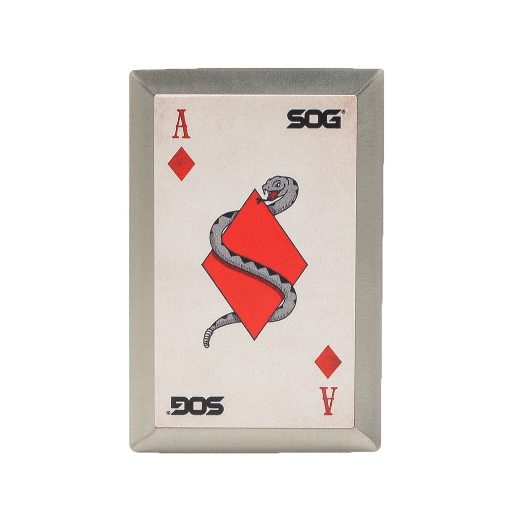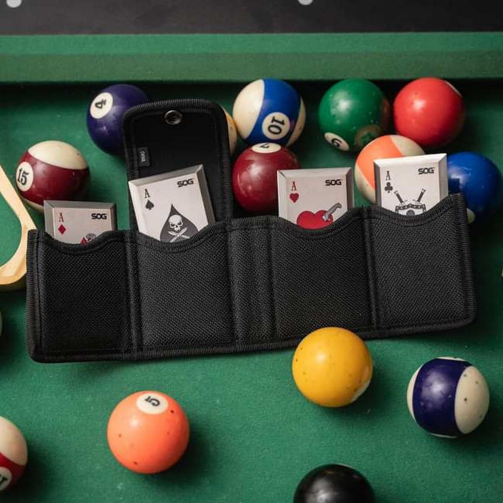 Oryginalny zestaw czterech kart do rzucania od amerykańskiej firmy SOG przenoszący sesje treningowe na wyższy poziom. Rzutki wykonano ze stali nierdzewnej 3Cr zapewniającej wyjątkowe trzymanie ostrości i odporność na zużycie. Dodatkowo każda z nich posiada kolorowy nadruk jak na rzeczywistych kartach do gry. Produkty zostały idealnie wyważone, a krawędzie naostrzone i wyprofilowane, co gwarantuje dobrą skuteczność w trafianiu do celu. Stanowią bardzo dobre uzupełnienie do kolekcji dla wszystkich entuzjastów noży, a ich pomysłowy wygląd zapewnia świetną rozrywkę podczas rzucania do tarczy w terenie lub na strzelnicy. Do kompletu dołączono również nylonową pochwę umożliwiającą bezpieczne i wygodne transportowanie wszystkich egzemplarzy. Niezależnie czy walczysz o tytuł mistrza, czy jedynie chcesz się dobrze bawić, ten zestaw będzie doskonałym wyborem, bo bez względu od sytuacji poczujesz się szczęściarzem.