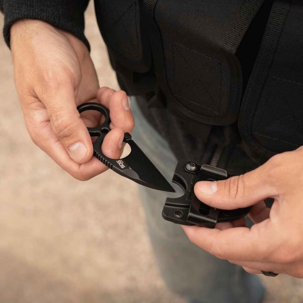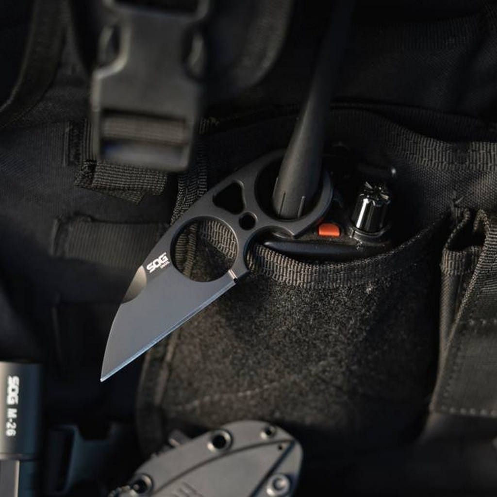 Projektant noży Jason Brous i amerykańska firma SOG połączyli siły i wspólnie stworzyli kompaktowy model o nazwie Snarl. Charakteryzuje się on solidną konstrukcją full tang, funkcjonalnym designem, a także łatwością przenoszenia. Głownię o profilu Wharncliffe, z idealnie prostą krawędzią tnącą, wykonano ze stali nierdzewnej 8Cr14MoV oferującej dobre trzymanie ostrości, odporność na korozję i łatwość ponownego ostrzenia. Całość, w celu zabezpieczenia przed negatywnym działaniem czynników zewnętrznych, pokryto czarną i antyodblaskową powłoką PVD. Bezpieczeństwo użytkowania poprawia karbowany grzbiet narzędzia dający stabilne wsparcie dla kciuka. Dodatkowo dwa duże otwory na palce, na szkieletowej rękojeści, poprawiają komfort chwytu. W zestawie znajduje się pochwa z formowanego tworzywa wyposażona w dwustronny klips mocujący. Dzięki niej możemy swobodnie transportować nóż na pasku spodni, w cholewie buta lub przy wyposażeniu. Dołączony łańcuszek kulkowy pozwala na zawieszenie całości na karku. Snarl to ergonomiczne narzędzie EDC i idealny wybór na zapasowe ostrze, które poradzi sobie z niejednym wyzwaniem dnia codziennego.