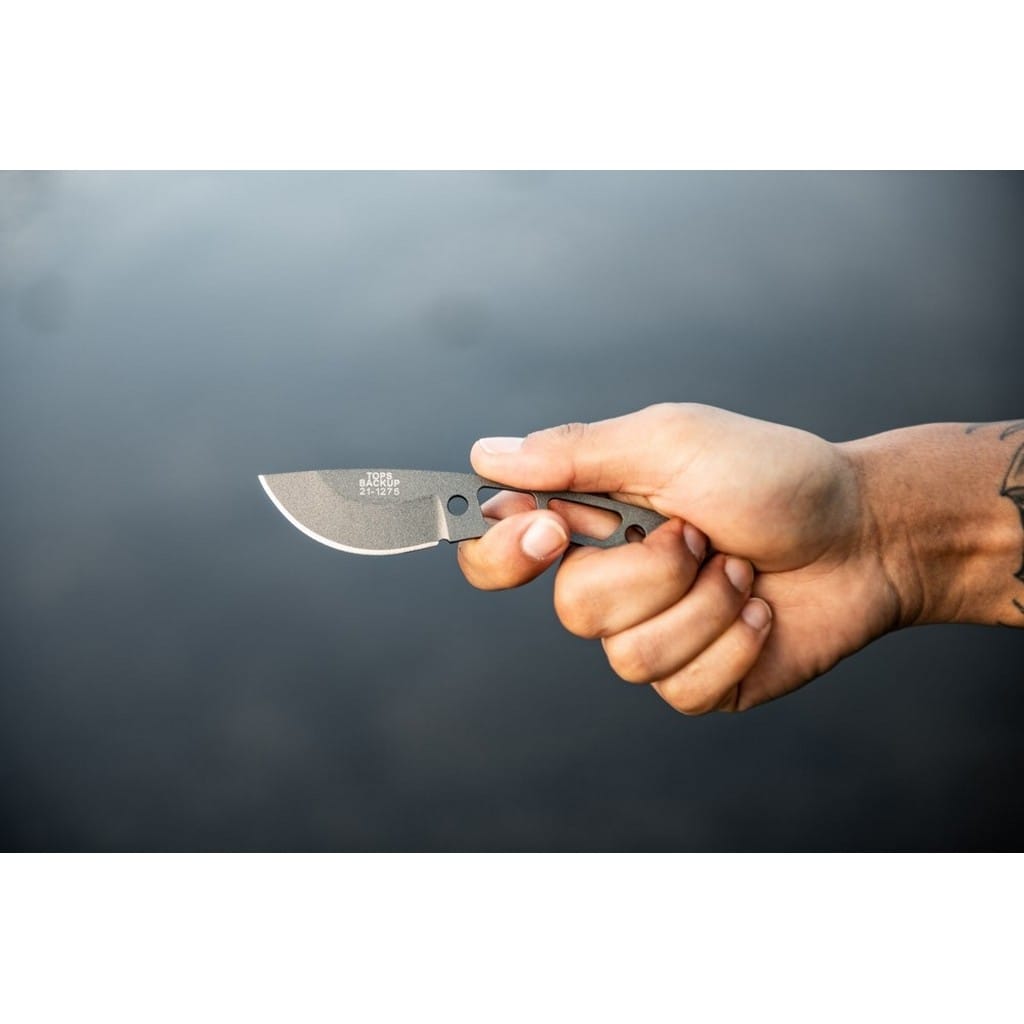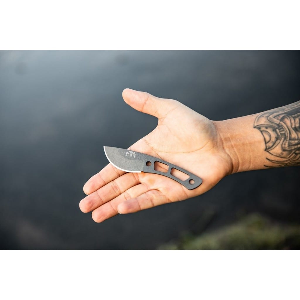 Backup to model, który idealnie sprawdzi się jako zapasowe ostrze do noszenia na co dzień. Jego płaski profil sprawia, że schowany pod koszulą nie zostanie prawie zauważony oraz z łatwością zmieści się nawet w damskiej torebce. Bezpieczne transportowanie narzędzia umożliwia znajdująca się w zestawie pochwa z kydexu. Posiada łańcuszek kulkowy pozwalający na wygodne przenoszenie całości na karku. Został zaprojektowany przez Leo Espinozę, prezesa TOP Knives oraz światowej sławy producenta i projektanta noży, doskonale łączącego funkcjonalność z minimalizmem. Ostrze wykonano ze stali węglowej 1095 odpornej na wykruszenia i pęknięcia oraz niesprawiającej trudności w ostrzeniu. Klingę wykończono matową powłoką Cerakote w szarym kolorze. Jest to ceramiczna i opatentowana formuła na bazie polimerów oferująca odporność na zarysowania, korozję, ciepło i chemikalia. Głownia o uniwersalnym profilu Drop Point bardzo dobrze sprawdzi się do drobnych prac obozowych, zadań EDC, ale również poradzi sobie z małą zwierzyną łowną, rybami, czy ptactwem. Konstrukcja full tang ze szkieletową rękojeścią, dzięki ergonomicznemu wyprofilowaniu świetnie leży w dłoni. Użytkownik dla poprawy komfortu chwytu może owinąć ją linką, wedle potrzeb i indywidualnych preferencji. Dodatkowo na zakończeniu znajduje się otwór na paracord lub brelok ozdobny. Do kompletu dołączono gwizdek survivalowy o mocy 116 decybeli, który z powodzeniem możemy zamocować przy kluczach lub schować do kieszeni. Misją TOPS Knives jest produkowanie noży najwyższej jakości, charakteryzujących się wydajnością i niezawodnością w terenie. Firma współpracuje z projektantami posiadającymi odpowiednie doświadczenie militarne i survivalowe. Ich produkty tworzą osoby z różnych środowisk, żołnierze Navy Seals, Rangersi, instruktorzy sztuk walki, członkowie zespołu SWAT, a nawet indiańscy eksperci od broni. Wszystkie narzędzia są wytwarzane i ręcznie wykańczane w zakładzie w USA, w sercu gór skalistych.