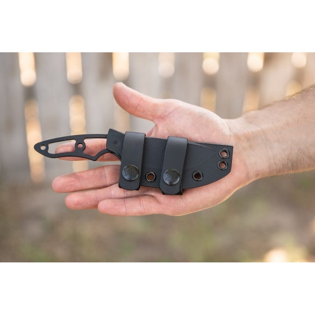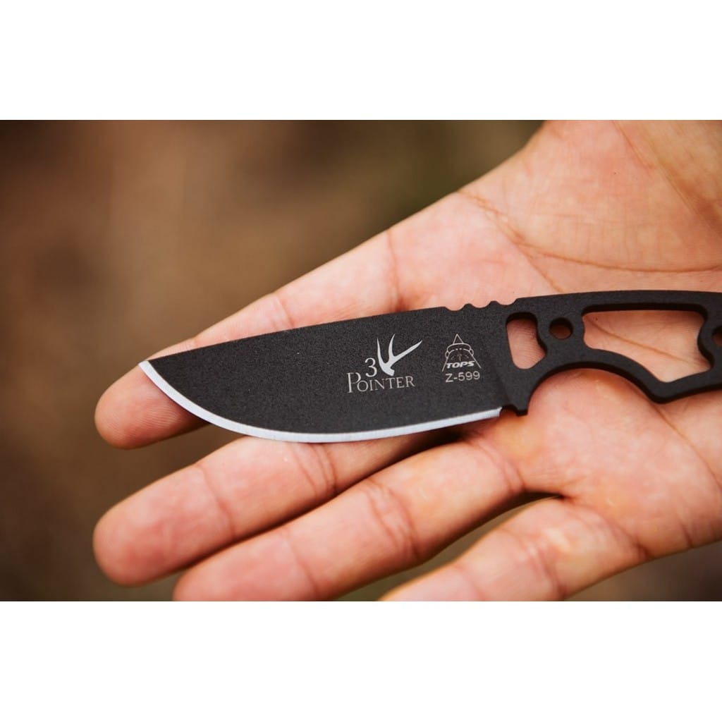 3 Pointer to wspaniały model stworzony przez Leo Espinozę, prezesa TOP Knives oraz światowej sławy producenta i projektanta noży, łączącego funkcjonalność z minimalizmem. Produkt doskonale sprawdzi się jako narzędzie survivalowe, a także podczas polowania, czy wędkowania. Ostrze o uniwersalnym profilu Drop Point, pomimo niewielkiego rozmiaru, oprócz codziennych czynności poradzi sobie także w terenie z małą zwierzyną łowną, rybami oraz ptactwem. Nóż jest wygodny i lekki w transportowaniu, co ułatwia znajdująca się w zestawie pochwa z kydexu wraz z dwoma paskami mocującymi. Dzięki nim możemy przytroczyć narzędzie do paska lub wyposażenia i bezpiecznie przenosić blisko ciała. Producent pomyślał również o innej opcji, dołączając do kompletu łańcuszek kulkowy, dzięki któremu całość zawiesimy na szyi. Głownia została wykonana ze stali węglowej 1095 odpornej na wykruszenia i pęknięcia oraz niesprawiającej trudności w ostrzeniu. Pokryto ją powłoką Black Traction, jest to zastrzeżona nazwa wykończenia stosowana przez TOPS, składająca się z hybrydowej bazy epoksydowej, z dodatkiem poliestru. Nakłada się ją proszkowo na klingę i zapieka w piecu w temperaturze około 210 stopni Celsjusza przez kilkanaście minut. Karbowana górna krawędź ostrza stanowi stabilne podparcie dla kciuka, co zwiększa bezpieczeństwo podczas pracy. Konstrukcja full tang ze szkieletową rękojeścią, dzięki ergonomicznemu wyprofilowaniu dobrze układa się w dłoni. Użytkownik dla poprawy komfortu chwytu może owinąć ją linką, wedle indywidualnych preferencji. Na zakończeniu znajduje się otwór umożliwiający przełożenie kawałka paracordu i stworzenie oplotu na nadgarstek. Dodatkowo do zestawu dołączono gwizdek survivalowy o mocy 116 decybeli, który z powodzeniem możemy zamocować przy kluczach w formie breloka lub schować w kieszeni. Misją TOPS Knives jest produkowanie noży najwyższej jakości, charakteryzujących się wydajnością i niezawodnością w terenie. Firma współpracuje z projektantami posiadającymi odpowiednie doświadczenie militarne i survivalowe. Ich produkty tworzą osoby z różnych środowisk, żołnierze Navy Seals, Rangersi, instruktorzy sztuk walki, członkowie zespołu SWAT, a nawet indiańscy eksperci od broni. Wszystkie narzędzia są wytwarzane i ręcznie wykańczane w zakładzie w USA, w sercu gór skalistych.