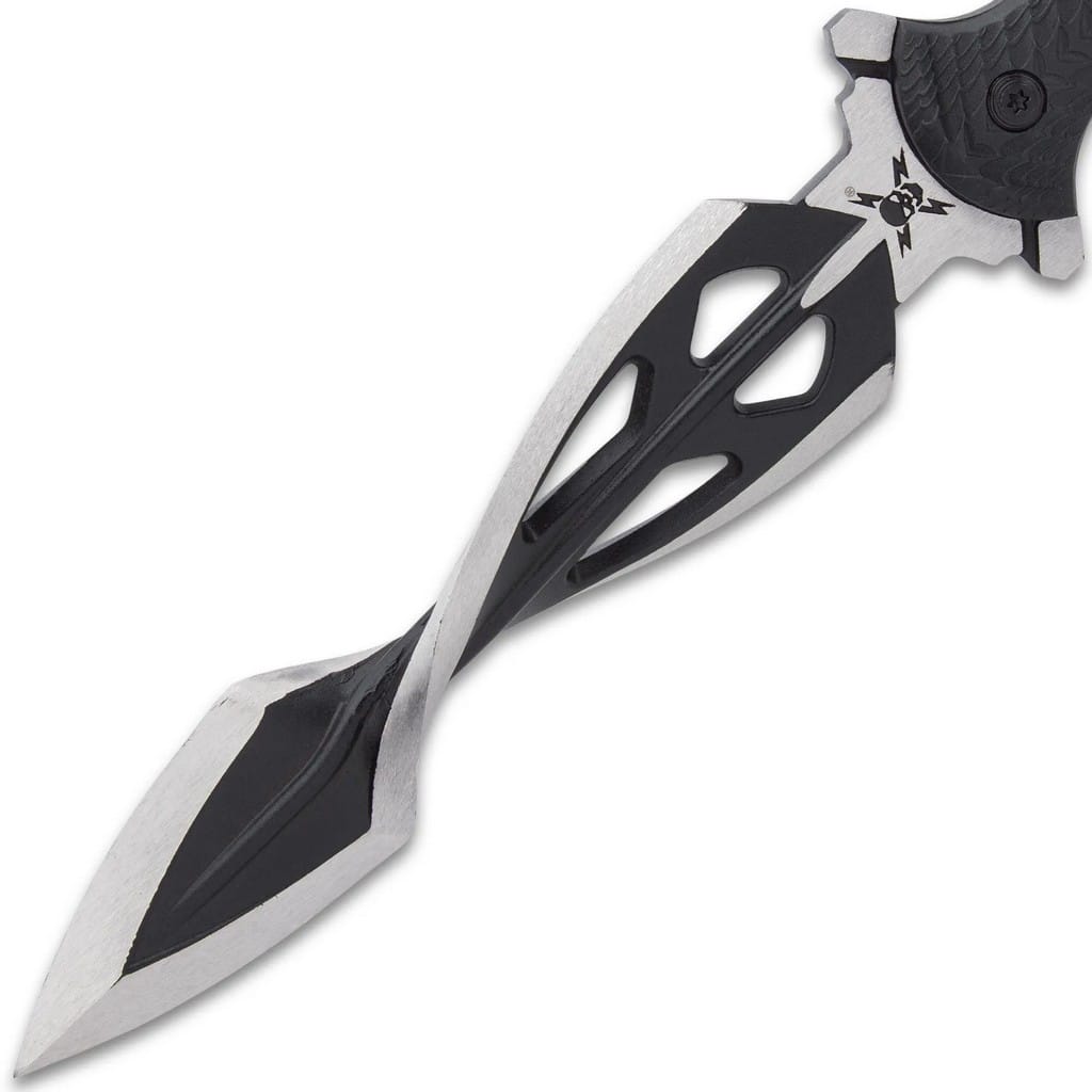 Tsunami należący do serii M48 firmy United Cutlery to kolejny geniusz projektowy tuż obok modelu Cyclone. Nóż posiada opatentowane przez producenta ostrze stworzone do przekłuwania i  przebijania się przez różnego rodzaju materiały i tekstury. Zapewnia dogłębną penetrację prowadzącą do maksymalnych obrażeń powierzchni, przez którą przenika. Narzędzie cechuje się konstrukcją full tang, czyli zostało zrobione z jednego kawałka stali nierdzewnej 2Cr13, co zwiększa wytrzymałość konstrukcji, a jej wagę redukują otwory na klindze. Spiralnie skręcona głownia typu Dagger charakteryzuje się dwutonowym wykończeniem przez co zyskuje drapieżny wygląd. Rękojeść z nylonu wzmocnionego włóknem szklanym o antypoślizgowej fakturze zwiększa przyczepność do dłoni. Bezpieczeństwo użytkowania zapewnia obustronny, stalowy jelec chroniący przed przypadkowym zsunięciem się ręki na krawędź tnącą. Na zakończeniu uchwytu znajduje się otwór na linkę do zamocowania kawałka paracordu i stworzenia oplotu na nadgarstek. Całość dopełnia pochwa z tworzywa TPR umożliwiająca wygodne transportowanie noża przy pasie.