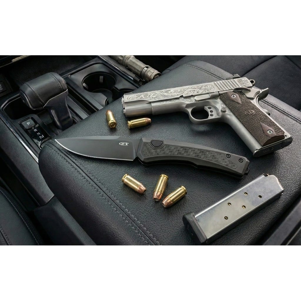 Model 0556 to automatyczny nóż dżentelmeński o smukłym profilu i wysublimowanym designie. Całkowicie czarna wersja stanowi świetną propozycję dla miłośników koloru, który nigdy nie wychodzi z mody, łączącego taktyczny styl z subtelną elegancją. Zaprojektowany przez firmę Zero Tolerance dla użytkowników poszukujących lekkiego, lecz pełnowymiarowego foldera, zrobionego z najwyższej jakości materiałów. Posiada indywidualny numer seryjny, tak jak pozostałe egzemplarze z oferty producenta. Jest to idealna propozycja dla kolekcjonerów ceniących niezawodność i szybkość działania. Ostrze o profilu Drop Point wykonano z amerykańskiej stali proszkowej klasy premium CPM MagnaCut zapewniającej doskonałą równowagę pomiędzy ostrością, wytrzymałością i odpornością na korozję. W celu zabezpieczenia głowni przed negatywnym działaniem czynników zewnętrznych pokryto ją czarną i antyodblaskową powłoką PVD. Karbowany grzbiet klingi daje stabilne wsparcie dla kciuka, co stabilizuje chwyt i pomaga przy precyzyjnych zadaniach. Model rozkłada się w ułamku sekundy, wystarczy nacisnąć stylowy przycisk w kształcie trapezu. Jego karbowana faktura poprawia przyczepność do palca gwarantując bezproblemowe użycie, nawet gdy dłoń jest wilgotna lub w rękawicy. Za bezpieczeństwo odpowiada blokada Button Lock chroniąca przed przypadkowym złożeniem się narzędzia podczas pracy. Tytanową rękojeść wzbogacono o wkładki z eleganckiego włókna węglowego, które dodają charakteru całości. Konstrukcję uzupełnia dwupozycyjny klips mocujący do dyskretnego przenoszenia noża w kieszeni spodni.