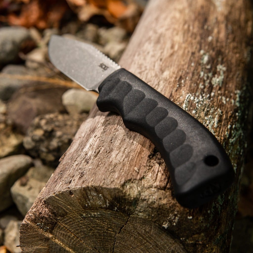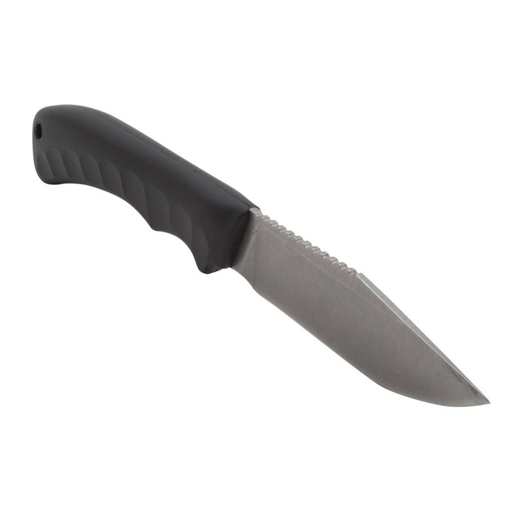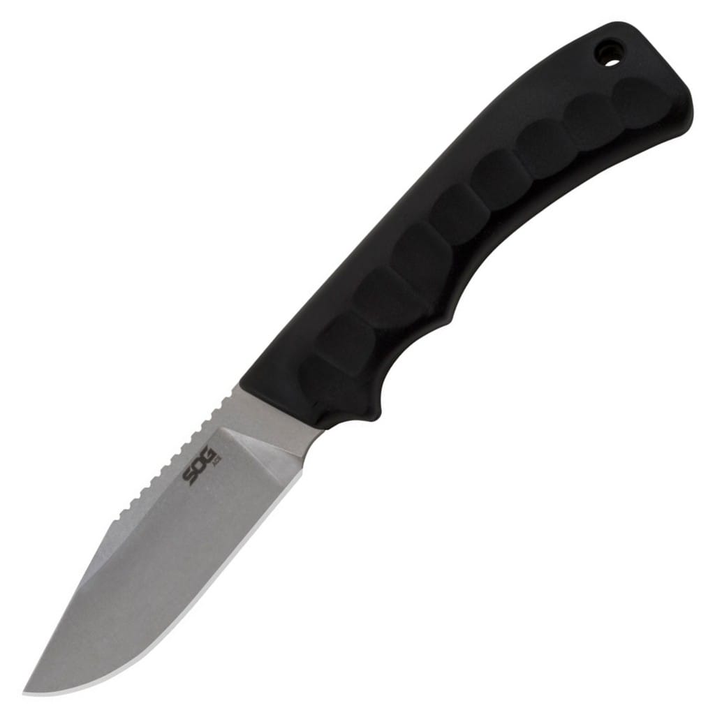 Ace firmy SOG to wygodny i niezawodny model noża z ostrzem stałym w przystępnej cenie. Głownia Clip Point wykonana ze stali nierdzewnej 7Cr17MoV została wykończona metodą stonewash, która tworzy nieregularną powłokę dobrze maskującą rysy powstające podczas eksploatacji. Rękojeść z tworzywa zapewnia wysoki komfort pracy i odpowiednią przyczepność do dłoni dzięki odpowiedniemu jej wyprofilowaniu. Na zakończeniu znajduje się otwór na linkę zabezpieczającą przed zgubieniem. Karbowana górna krawędź klingi stanowi doskonałe oparcie dla palca zwiększając jednocześnie bezpieczeństwo uzytkowania. W zestawie znajduje się pochwa z plastiku wyposażona w klips mocujący, który pozwala na jej doczepienie do paska lub wyposażenia. Dodatkowo specjalna budowa pokrowca umożliwia cięcie lin oraz taśm bez konieczności wyciągania noża z pochwy. Ace idealnie sprawdzi się w wielu zadaniach polowych i terenowych, a jego nieduża waga z pewnością nie obciąży znacznie naszego bagażu.