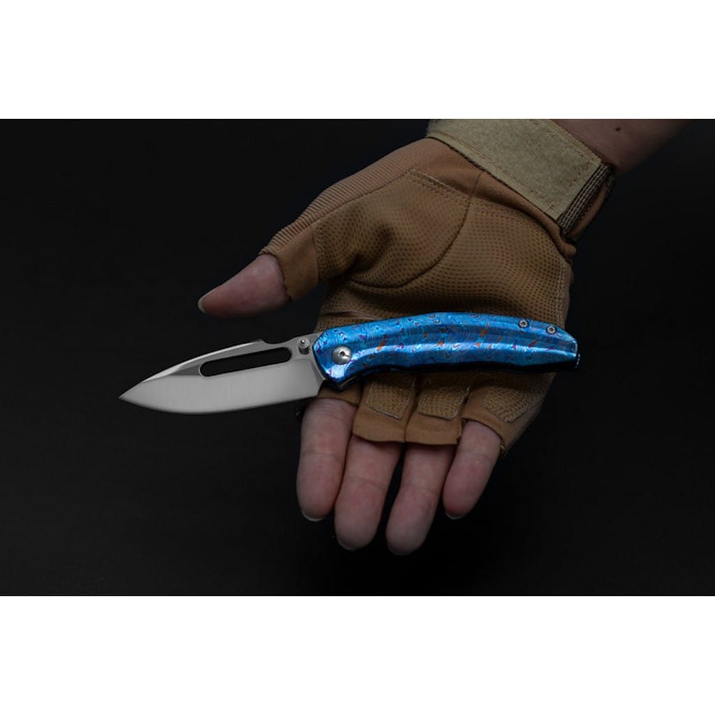 Boa firmy Artisan Cutlery to kolekcjonerski nóż składany o nowoczesnym i intrygującym designie, który przekonuje jakością materiałów, a także precyzją wykonania. Model stanowi doskonale uzupełnienie jako elegancki dodatek do garderoby na formalnych spotkaniach i nie tylko. Ostrze o profilu Drop Point zostało zrobione z amerykańskiej stali nierdzewnej klasy premium CPM S90V bogatej w duże ilości wanadu, dzięki czemu charakteryzuje się niesamowitą odporność na ścieranie. Wykończenie jej metodą Sand Polish pozostawia drobne ryski lekko matujące powierzchnię, co daje efekt niedokładnego wypolerowania. Klingę osadzono na ceramicznych łożyskach kulkowych, która przy wykorzystaniu otworu, obustronnego kołka lub front flippera wysuwa się płynnie i gładko. Prosta obsługa jedną ręką zadowoli zarówno osoby prawo jaki i leworęczne. Bezpieczeństwo zapewnia solidna i niezawodna blokada Frame Lock. Rękojeść z innowacyjnego materiału Timascus, który powstaje z dwóch lub więcej stopów tytanu, ma ekskluzywny wygląd damastu. Ergonomiczne wyprofilowanie chwytu gwarantuje świetne dopasowanie do dłoni użytkownika, co przekłada się na komfort pracy. Na zakończeniu umieszczono ukryty otwór umożliwiający przełożenie breloka ozdobnego lub paracordu i stworzenie oplotu na nadgarstek. Konstrukcję uzupełnia tytanowy klips mocujący, pozwalający na dyskretne przenoszenie noża w kieszeni spodni. W zestawie znajduje się ściereczka z mikrofibry oraz pokrowiec z miękkim wnętrzem i zamykaniem na suwak do wygodnego przechowywania i transportowania foldera, a całość zapakowano w białe pudełko prezentowe. Artisan Cutlery to firma tworząca estetyczne i innowacyjne noże, przy jednoczesnym zachowaniu metod tradycyjnego rzemiosła i dbałości o szczegóły. Posiada zespół specjalistów z bogatym i długoletnim doświadczeniem w branży, co przekłada się na niezawodność i wydajność na najwyższym poziomie.