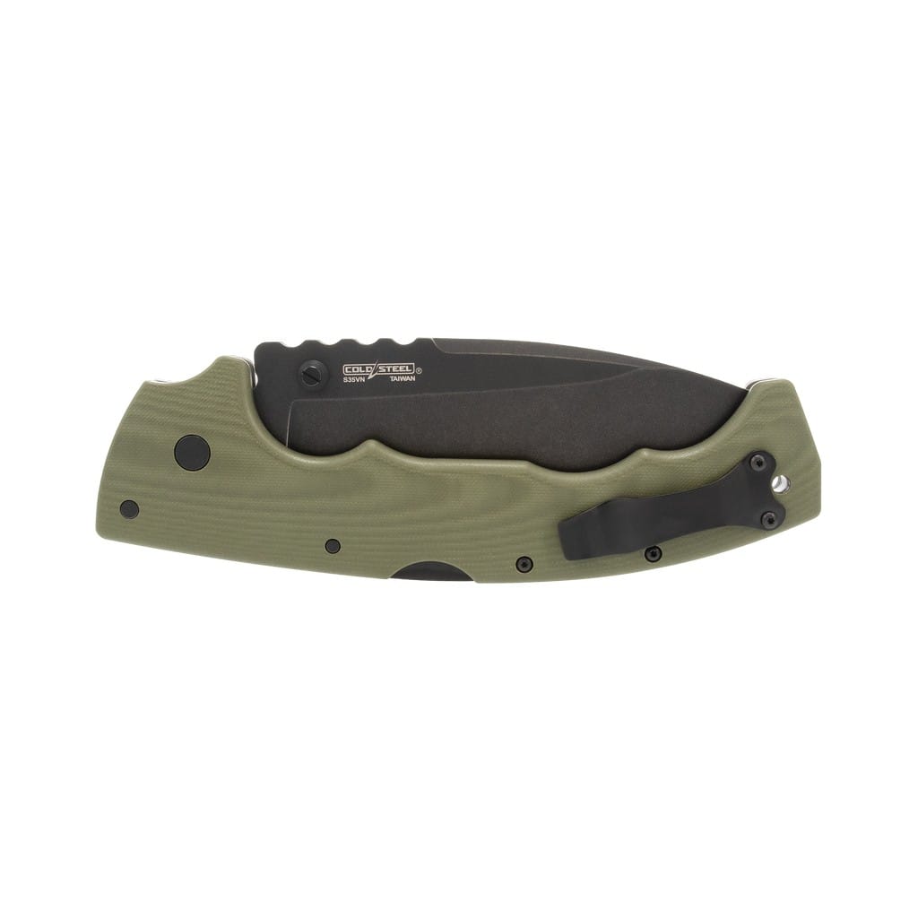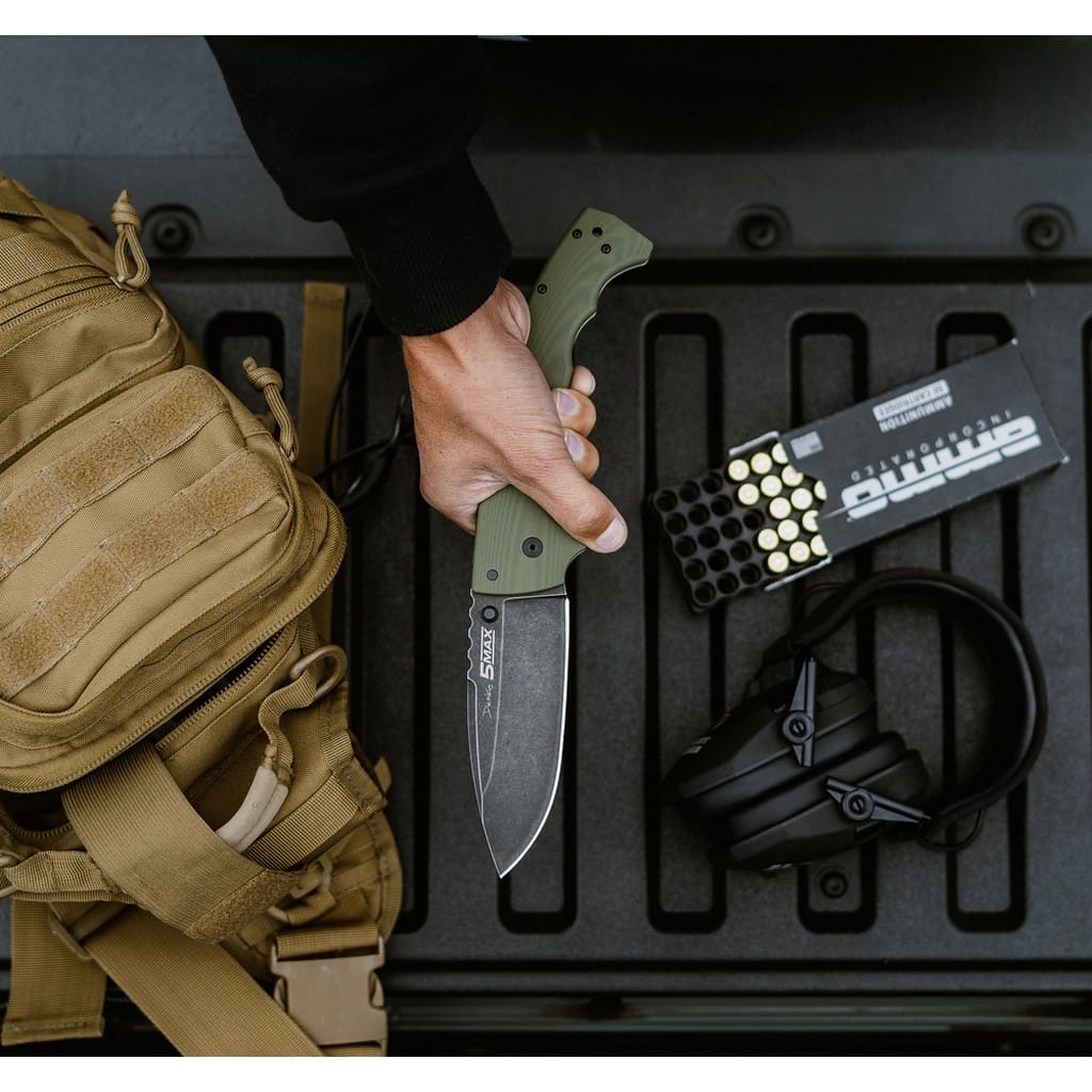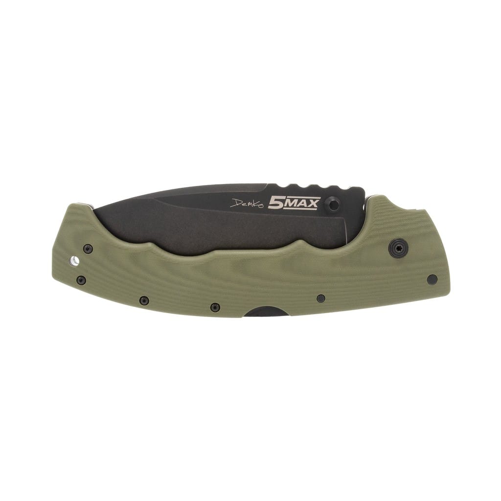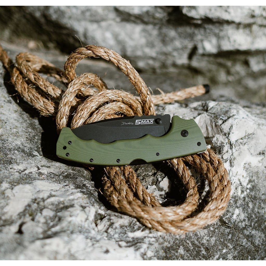 5-Max to projekt oparty na najlepiej sprzedającym się w firmie Cold Steel modelu 4 Max. Folder FL-50MAX stanowi jego większy i bogatszy odpowiednik, skierowany do najbardziej wymagających kolekcjonerów i poszukiwaczy przygód. Nóż ze względu na swoje pokaźne rozmiary świetnie sprawdzi się do aktywności na świeżym powietrzu, w roli narzędzia survivalowego. Ostrze o uniwersalnym profilu Drop Point wykonano z amerykańskiej stali nierdzewnej klasy premium CPM S35VN. Odpowiednio dobrane proporcje wanadu i niobu wpływają na jej twardość, wytrzymałość, odporność na korozję i długie trzymanie ostrości. Wykończenie klingi na czarno metodą Stonewash pozostawia nieregularną powłokę dobrze maskującą rysy i zadrapania powstające podczas eksploatacji. Sprawne i płynne rozłożenie narzędzia jedną ręką umożliwia obustronny kołek na głowni o antypoślizgowej fakturze. Zastosowany opatentowany mechanizm Tri-Ad Lock, zaprojektowany przez Andrew Demko, to niezawodna oraz jedna z najbardziej innowacyjnych i najsilniejszych blokad dostępnych na rynku. Rękojeść zrobiono z odpornego na warunki atmosferyczne materiału G10 w zielonym kolorze. Ergonomiczne wyprofilowanie okładzin pozwala na intuicyjne ułożenie dłoni, co gwarantuje pewny chwyt nawet w mokrej dłoni. Na zakończeniu umieszczono otwór umożliwiający przełożenie breloka ozdobnego lub paracordu. Konstrukcję uzupełnia dwupozycyjny klips mocujący, pozwalający na wygodne przenoszenie noża w kieszeni spodni lub przy wyposażeniu. 5-Max to wszechstronne narzędzie do zadań terenowych, które sprosta każdemu wyzwaniu, dzięki imponująco wytrzymałej i solidnej budowie.