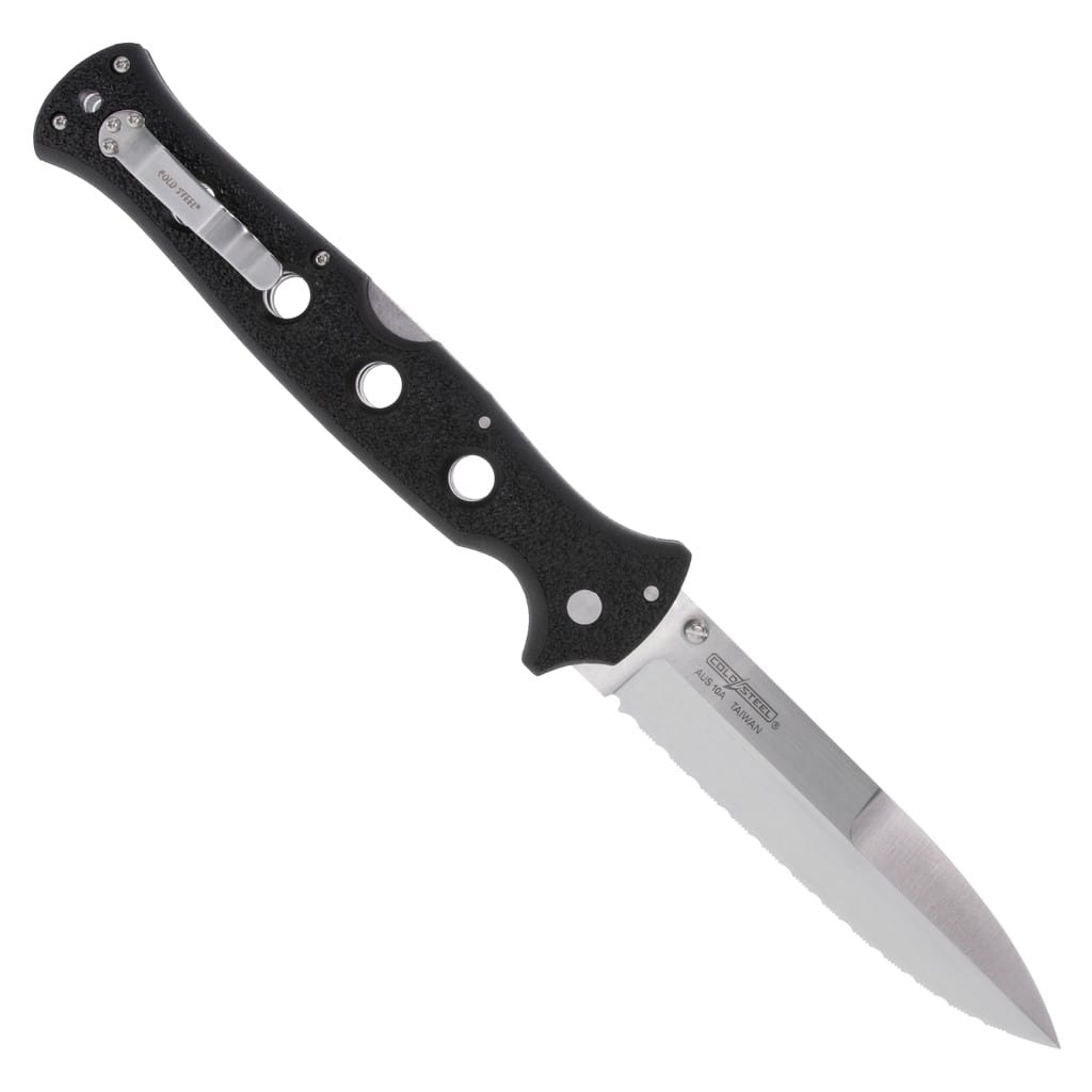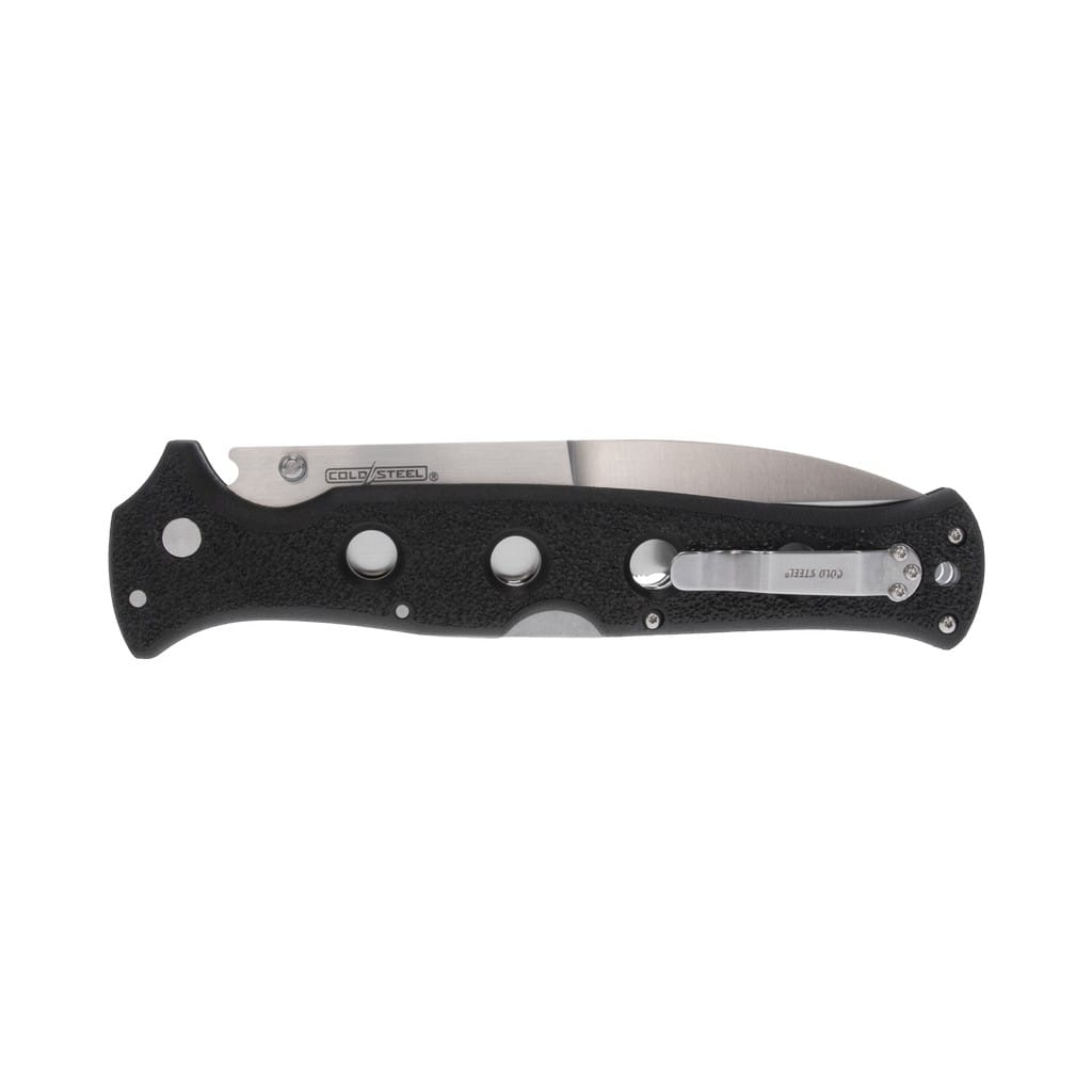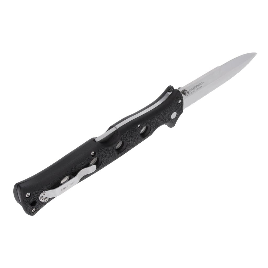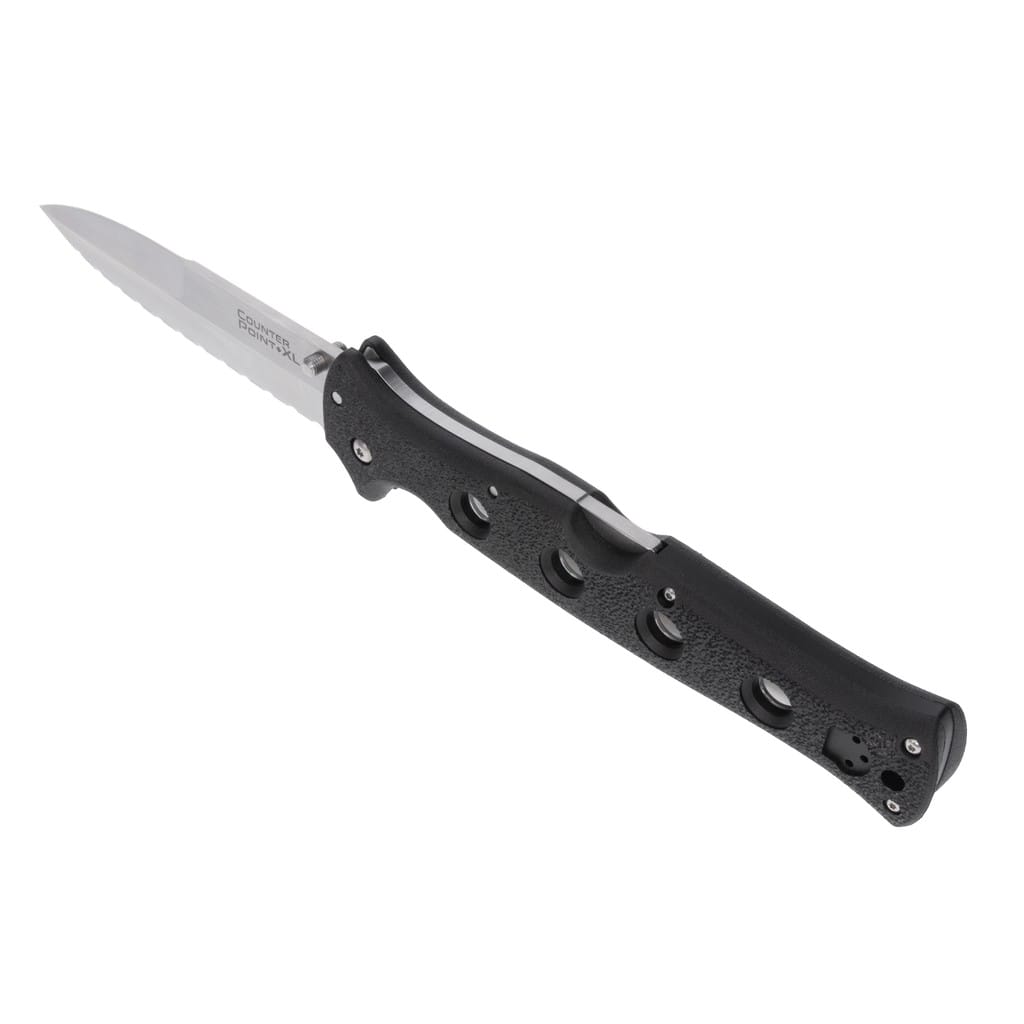 Counter Point XL amerykańskiej firmy Cold Steel to nóż składany, stworzony dla użytkowników poszukujących naprawdę dużego i masywnego foldera do codziennej pracy. Ostrze o profilu Spear Point zostało zrobione z japońskiej stali nierdzewnej AUS10A charakteryzującej się doskonałą wytrzymałością, odpornością na korozję, dobrym trzymaniem ostrości oraz łatwością ponownego ostrzenia. Wykończenie jej metodą Satin pozostawia drobne ryski lekko matujące powierzchnię, co daje efekt niedokładnego wypolerowania. Ząbkowana krawędź tnąca pozwala na skuteczne cięcie twardych lin, taśm oraz innych włóknistych materiałów, z którymi gładka klinga nie dałaby sobie rady. Obustronny kołek na głowni umożliwia sprawne rozłożenie narzędzia jedna ręką zarówno przez osoby prawo, jak i leworęczne. Opatentowany mechanizm Tri-Ad Lock, zaprojektowany dla firmy Cold Steel przez Andrew Demko, to niezawodna oraz jedna z najbardziej innowacyjnych i najsilniejszych blokad dostępnych na rynku. Dzięki niej możemy czuć się bezpiecznie w każdej sytuacji, bez względu od stopnia zaawansowania zadania, które planujemy wykonać. Rękojeść z trwałego kompozytu szklano-nylonowego o nazwie Griv-Ex wzmocniono aluminiowymi linersami, poddanymi obróbce cieplnej dla zwiększenia wytrzymałości chwytu. Wyprofilowanie pod palec oraz delikatnie chropowata faktura dodatkowo poprawiają przyczepność do dłoni i podnoszą komfort użytkowania. Na zakończeniu umieszczono otwór na linkę do przytroczenia breloka ozdobnego lub paracordu. Konstrukcję uzupełnia dwupozycyjny klips mocujący do wygodnego przenoszenie noża w kieszeni spodni lub przy wyposażeniu.