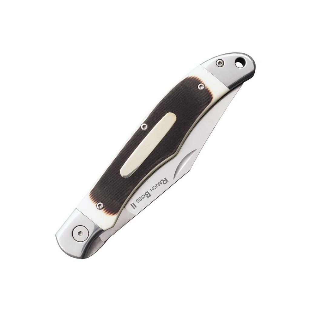Nikt nie pracuje ciężej niż farmer czy rolnik, a ich otoczenie wymaga odpowiedniego noża składanego. Ranch Boss II zaprojektowany przez firmę Cold Steel to model, który poradzi sobie w każdym środowisku i sprosta wyzwaniom jakie napotka na swojej drodze. Prosty i klasyczny wygląd oraz wykonanie z trwałych materiałów to tylko niektóre z jego zalet. Ostre jak brzytwa, długie ostrze o uniwersalnym profilu Clip Point ze stali węglowej SK-5 charakteryzuje się wytrzymałością mechaniczną oraz dobrym trzymaniem ostrości i łatwością ostrzenia. Wgłębienie na paznokieć pozwala sprawnie rozłożyć klingę jedną ręką. Nad bezpieczeństwem użytkownika gdy narzędzie jest w użyciu czuwają dwie blokady, Liner Lock oraz Slip Joint, co zapewnia podwójną ochronę przed przypadkowym złożeniem się noża podczas pracy. Rękojeść z tworzywa sztucznego doskonale imituje kość, a dzięki nacięciom pewnie leży w dłoni i gwarantuje dobrą przyczepność. Konstrukcję uzupełnia otwór na linkę, zaś do wygodnego transportowania foldera producent dołączył do zestawu skórzany pokrowiec z mocowaniem do paska.
