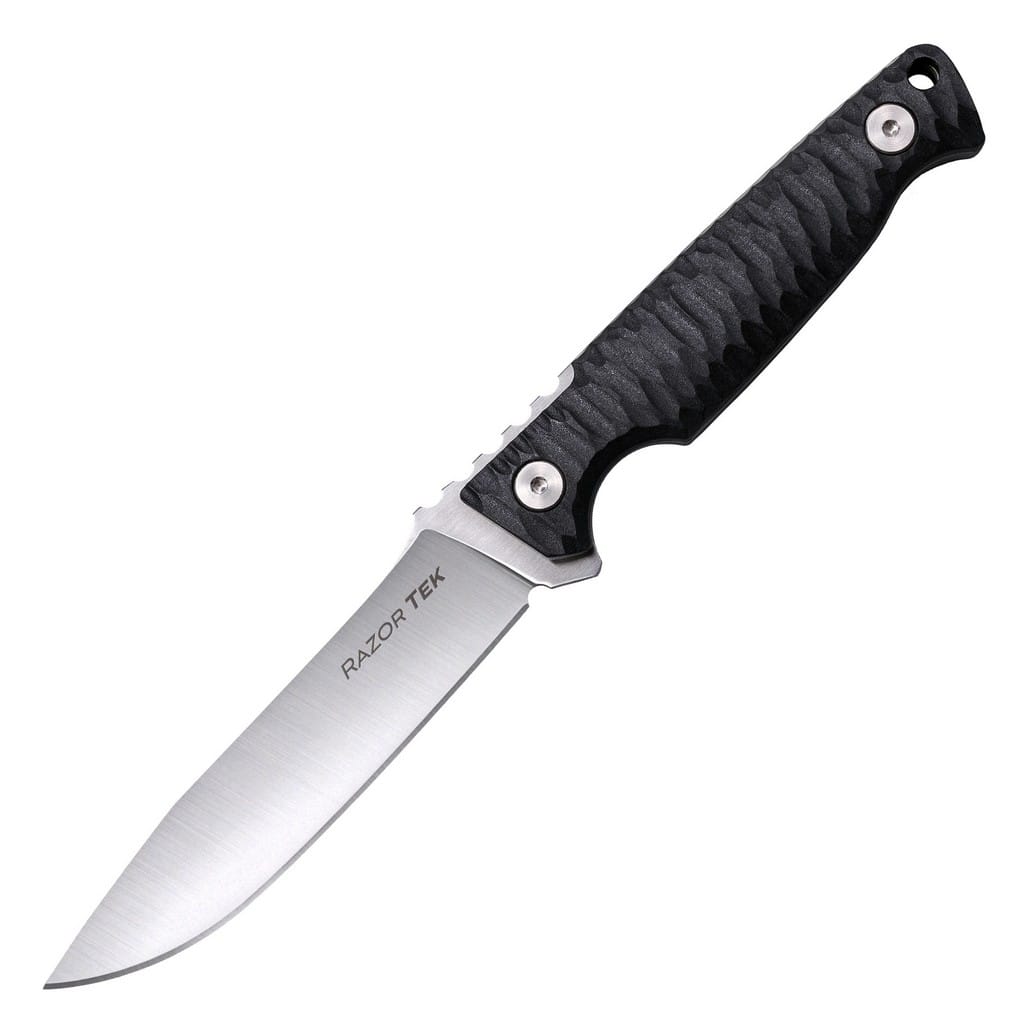 Razor Tek 4” firmy Cold Steel to kompaktowy i lekki nóż survivalowy zaprojektowany do codziennych zadań w terenie. Model charakteryzuje się gładkim ostrzem o uniwersalnym profilu Clip Point i satynowym wykończeniu, które pozostawia drobne ryski lekko matujące powierzchnię, co daje efekt niedokładnego wypolerowania. Narzędzie o konstrukcji full tang zostało wykonane z jednego kawałka niemieckiej stali nierdzewnej Krupp długo trzymającej ostrość i łatwej do ponownego naostrzenia. Bezpieczeństwo zapewnia jelec chroniący przed przypadkowym zsunięciem się ręki na krawędź tnącą oraz karbowany grzbiet klingi stanowiący stabilne podparcie dla kciuka. Ergonomicznie wyprofilowana rękojeść z nylonu wzmocnionego włóknem szklanym (GFN) posiada antypoślizgową teksturę poprawiającą przyczepność do dłoni oraz zapewniającą komfort użytkowania. Dodatkowo na zakończeniu uchwytu znajduje się otwór umożliwiający zamocowanie linki i stworzenie oplotu na nadgarstek. Do zestawu dołączono również funkcjonalną pochwę z tworzywa Secure-Ex z licznymi otworami na brzegach i mocowaniem na pasek, pozwalającą wygodnie transportować narzędzie blisko ciała lub przy wyposażeniu. Razor Tek to niezawodny nóż outdoorowy, który z powodzeniem może być używany do bushcraftu, podczas polowania, a także do innych lekkich prac domowych i na świeżym powietrzu.