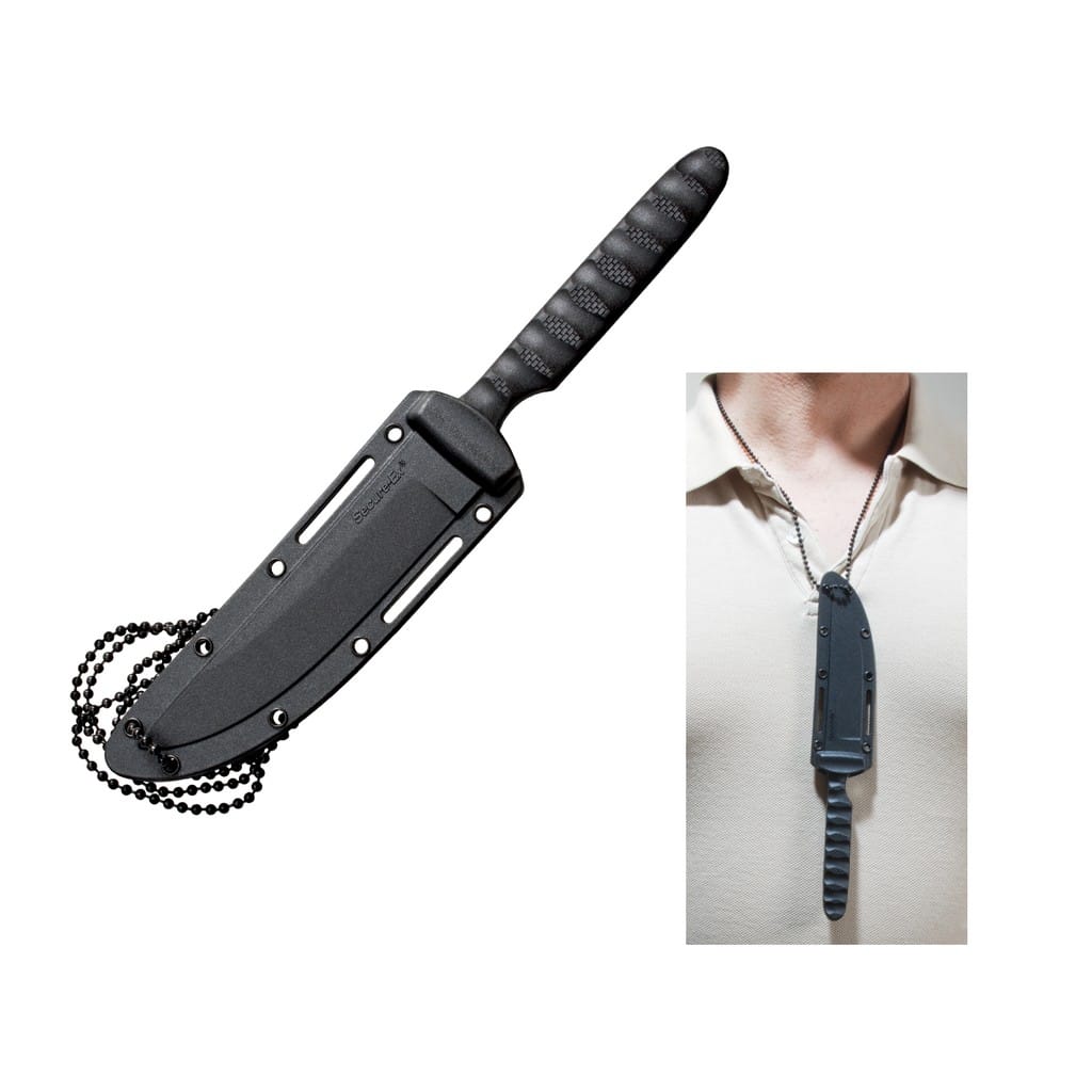 Spike firmy Cold Steel to seria lekkich i kompaktowych noży do noszenia na szyi. Ostre niczym brzytwa ostrze wykonane z niemieckiej stali nierdzewnej Krupp 4116 ze szlifem zerowym doskonale nadaje się do codziennego użytku. Wyprofilowana rękojeść z wcięciem na palec została wykonana z głęboko teksturowanego tworzywa Griv-Ex o antypoślizgowej fakturze. Specjalna konstrukcja chwytu zabezpiecza dłoń przed zsunięciem się na ostrze nawet gdy ręce są mokre, śliskie czy zmarznięte. W zestawie znajduje się łańcuszek kulkowy oraz pochwa z tworzywa Secure-Ex, która bezpiecznie utrzymuje nóż na swoim miejscu. Płaski profil modelu Spike świetnie sprawdza się do skrytego noszenia, a niewielka waga nie pozwala odczuć nadmiaru bagażu na karku.