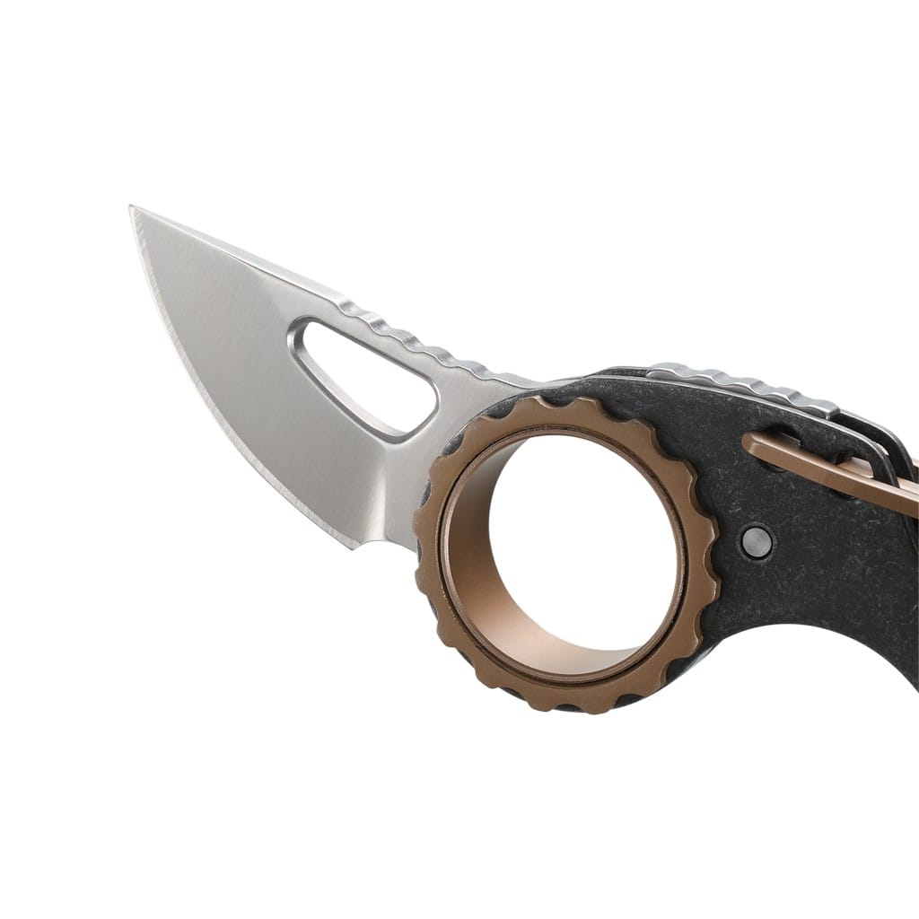 Projekt Mike’a Bonda z Pearl City na Hawajach dostarcza wszystko to co niezbędne w codziennym użytkowaniu, lecz zmniejszone do rozmiaru pęku kluczy. Compano posiada niewielkie, satynowe ostrze wykonane ze stali nierdzewnej 5Cr15MoV o wysokiej zawartości węgla, która jest łatwa w ostrzeniu i długo trzyma właściwą ostrość krawędzi tnącej. Stalową rękojeść wykończono na czarno metodą Stonewash nadającą znoszony charakter konstrukcji, co w połączeniu z brązowymi elementami chwytu tworzy doskonałą i przyjazną dla oczu całość. Karbowany grzbiet klingi i narzędzia zapewnia satysfakcjonujący i dość pewny chwyt jak na tak mały nożyk. Otwór na głowni umożliwia wysunięcie ostrza, które w pozycji rozłożonej utrzymywane jest bezpiecznie dzięki sprężynie, zaś do jego złożenia wystarczy użyć odpowiedniej siły. Wbudowany karabińczyk umożliwia zamocowanie foldera na szlufce od spodni lub przy kluczach czy wyposażeniu, tak aby był zawsze w zasięgu ręki, gdy zajdzie potrzeba jego użycia.