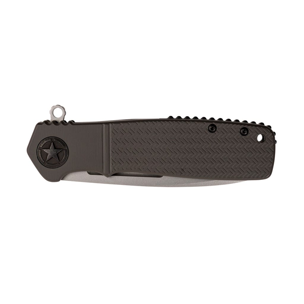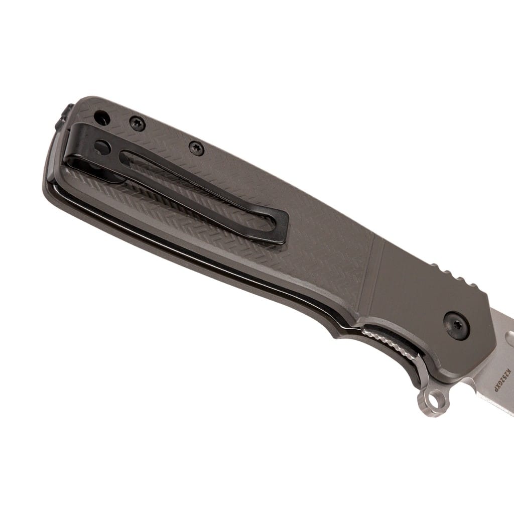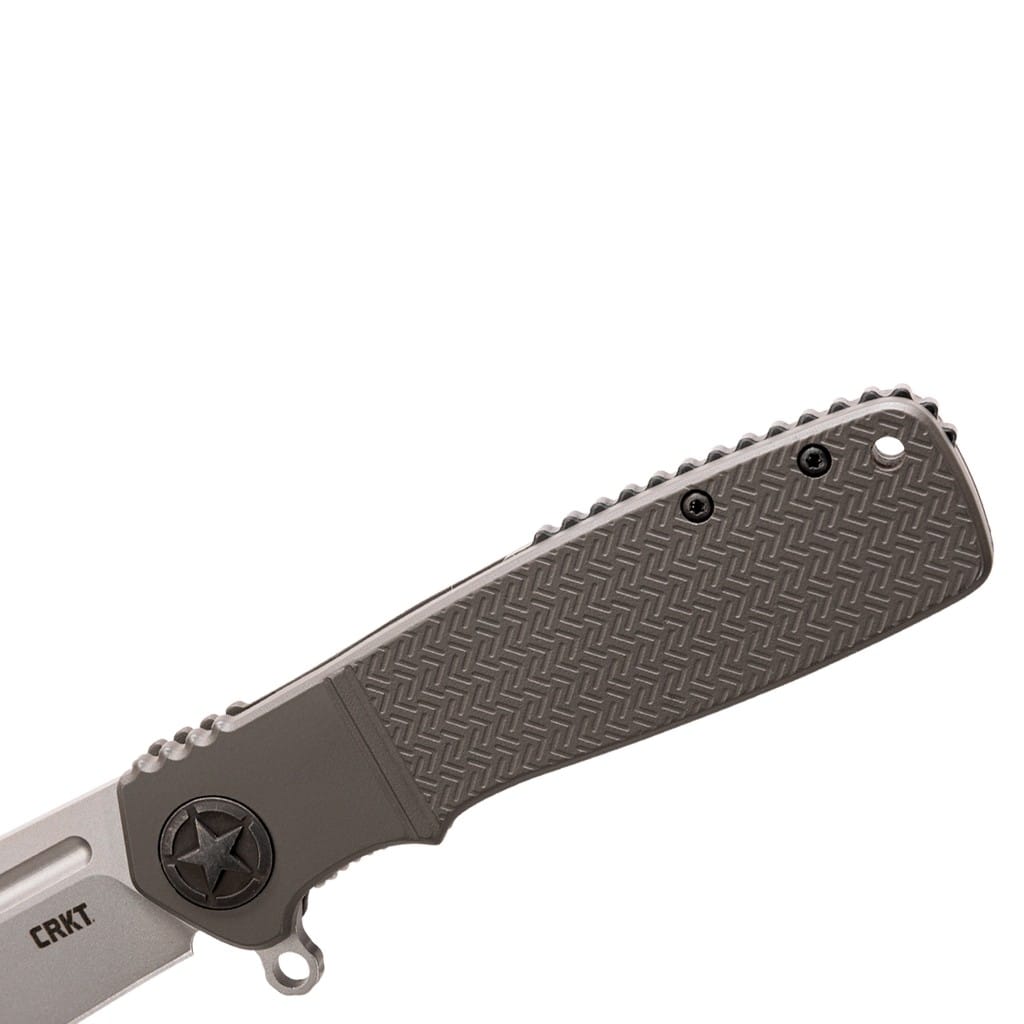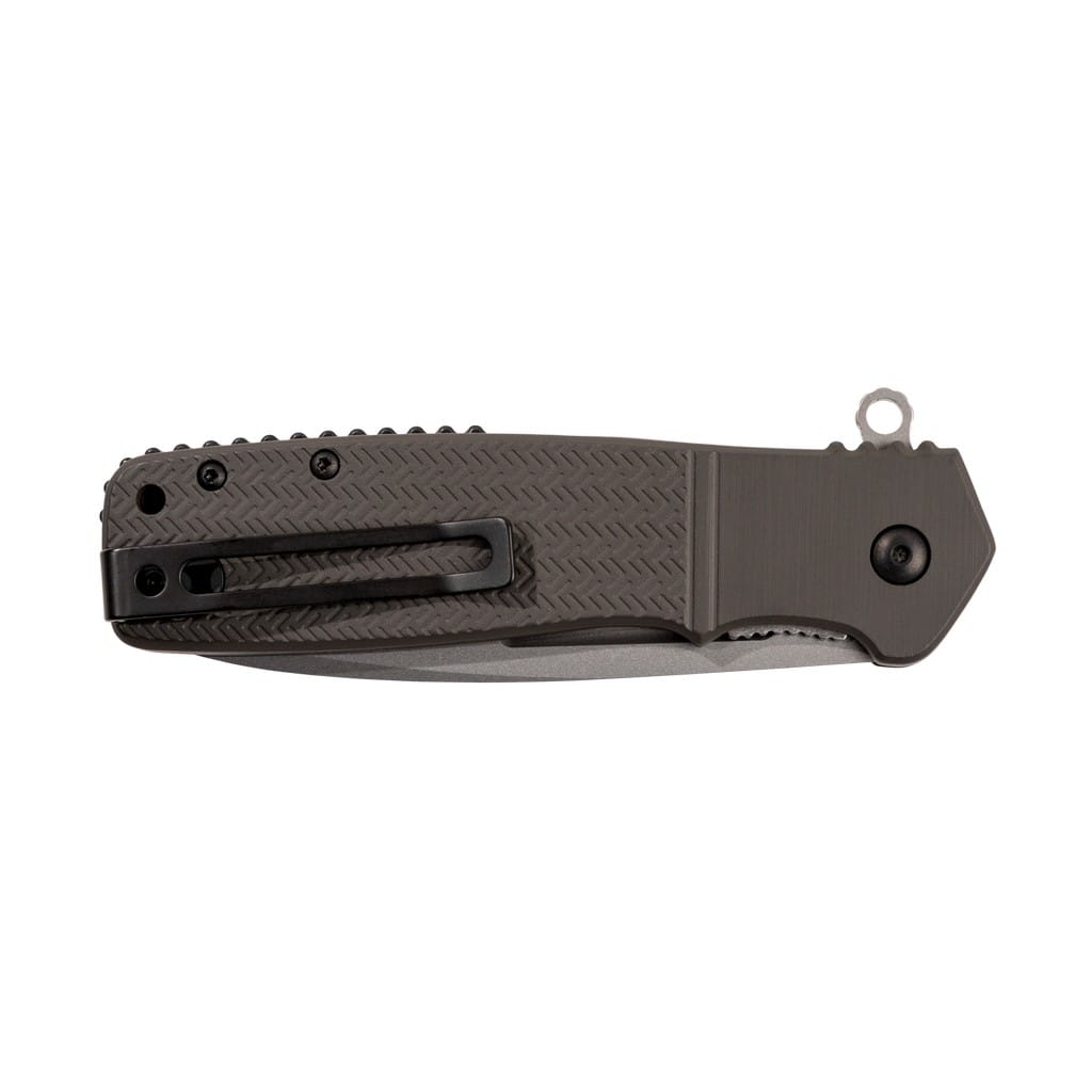 CRKT Homefront to klasyczny folder zaprojektowany przez światowej klasy, wielokrotnie nagradzanego Kena Oniona. Model charakteryzuje się tradycyjnym wyglądem, przypominającym nóż dziadka z czasów II wojny światowej, lecz jego konstrukcja skrywa nowoczesne rozwiązania. Ostrze o profilu Drop Point wykonano ze stali nierdzewnej Sandvik 12C27 zapewniającej doskonałe trzymanie ostrości. Matowy efekt na głowni uzyskano poprzez piaskowanie, czyli dzięki tak zwanej metodzie Bead Blast. Szybkie wysunięcie klingi jedną ręką umożliwia flipper wspierany przez system wspomagania Assisted Opening w postaci wewnętrznej sprężyny, która po zainicjowaniu ostrza w ruch wysuwa je w ułamku sekundy z imponującą prędkością. Dodatkowo zastosowanie łożysk kulkowych IKBS wzmacnia proces płynnego rozkładania narzędzia. Sporych rozmiarów flipper pełni jednocześnie funkcję jelca chroniącego dłoń przed jej przypadkowym zsunięciem się na krawędź tnącą. Bezpieczeństwu pracy sprzyjają karbowane krawędzie chwytu oraz klasyczny mechanizm Liner Lock blokujący folder po rozłożeniu. Lekka, aluminiowa rękojeść anodyzowana na szaro, dzięki antypoślizgowej fakturze gwarantuje pewny chwyt w każdych warunkach. Całość uzupełnia otwór na linkę oraz klips mocujący do głębokiego przenoszenia noża w kieszeni spodni.