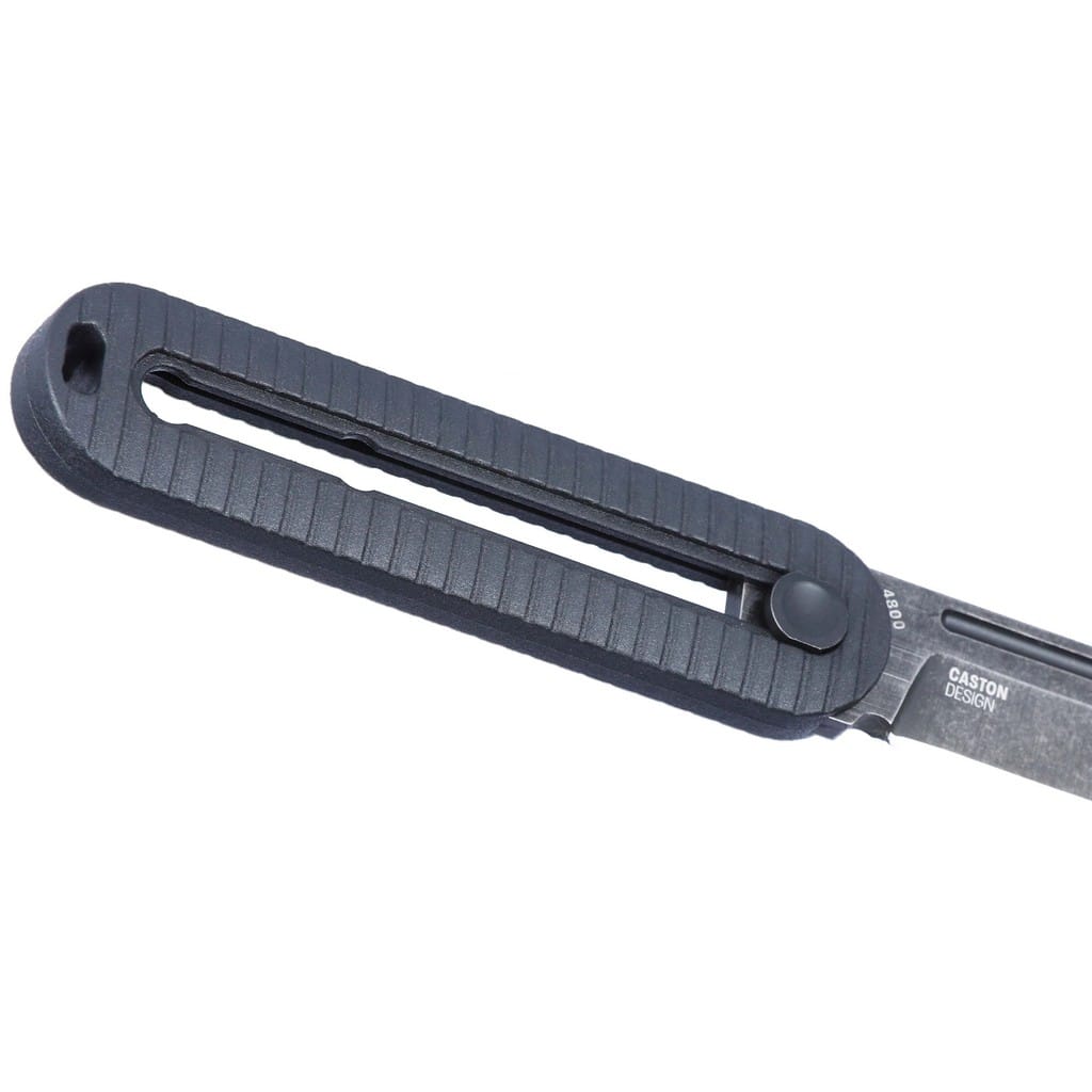 KatanaX firmy CRKT to mały, zwinny i lekki nóż składany zaprojektowany do drobnych, codziennych czynności. Otwór na rękojeści pozwala na przełożenie metalowego kółka i przenoszenie foldera w formie breloka przy kluczach. Ostrze o profilu Drop Point zostało wykonane z wysokiej jakości stali narzędziowej D2 o doskonałej wydajności cięcia, twardej i odpornej na zużycie. Wykończenie jej na czarno metodą Stonewash pozostawia nieregularną powłokę dobrze maskującą rysy i zadrapania powstające podczas eksploatacji. Klingę osadzono na łożyskach kulkowych, która wysuwa się bezpiecznie na zewnątrz za pomocą manualnego suwaka od blokady OTF. Okładziny chwytu zrobiono z termoplastycznego i trwałego materiału Grivory o nierównomiernej fakturze poprawiającej przyczepność do dłoni. Na zakończeniu zamocowano czarną linkę, co ułatwi wyjmowanie noża z kieszeni.