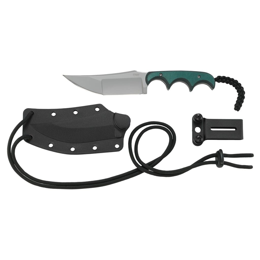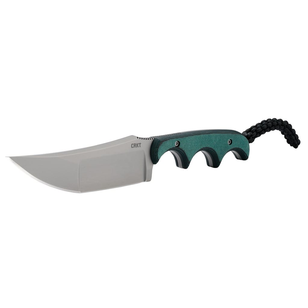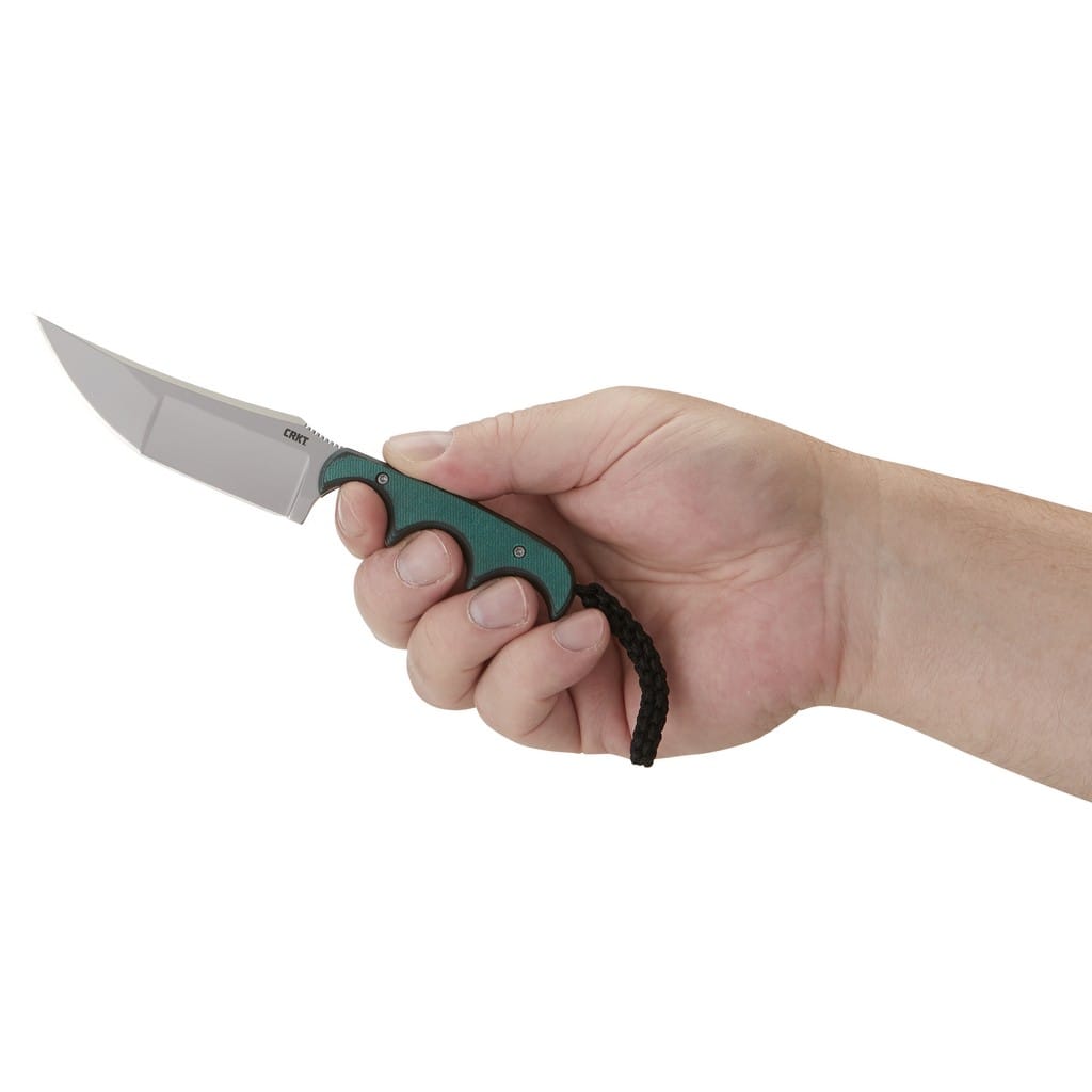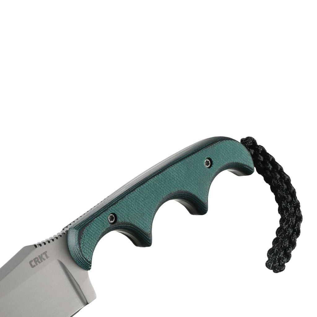 Minimalist firmy CRKT jak już sama nazwa wskazuje posiada minimalistyczną, prosta budowę, jednocześnie gwarantując maksymalną użyteczność. Model został stworzony przez Alana Foltsa z Florydy, projektanta z ponad 20 letnim doświadczeniem. Kompaktowe rozmiary noża oraz niewielka waga czynią z niego idealny wybór do codziennego noszenia. Ułatwia to znajdująca się w komplecie pochwa wykonana z tworzywa wyposażona w linkę z ogranicznikiem, dzięki której możemy wygodnie zawiesić produkt na karku. Dodatkowo producent dołączył klips pozwalający na przenoszenie zestawu przy pasie lub wyposażeniu. Wykonanie z jednego kawałka stali nierdzewnej 8Cr13MoV zwiększa wytrzymałość tej niedużej konstrukcji. Ostrze z charakterystycznym zakrzywieniem do góry powyżej linii grzbietu wykończono metodą beadblast pozostawiającą matową powłokę. Taki profil głowni świetnie poradzi sobie z większością zadań i sprosta każdemu wyzwaniu zarówno w terenie jak i w domu. Karbowany grzbiet głowni stanowi stabilne podparcie dla palca poprawiając bezpieczeństwo użytkowania. Okładziny rękojeści w zielonym kolorze z włókna nasyconego żywicą wyprofilowano pod zaciskającą się dłoń użytkownika, co zapewnia doskonałą kontrolę nad narzędziem i umożliwia precyzyjną pracę. Na zakończeniu chwytu zamocowano ozdobny brelok z nylonowej linki, który ułatwi wyciąganie noża z pochwy.