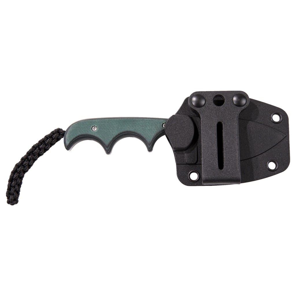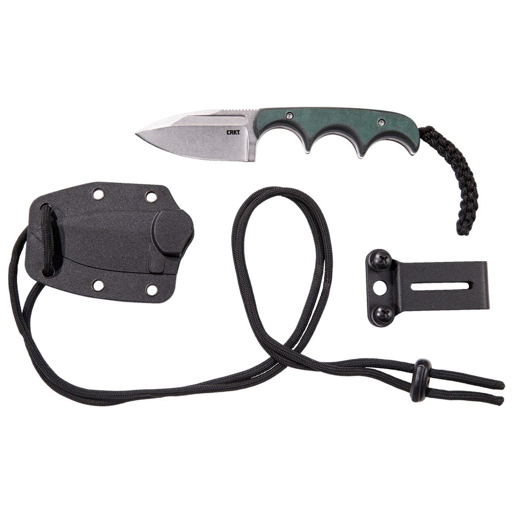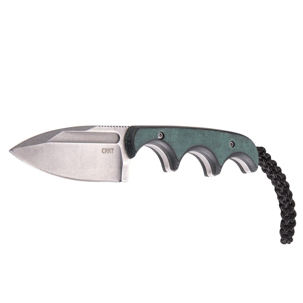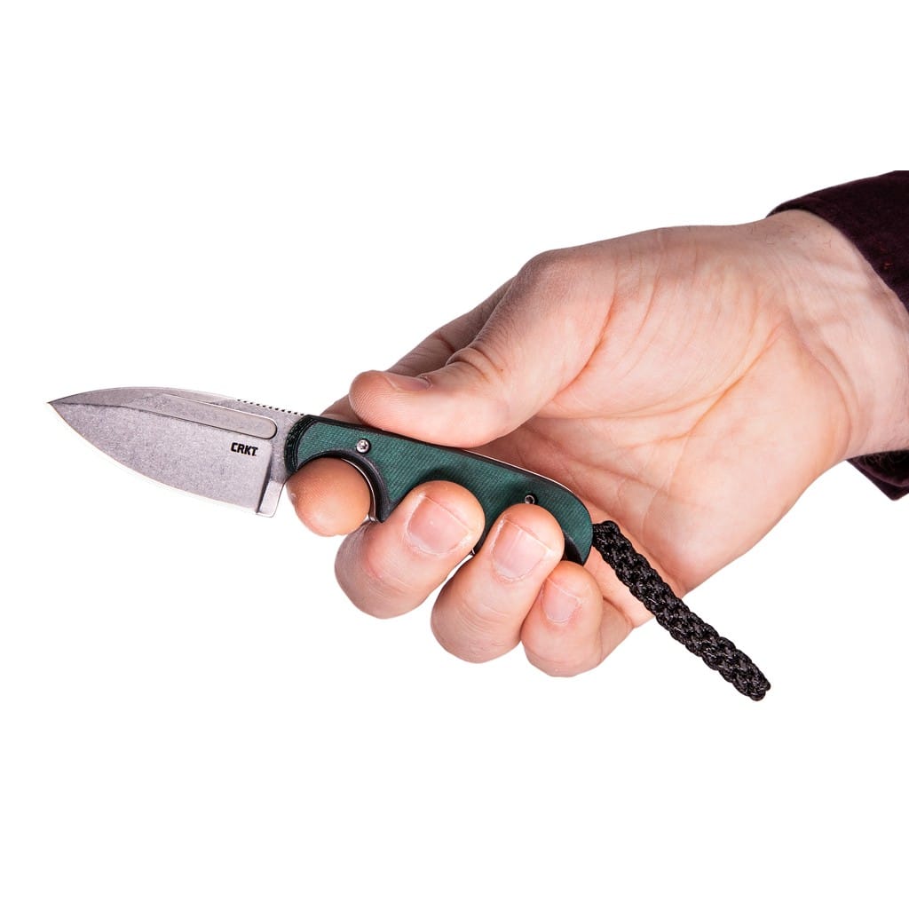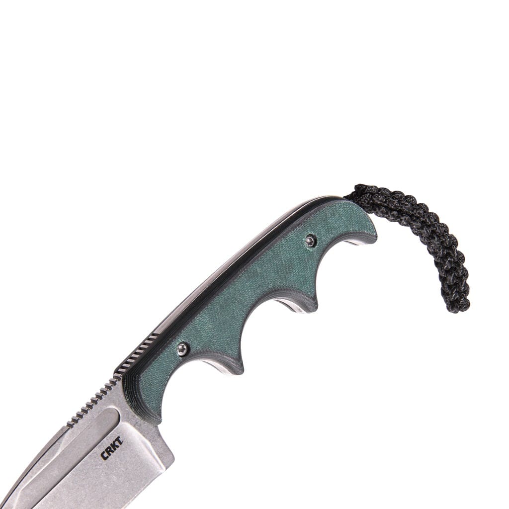 Minimalist firmy CRKT jak już sama nazwa wskazuje posiada minimalistyczną, prosta budowę, jednocześnie gwarantując maksymalną użyteczność. Model został stworzony przez Alana Foltsa z Florydy, projektanta z ponad 20 letnim doświadczeniem. Kompaktowe rozmiary noża oraz niewielka waga czynią z niego idealny wybór do codziennego noszenia. Ułatwia to znajdująca się w komplecie pochwa wykonana z tworzywa wyposażona w linkę z ogranicznikiem, dzięki której możemy wygodnie zawiesić produkt na karku. Dodatkowo producent dołączył klips pozwalający na przenoszenie zestawu przy pasie lub wyposażeniu. Wykonanie z jednego kawałka stali nierdzewnej 8Cr13MoV zwiększa wytrzymałość tej niedużej konstrukcji. Ostrze o profilu Spear Point wykończono metodą Stonewash pozostawiającą nieregularną powłokę dobrze maskującą rysy powstające podczas eksploatacji. Taki profil głowni świetnie poradzi sobie z większością zadań i sprosta każdemu wyzwaniu zarówno w terenie jak i w domu. Karbowany grzbiet głowni stanowi stabilne podparcie dla kciuka poprawiając bezpieczeństwo. Okładziny rękojeści w zielonym kolorze z Micarty wyprofilowano pod zaciskającą się dłoń użytkownika, co zapewnia doskonałą kontrolę nad narzędziem i umożliwia precyzyjną pracę. Na zakończeniu chwytu zamocowano ozdobny brelok z nylonowej linki, który ułatwi wyciąganie noża z pochwy.