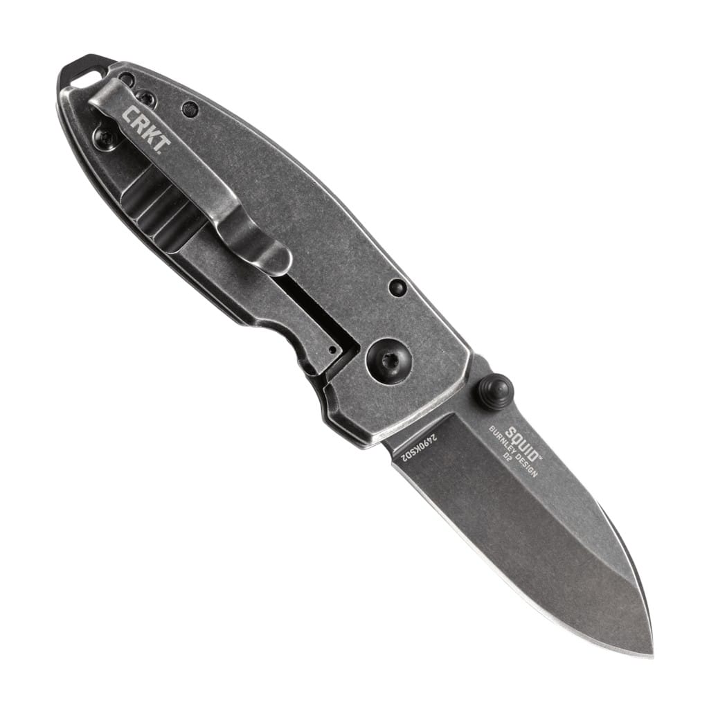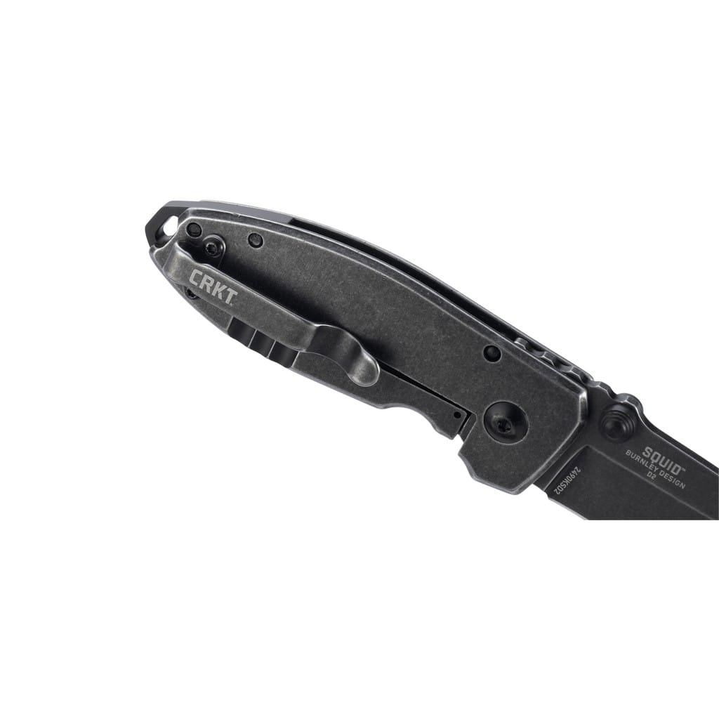 CRKT Squid Black zaprojektowany przez Lucasa Burnleya to niewielkich rozmiarów nóż składanym stworzony z myślą o codziennym użytkowaniu. Gładkie ostrze o profilu Drop Point wykonano ze stali nierdzewnej 8Cr13MoV o twardości 58-59 HRC i wykończono metodą "polerowania" w żwirze, dzięki czemu uzyskano nieregularną powłokę, która dobrze maskuje kolejne rysy powstające podczas eksploatacji. Szybkie wysunięcie głowni możliwe jest za pomocą dużego, obustronnego kołka. Bezpieczeństwu pracy sprzyja ząbkowane oparcie dla kciuka na górnej części głowni, a przed przypadkowym złożeniem noża gdy jest w użyciu chroni blokada frame lock. Okładziny rękojeści ze stali nierdzewnej zostały odpowiednio wyprofilowane, co znacznie poprawia komfort trzymania i gwarantuje pewny chwyt. Całość uzupełnia otwór na przewleczenie linki oraz klips umożliwiający przymocowanie foldera do kieszeni lub ekwipunku.