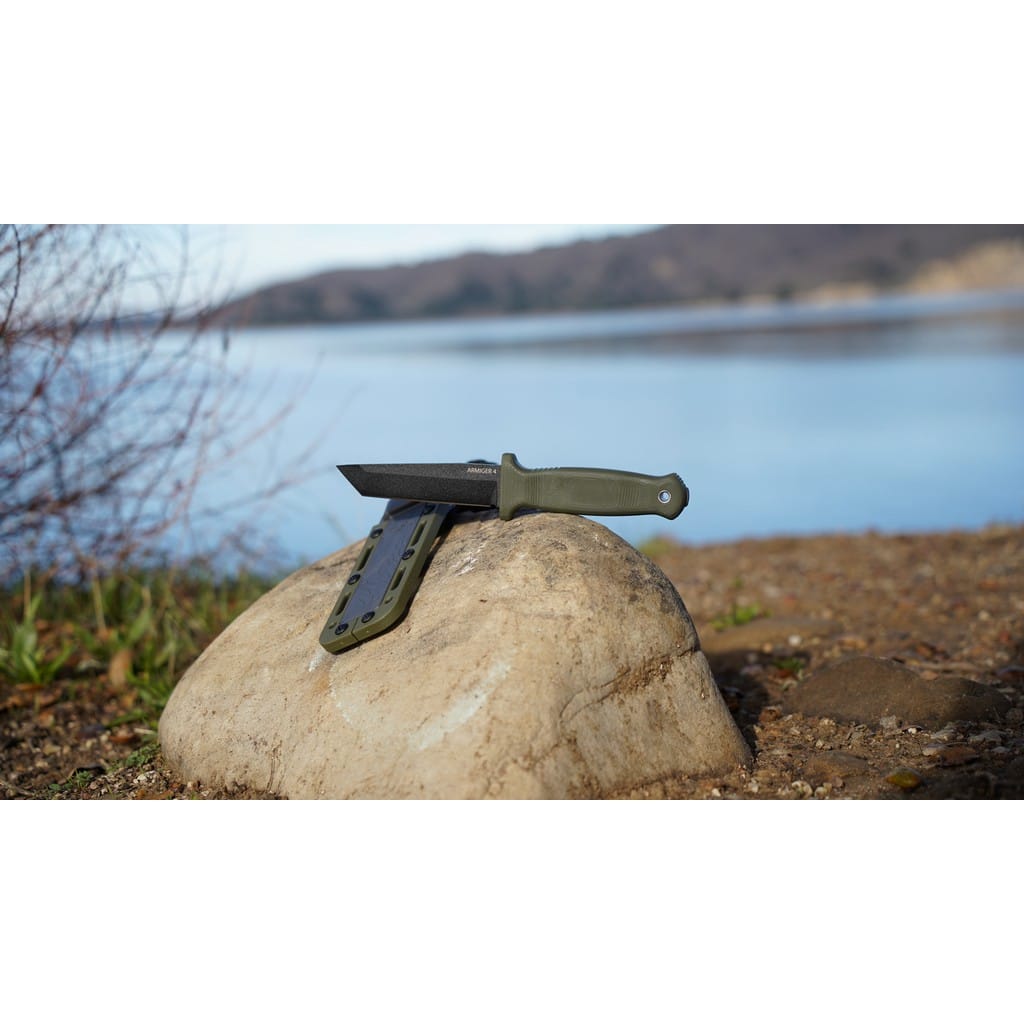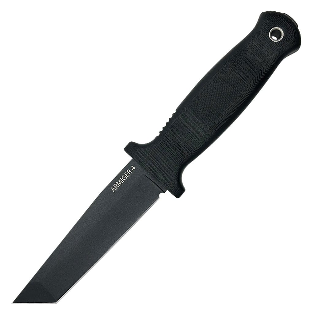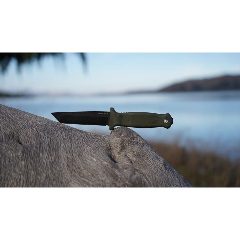 Armiger 4 amerykańskiej firmy Demko Knives to solidny nóż survivalowy w kompaktowym rozmiarze, idealny do codziennych zadań. Model charakteryzuje się jednoczęściową konstrukcją full tang dostarczającą wytrzymałość i niezawodność podczas intensywnej pracy. Ostrze zostało wykonane ze stali narzędziowej 80CrV2 o wysokiej zawartości węgla, która cechuje się trwałością i bardzo dobrym trzymaniem ostrości. Głownię, o taktycznym profilu Tanto, w celu ochrony przed negatywnym działaniem czynników zewnętrznych pokryto proszkowo antyodblaskową powłoką. Bezpieczeństwo użytkowania gwarantuje obustronny jelec czuwający przed przypadkowym zsunięciem się palców na krawędź tnącą. Rękojeść z termoplastycznego gumowego tworzywa amortyzuje drgania oraz zapewnia doskonały chwyt, nawet w mokrej dłoni. Na zakończeniu umieszczono otwór umożliwiający przełożenie linki paracord lub ozdobnego breloka. W zestawie znajduje się funkcjonalna pochwa z kydexu, kompatybilną z systemem Molle. Dzięki niej możemy wygodnie przenosić nóż na pasku spodni lub przy wyposażeniu, zaś otwory na krawędziach dają dodatkowe opcje montażu. Armiger 4 to ciekawa propozycja od Andrew Demko oferująca wydajność na wysokim poziomie.
