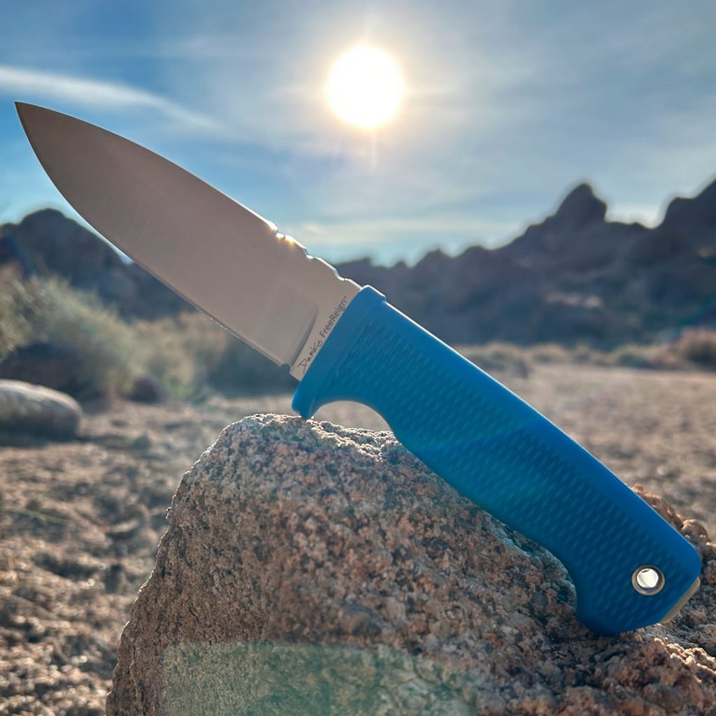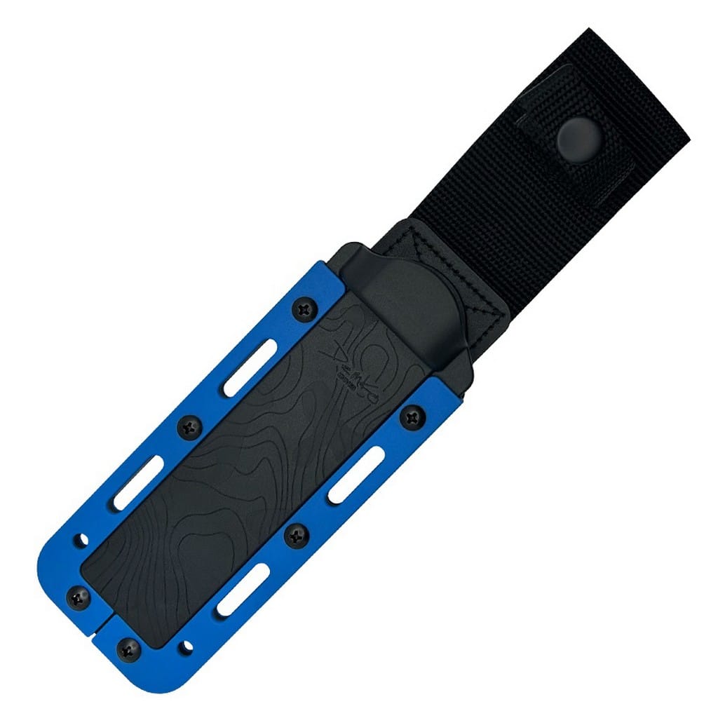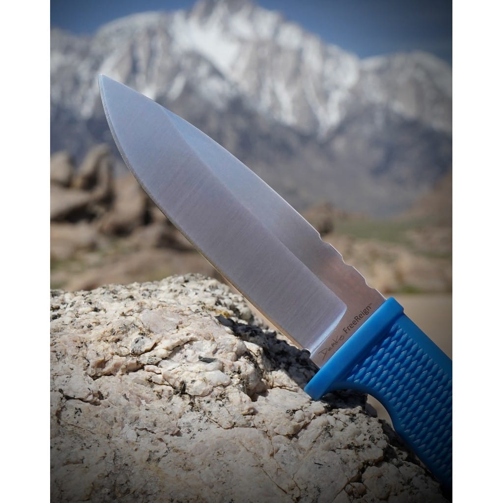 Model Freereign został zaprojektowany przez amerykańską firmę Demko Knives z myślą o aktywności na świeżym powietrzu. Stanowi doskonały wybór na towarzysza codziennej przygody, który zawsze będzie gotowy na nowe wyzwania. Jest to solidny nóż z ostrzem stałym, charakteryzujący się jednoczęściową konstrukcją full tang, dostarczającą wytrzymałość i niezawodność podczas intensywnej pracy. Głownię o uniwersalnym profilu Drop Point wykonano z japońskiej stali nierdzewnej AUS10A znanej z bardzo dobrej równowagi pomiędzy twardością, a odpornością na korozję. Wykończenie jej metodą Satin pozostawia drobne ryski lekko matujące powierzchnię, co daje efekt niedokładnego wypolerowania. Bezpieczeństwo użytkowania zapewnia jelec chroniący przed przypadkowym zsunięciem się palców na krawędź tnącą. Rękojeść z gumy gwarantuje komfort i pewny chwyt, nawet w trudnych warunkach środowiskowych. Amortyzuje drgania, a dzięki antypoślizgowej fakturze zwiększa przyczepność do dłoni. Jej widoczny, niebieski kolor ułatwi odnalezienie narzędzia, gdy zgubimy je w terenie. Na zakończeniu umieszczono otwór umożliwiający przełożenie linki paracord lub ozdobnego breloka. W zestawie znajduje się funkcjonalna pochwa z kydexu, kompatybilną z systemem Molle. Dzięki niej możemy wygodnie przenosić nóż na pasku spodni lub przy wyposażeniu, zaś otwory na krawędziach dają dodatkowe opcje montażu. Freereign, od Andrew Demko, to idealny kompan do zadań outdoorowych, świetnie sprawdzi się zarówno na wyprawie survivalowej, jak i na kempingu.