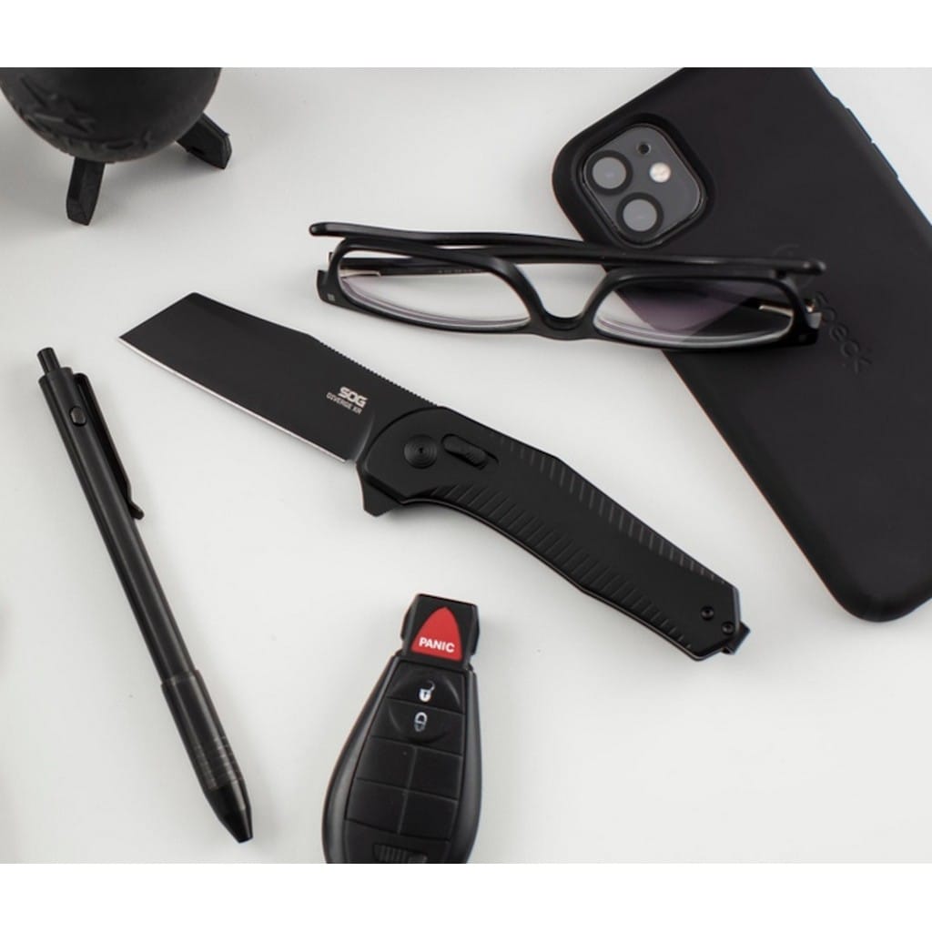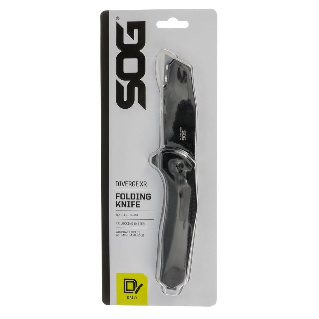 Diverge XR amerykańskiej firmy SOG to funkcjonalny folder zaprojektowany jako idealny towarzysz codziennej przygody. Głownia o profilu Sheepsfoot została zrobiona z wysokiej jakości stali narzędziowej D2 o doskonałej wydajności cięcia, twardej i odpornej na zużycie. W celu zabezpieczenia jej przed negatywnym działaniem czynników zewnętrznych pokryto ją czarną i antyodblaskową powłoką PVD. Ten użyteczny kształt ostrza świetnie sprawdzi się do zadań EDC, jak i do przygotowywania posiłków w terenie. Klingę można szybko i sprawnie rozłożyć jedną ręką za pomocą flippera, pełniącego jednocześnie funkcję jelca, a także przy wykorzystaniu suwaka znajdującego się na rękojeści. Nad bezpieczeństwem użytkownika, gdy narzędzie jest w użyciu,czuwa innowacyjny systemem blokującym XR Lock. Karbowany grzbiet głowni stanowi stabilne wsparcie dla kciuka, co ułatwia wykonywanie zadań wymagających większej precyzji. Ergonomicznie wyprofilowane okładziny chwytu z aluminium anodowanego na czarno o antypoślizgowej teksturze, gwarantują pewny chwyt w każdych warunkach. Konstrukcję uzupełnia dwupozycyjny klips mocujący do wygodnego przenoszenia foldera w kieszeni spodni lub przy wyposażeniu.