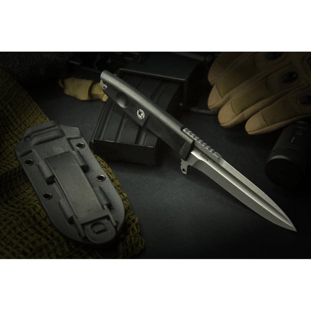 Defender 2 firmy Extrema Ratio to taktyczna wersja noża Scout, odznaczająca się smukłym kształtem i rowkiem drenażowym po obu stronach klingi. Konstrukcja full tang zwiększa jego wytrzymałość, czyniąc z niego niezawodne i wydajne narzędzie do wymagającej pracy. Ostrze o profilu Spear Point zostało wykonane z austriackiej stali nierdzewnej Bohler N690 o twardości 58 HRC. Charakteryzuje się wysoką odpornością na korozję i długim trzymaniem ostrości. Wykończenie jej metodą Stonewash pozostawia nieregularną powłokę dobrze maskującą rysy i zadrapania powstające podczas eksploatacji. Bezpieczeństwo użytkowania gwarantuje duży jelec chroniący palce przed ich przypadkowym zsunięciem się na krawędź tnącą. Dodatkowo karbowany grzbiet głowni stanowi stabilne podparcie dla kciuka, co jest niezwykle pomocne przy precyzyjnych zadaniach. Rękojeść z termoplastycznego elastomeru, o nazwie Forprene, zapewnia komfort użytkowania, a także doskonałą ergonomię chwytu świetnie dopasowując się do dłoni, nawet gdy jest ona w rękawicy. Cechuje się niewrażliwością na chemikalia oraz ekstremalne temperatury, co pozwala jej przechodzić rygorystyczne testy NATO. Na zakończeniu w stalowej głowicy, która w awaryjnej sytuacji może posłużyć jako zbijak do szyb, umieszczono otwór na linkę, umożliwiający przełożenie paracordu i stworzenie oplotu na nadgarstek. W zestawie znajduje się pochwa z kydexu kompatybilna z systemem Molle. Posiada po obu stronach trok do mocowania całości na pasku spodni, do kamizelki, plecaka lub innego wyposażenia. Extrema Ratio to włoska manufaktura z siedzibą w Prato, w regionie Toskanii. Firma od 1997 roku mistrzowsko projektuje niesamowicie mocne noże taktycznie i myśliwskie, niemających sobie równych w przemyśle militarnym. Produkcja opiera się jedynie na wysokiej jakości materiałach i najnowocześniejszych technologiach. Co w połączeniu z tradycyjnym rzemiosłem i ręcznym wykończeniem każdego egzemplarza, tworzy produkt spełniający najostrzejsze normy wojskowe.