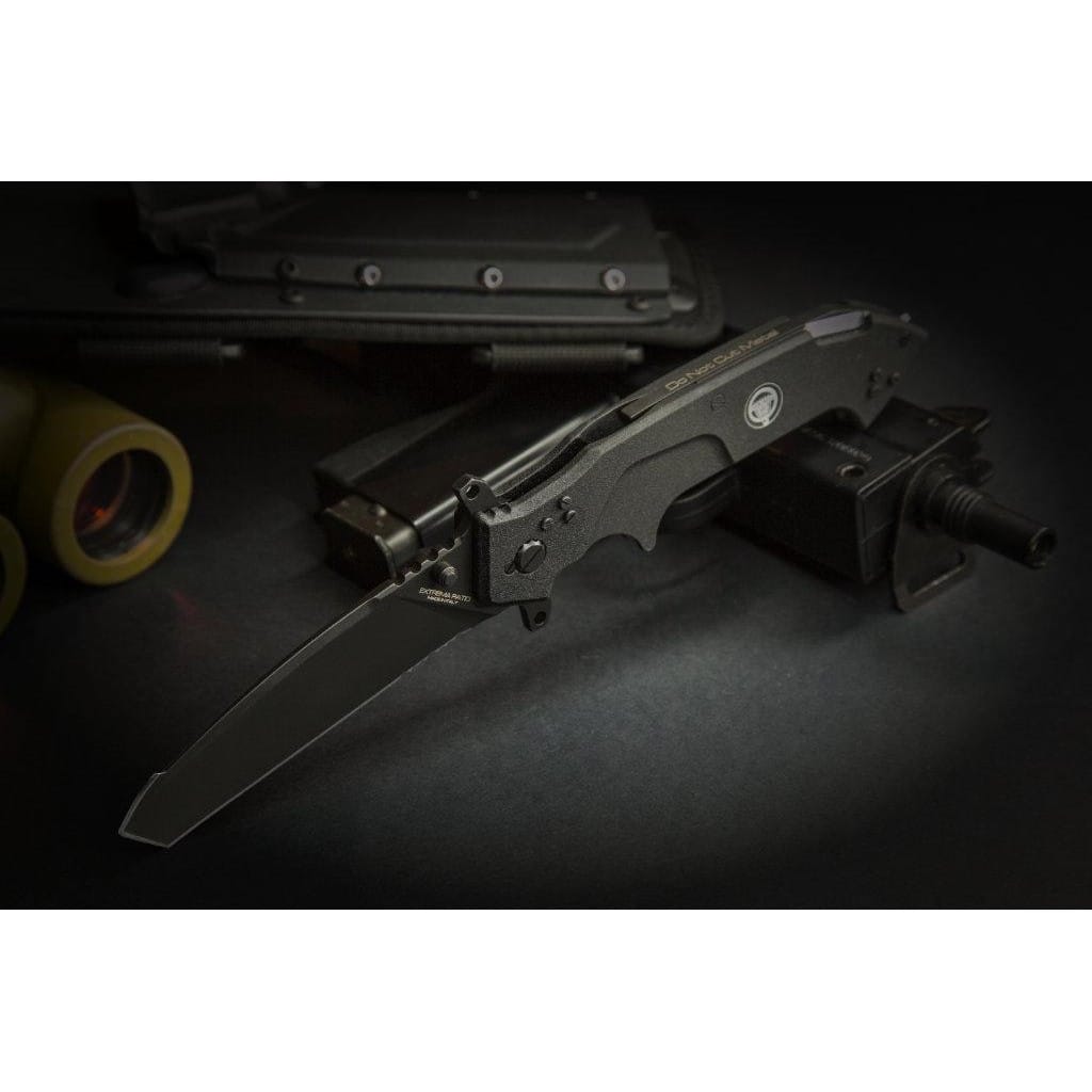 Glauca to masywny i wytrzymały nóż składany, który powstał w wyniku współpracy firmy Extrema Ratio z oddziałem antyterrorystycznym Francuskiej Żandarmerii Narodowej GIGN. Model odznacza się niezawodną i wydajną konstrukcją zaprojektowaną do profesjonalnego użytku przez wojsko i policję. Folder doskonale sprawdzi się również w ręku miłośnika taktycznych narzędzi. Głownia o profilu Tanto, o świetnych zdolnościach penetracji, została wykonana z austriackiej stali nierdzewnej Bohler N690 o twardości 58 HRC. Charakteryzuje się wysoką odpornością na korozję i długim trzymaniem ostrości. W celu zabezpieczenia jej przed zarysowaniami i negatywnym działaniem czynników zewnętrznych pokryto ją czarną i antyodblaskową powłoką ochronną MIL-C-13924. Klinga typu Combo łączy zalety i uniwersalność ostrza gładkiego z ząbkowaną krawędzią tnącą. Pozwala na skuteczne cięcie miękkich przedmiotów, jak i twardych lin, sznurów oraz innych włóknistych materiałów. Obustronny kołek na głowni oraz flipper, pełniący jednocześnie funkcję jelca, służą do sprawnego rozkładania foldera jedną ręką. Karbowany grzbiet klingi stanowi stabilne podparcie dla kciuka, co jest niezwykle pomocne przy precyzyjnych zadaniach. Mechanizm Liner Lock, dodatkowo wspierany ręczną blokadą, dba o bezpieczeństwo podczas pracy, chroniąc przed przypadkowym złożeniem się ostrza, gdy jest w użyciu. Rękojeść z anodowanego na czarno aluminium o antypoślizgowej fakturze i ergonomicznym wyprofilowaniu gwarantuje pewny i komfortowy chwyt, nawet gdy dłoń jest mokra lub w rękawicy. Na zakończeniu znajduje się zbijak do szyb nieoceniony w awaryjnej sytuacji. Całość uzupełnia trzypozycyjny klips mocujący do głębokiego i dyskretnego przenoszenia foldera w kieszeni spodni lub przy wyposażeniu. Dodatkową zaletą noża jest wbudowany system do cięcia pasów oraz kajdanek z tworzywa. W zestawie znajduje się pochwa z ABS przymocowana do podkładki z Cordury, do której doszyto regulowane taśmy na udo. Kabura jest kompatybilna z systemem Molle i umożliwia przenoszenie narzędzia na pasku blisko ciała, na kamizelce lub przy wyposażeniu. Extrema Ratio to włoska manufaktura z siedzibą w Prato, w regionie Toskanii. Firma od 1997 roku mistrzowsko projektuje niesamowicie mocne noże taktycznie i myśliwskie, które nie mają sobie równych w przemyśle militarnym. Produkcja opiera się jedynie na wysokiej jakości materiałach i najnowocześniejszych technologiach. Co w połączeniu z tradycyjnym rzemiosłem i ręcznym wykończeniem każdego egzemplarza tworzy produkt spełniający najostrzejsze normy wojskowe.