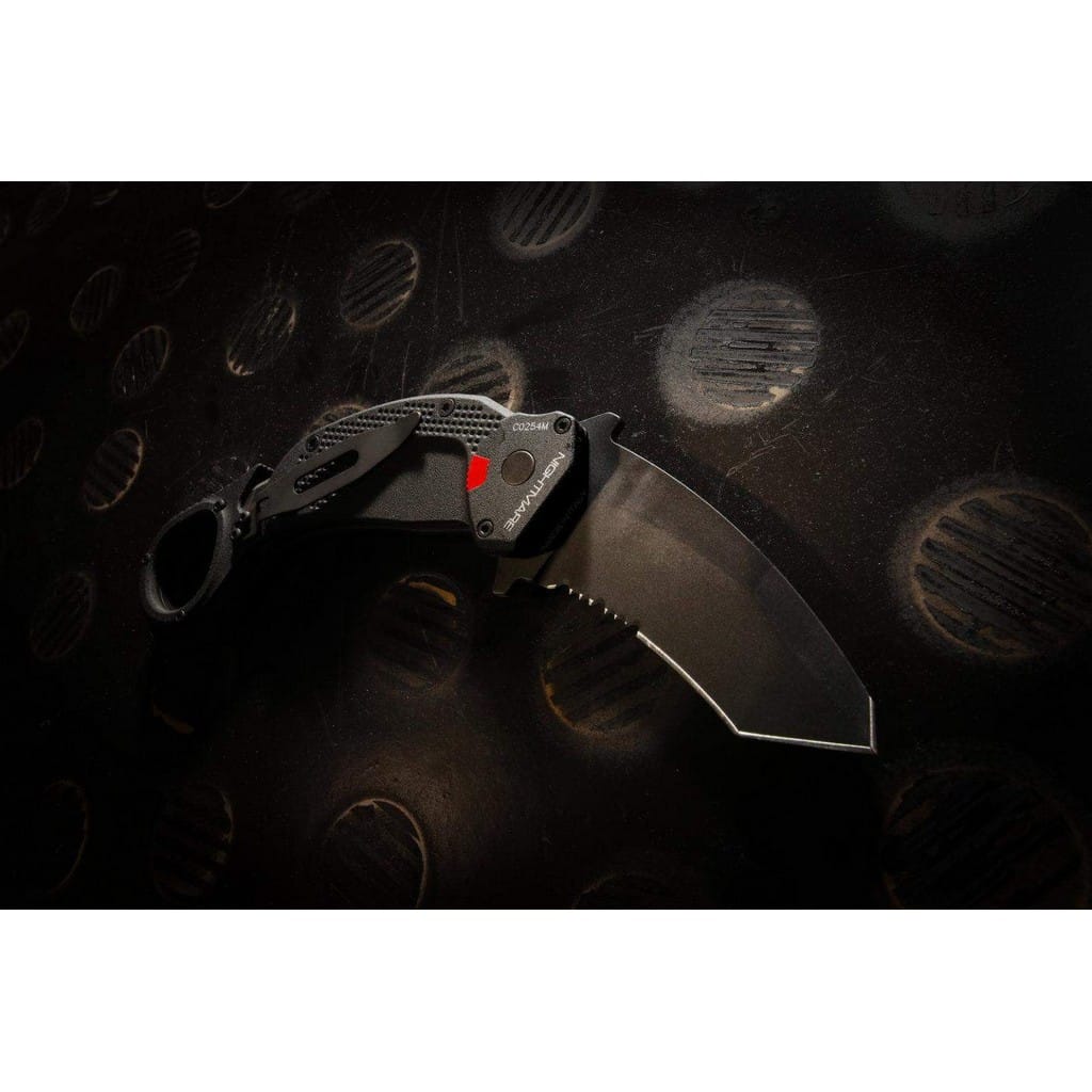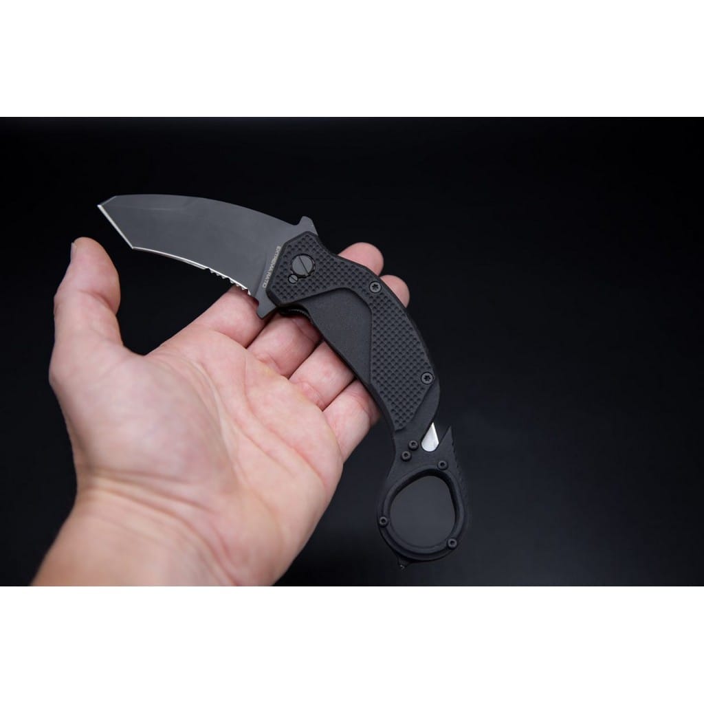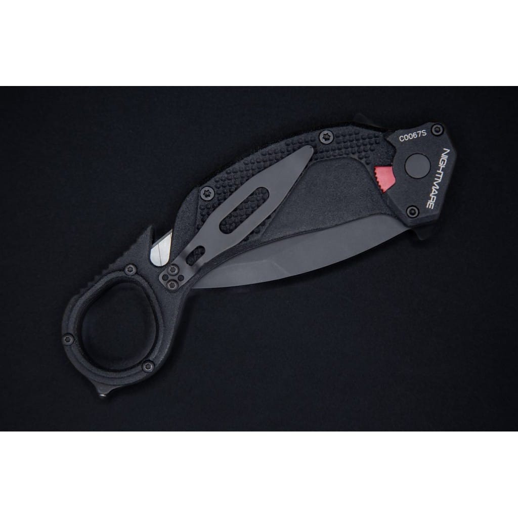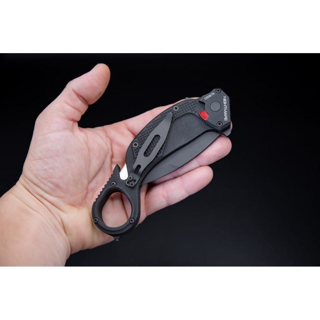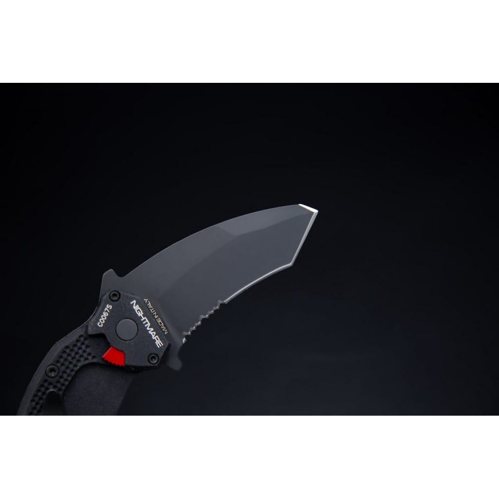 Nightmare firmy Extrema Ratio to profesjonalny nóż ratunkowy typu karambit przyjęty na wyposażenie przez jednostki specjalne policji U.S.I.V.P Księstwa Monako. Model odznacza się niezawodną i wydajną konstrukcją zaprojektowaną do profesjonalnego użytku przez wojsko i policję. Folder doskonale sprawdzi się również w ręku miłośnika taktycznych narzędzi pozwalając na szybkie interwencje w kryzysowej sytuacji. Głownia o profilu Tanto, o bardzo dobrych zdolnościach penetracji, została wykonana z austriackiej stali nierdzewnej Bohler N690 o twardości 58 HRC. Charakteryzuje się wysoką odpornością na korozję i długim trzymaniem ostrości. W celu zabezpieczenia jej przed zarysowaniami i negatywnym działaniem czynników zewnętrznych pokryto ją czarną i antyodblaskową powłoką ochronną MIL-C-13924. Klinga typu Combo łączy zalety i uniwersalność ostrza gładkiego z ząbkowaną krawędzią tnącą. Skutecznie tnie miękkie przedmioty, jak i twarde liny, sznury oraz inne włókniste materiały. Obustronny flipper, pełniący jednocześnie funkcję jelca, służy do sprawnego rozkładania foldera jedną ręką. Mechanizm Liner Lock, dodatkowo wspierany ręczną blokadą, dba o bezpieczeństwo chroniąc przed przypadkowym złożeniem się ostrza, gdy jest w użyciu. Rękojeść z anodowanego na czarno aluminium o antypoślizgowej fakturze i ergonomicznym wyprofilowaniu gwarantuje dobrą przyczepność do dłoni, nawet gdy jest mokra lub w rękawicy. Zakończenie w postaci okrągłej głowicy na palec przedłuża chwyt i pozwala na pełną kontrolę nad narzędziem podczas pracy. Całość dopełnia zbijak do szyb oraz ostrze do cięcia pasów lub kajdanek jednorazowych. Dwupozycyjny klips mocujący umożliwia wygodne i dyskretne przenoszenie foldera w kieszeni spodni lub przy ekwipunku. Extrema Ratio to włoska manufaktura z siedzibą w Prato, w regionie Toskanii. Firma od 1997 roku mistrzowsko projektuje niesamowicie mocne noże taktycznie i myśliwskie, które nie mają sobie równych w przemyśle militarnym. Produkcja opiera się jedynie na wysokiej jakości materiałach i najnowocześniejszych technologiach. Co w połączeniu z tradycyjnym rzemiosłem i ręcznym wykończeniem każdego egzemplarza tworzy produkt spełniający najostrzejsze normy wojskowe.