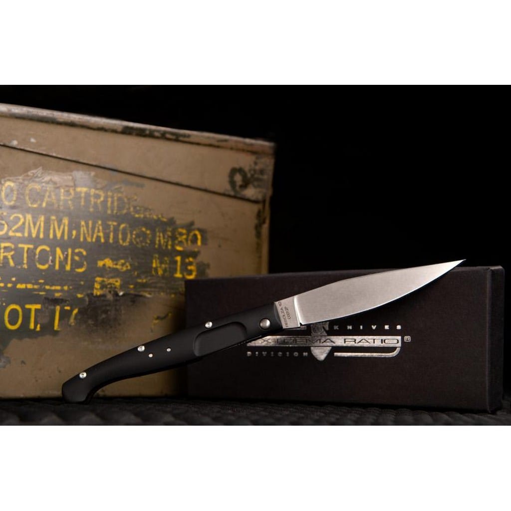Resolza to starożytna nazwa przypominająca włoskie słowo oznaczające brzytwę. W Sardynii stanowi synonim jednego z najbardziej znanych i tradycyjnych noży, które do dziś towarzyszą rolnikom i pasterzom podczas pracy. Firma Extrema Ratio pokusiła się o nowoczesną reinkarnację tego wiekowego narzędzia. W efekcie powstał smukły i lekki model o prostej budowie, doskonały do codziennych zadań w domu oraz na świeżym powietrzu. Głownia o profilu Clip Point została wykonana z austriackiej stali nierdzewnej Bohler N690 o twardości 58 HRC. Charakteryzuje się wysoką odpornością na korozję i długim trzymaniem ostrości. Wykończenie jej metodą Stonewash pozostawia nieregularną powłokę dobrze maskującą rysy i zadrapania powstające podczas eksploatacji. Blokada Liner Lock dba o bezpieczeństwo chroniąc przed przypadkowym złożeniem się ostrza, gdy jest w użyciu. Rękojeść z anodowanego na czarno aluminium, któremu folder zawdzięcza niewielką wagę, posiada ergonomiczne wyprofilowanie pod palce poprawiające przyczepność do dłoni i zwiększające komfort użytkowania. Extrema Ratio to włoska manufaktura z siedzibą w Prato, w regionie Toskanii. Firma od 1997 roku mistrzowsko projektuje niesamowicie mocne noże taktycznie i myśliwskie, które nie mają sobie równych w przemyśle militarnym. Produkcja opiera się jedynie na wysokiej jakości materiałach i najnowocześniejszych technologiach. Co w połączeniu z tradycyjnym rzemiosłem i ręcznym wykończeniem każdego egzemplarza tworzy produkt spełniający najostrzejsze normy wojskowe.