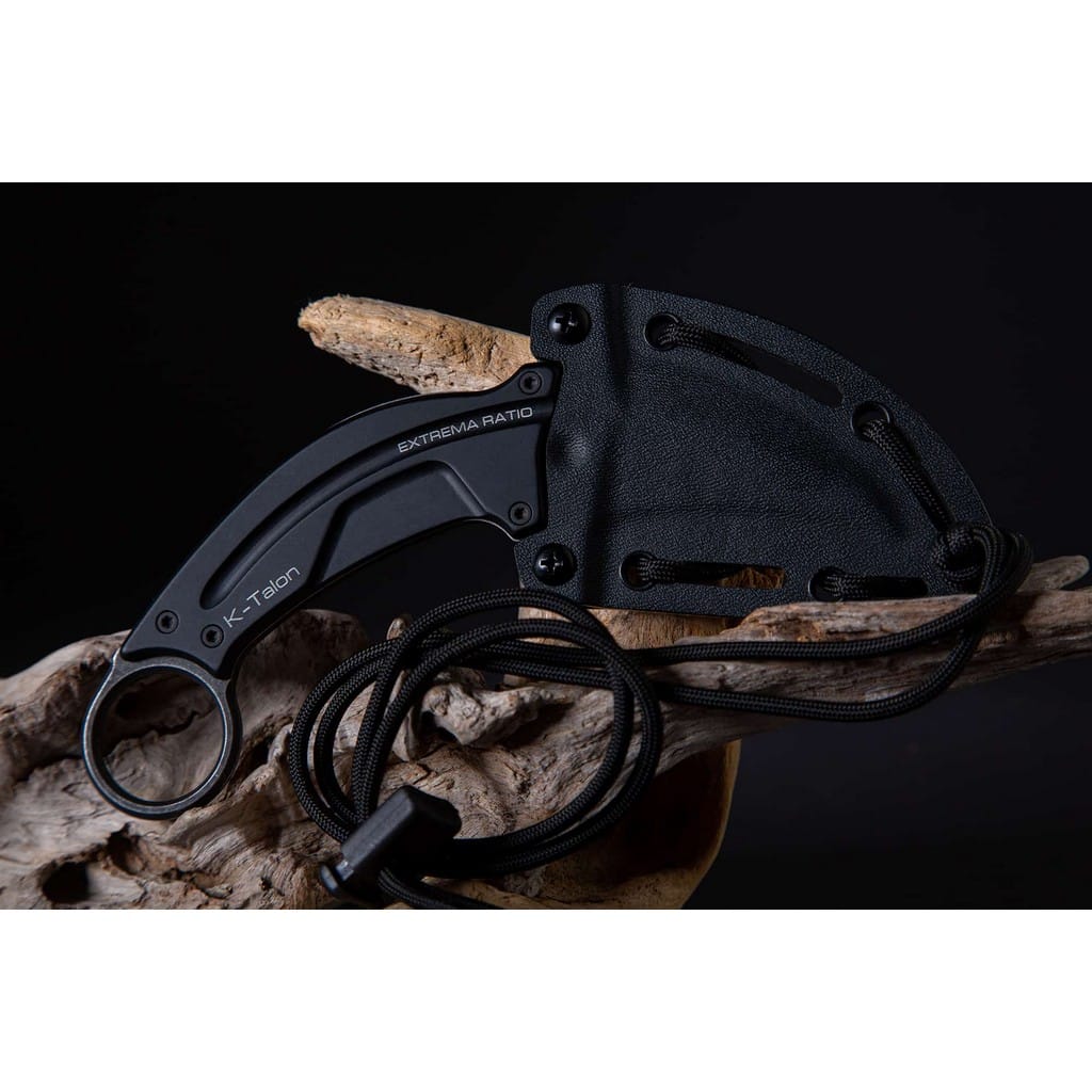 K-Talon firmy Extrema Ratio to kompaktowy i cienki nóż typu karambit gwarantujący niezawodność w każdej sytuacji. Głownia o zakrzywionym do dołu, drapieżnym profilu Hawkbill została wykonana z austriackiej stali nierdzewnej Bohler N690 o twardości 58 HRC. Charakteryzuje się wysoką odpornością na korozję i długim trzymaniem ostrości. Wykończenie jej metodą Dark Stone pozostawia nieregularną powłokę dobrze maskującą rysy i zadrapania powstające podczas eksploatacji. Ten specyficzny kształt ostrza idealnie sprawdzi się do głębokiego cięcia i dziurkowania. Do stalowej konstrukcji full tang przymocowano śrubami aluminiowe okładziny rękojeści. Ergonomiczne wyprofilowanie pod palce zwiększa przyczepność do dłoni i zapewnia komfortową pracę. Zakończenie w postaci okrągłej głowicy przedłuża chwyt i pozwala na pełną kontrolę nad narzędziem podczas użytkowania. W zestawie znajduje się pochwa z kydexu wyposażona w linkę z ogranicznikiem, dzięki której możemy wygodnie przenosić produkt na szyi. Dodatkowo liczne otwory na jej krawędzi umożliwiają troczenie noża do wyposażenia. K-Talon oferuje wydajności na najwyższym poziomie, dlatego sprosta oczekiwaniom nawet najbardziej wymagających kolekcjonerów. Extrema Ratio to włoska manufaktura z siedzibą w Prato, w regionie Toskanii. Firma od 1997 roku mistrzowsko projektuje niesamowicie mocne narzędzia taktycznie i myśliwskie, które nie mają sobie równych w przemyśle militarnym. Produkcja opiera się jedynie na wysokiej jakości materiałach i najnowocześniejszych technologiach. Co w połączeniu z tradycyjnym rzemiosłem i ręcznym wykończeniem każdego egzemplarza tworzy produkt spełniający najostrzejsze normy wojskowe.