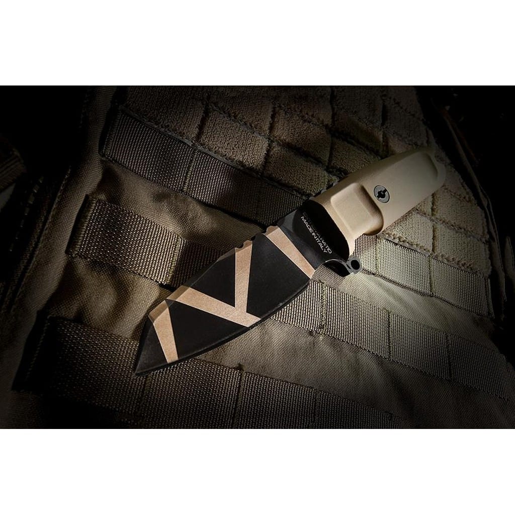 Task C to kompaktowa wersja oryginału, wyprodukowana przez firmę Extrema Ratio. Jest to wytrzymały i masywny model o konstrukcji full tang, dzięki której bardzo dobrze poradzi sobie z niejednym wyzwaniem w terenie. Głownia o zmodyfikowanym profilu Tanto, gruba na ponad sześć milimetrów, została wykonana z austriackiej stali nierdzewnej Bohler N690 o twardości 58 HRC. Charakteryzuje się wysoką odpornością na korozję i długim trzymaniem ostrości. W celu zabezpieczenia jej przed zarysowaniami i negatywnym działaniem czynników zewnętrznych pokryto ją czarną, matową powłoką z grawerowanym laserowo pustynnym kamuflażem Desert Warfare. Bezpieczeństwo użytkowania gwarantuje duży jelec chroniący palce przed ich przypadkowym zsunięciem się na krawędź tnącą. Dodatkowo karbowany grzbiet klingi stanowi stabilne podparcie dla kciuka, co jest niezwykle pomocne przy precyzyjnych zadaniach. Rękojeść z termoplastycznego elastomeru o nazwie Forprene zapewnia komfort, a także doskonałą ergonomię chwytu świetnie dopasowując się do dłoni użytkownika, nawet gdy jest ona w rękawicy. Cechuje się niewrażliwością na chemikalia oraz ekstremalne temperatury, co pozwala jej przechodzić rygorystyczne testy NATO. Na zakończeniu, w stalowej głowicy, w awaryjnej sytuacji służącej jako zbijak do szyb, umieszczono otwór na linkę, umożliwiający przełożenie paracordu i stworzenie oplotu na nadgarstek. W zestawie znajduje się pochwa z formowanego wtryskowo, niepodatnego na wstrząsy nylonu. Wyposażono ją w mocowanie typu Tek-Lok, za pomocą którego możemy wygodnie przenosić narzędzie na pasku w pozycji pionowej, poziomej lub pod kątem 45°. Extrema Ratio to włoska manufaktura z siedzibą w Prato, w regionie Toskanii. Firma od 1997 roku mistrzowsko projektuje niesamowicie mocne noże taktycznie i myśliwskie, które nie mają sobie równych w przemyśle militarnym. Produkcja opiera się jedynie na wysokiej jakości materiałach i najnowocześniejszych technologiach. Co w połączeniu z tradycyjnym rzemiosłem i ręcznym wykończeniem każdego egzemplarza tworzy produkt spełniający najostrzejsze normy wojskowe.