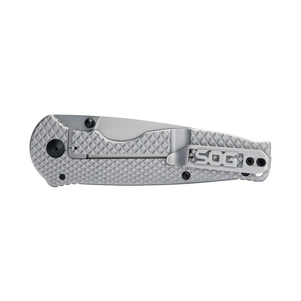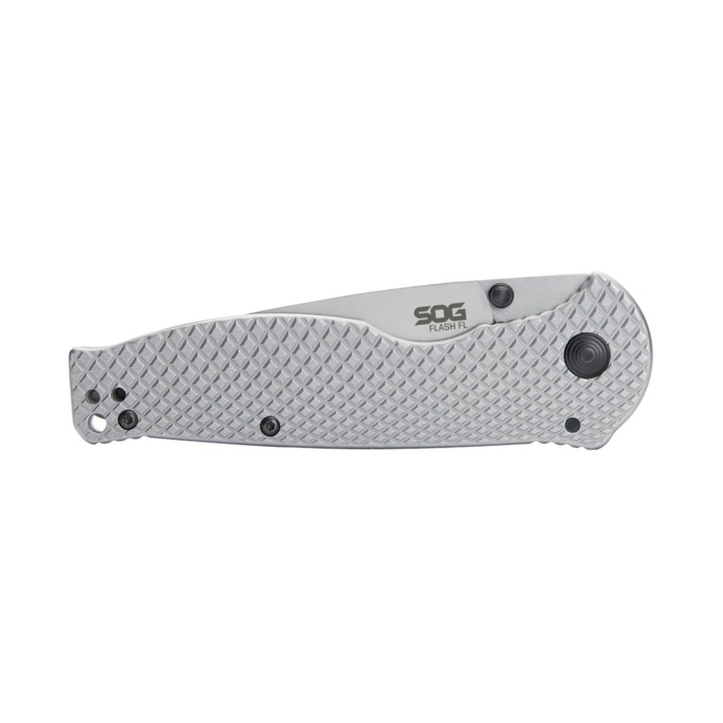 Sog Flash FL to prosta, całkowicie metalowa konstrukcja noża zaprojektowanego do codziennego użytku. Głownię o profilu Drop Point i satynowym wykończeniu wykonano ze stali 8Cr13MoV. Szybkie wysunięcie ostrza jedną ręką umożliwia kołek zamocowany po obu stronach klingi - przyjazne rozwiązanie zarówno dla użytkowników prawo jak i leworęcznych. Solidna rękojeść o antypoślizgowej fakturze i ergonomicznym wyprofilowaniu gwarantuje dobrą kontrolę nad folderem podczas pracy i zapewnia komfort użytkowania. W pozycji rozłożonej głownia blokowana jest przez niezawodny mechanizm Frame Lock. Całość uzupełnia otwór na linkę oraz dwupozycyjny klips mocujący z logo producenta do głębokiego przenoszenia narzędzia w kieszeni spodni.