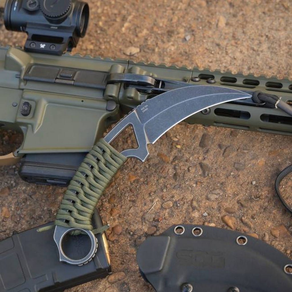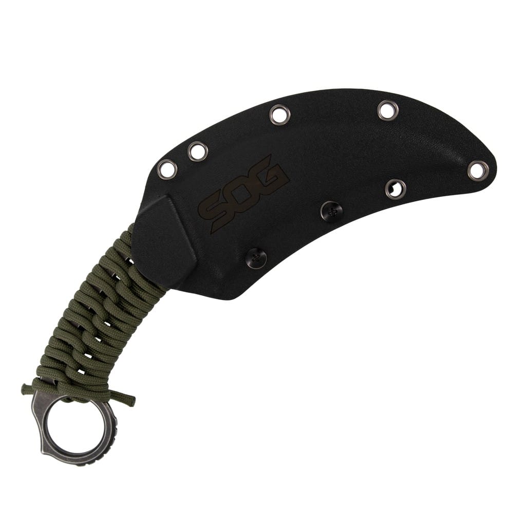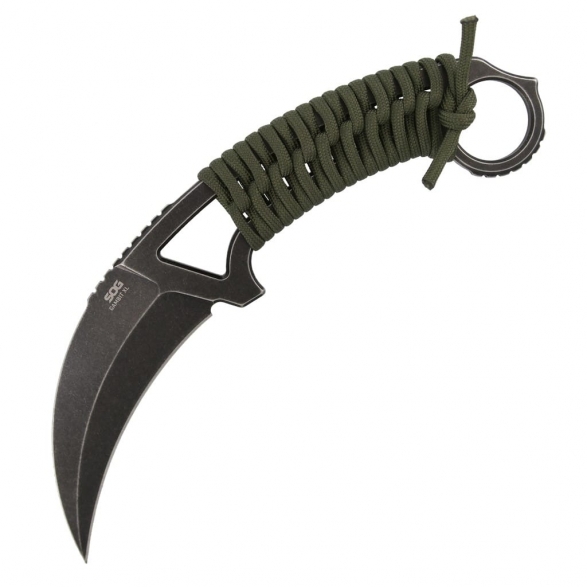 Gambit w wersji XL to taktyczny model zaprojektowany przez firmę SOG do skutecznego cięcia i przebijania. Klinga o zakrzywionym do dołu profilu Hawkbill została wykonana z japońskiej stali nierdzewnej AUS10A poddanej kriogenicznej obróbce cieplnej, dzięki której pozostaje dłużej ostra i jest bardziej odporna na pęknięcia i wykruszenia. Wykończenie ostrza na czarno metodą Stonewash pozostawia nieregularną powłokę dobrze maskującą rysy i zadrapania powstające podczas eksploatacji. Karbowany grzbiet klingi stanowi stabilne wsparcie dla kciuka i zapewnia bezpieczeństwo podczas pracy. Stalową konstrukcję full tang w miejscu chwytu opleciono zielonym paracordem, co poprawia komfort użytkowania, a w awaryjnej sytuacji dostarcza spory odcinek linki mocującej. Okrągła głowica na palec, znajdująca się na zakończeniu rękojeści, zwiększa kontrolę nad nożem i gwarantuje pewny chwyt w każdych warunkach. Całość dopełnia pochwa z kydexu wyposażona w mocowanie typu Tek-Lok, które pozwala na wygodne transportowanie noża na pasku spodni, blisko ciała. Otwory na krawędziach kabury to dodatkowe opcje montażu narzędzia do kamizelki lub innego wyposażenia. Gambit XL to niezastąpiony towarzysz codziennej przygody oferujący niezawodność i skuteczność działania o każdej porze dnia.