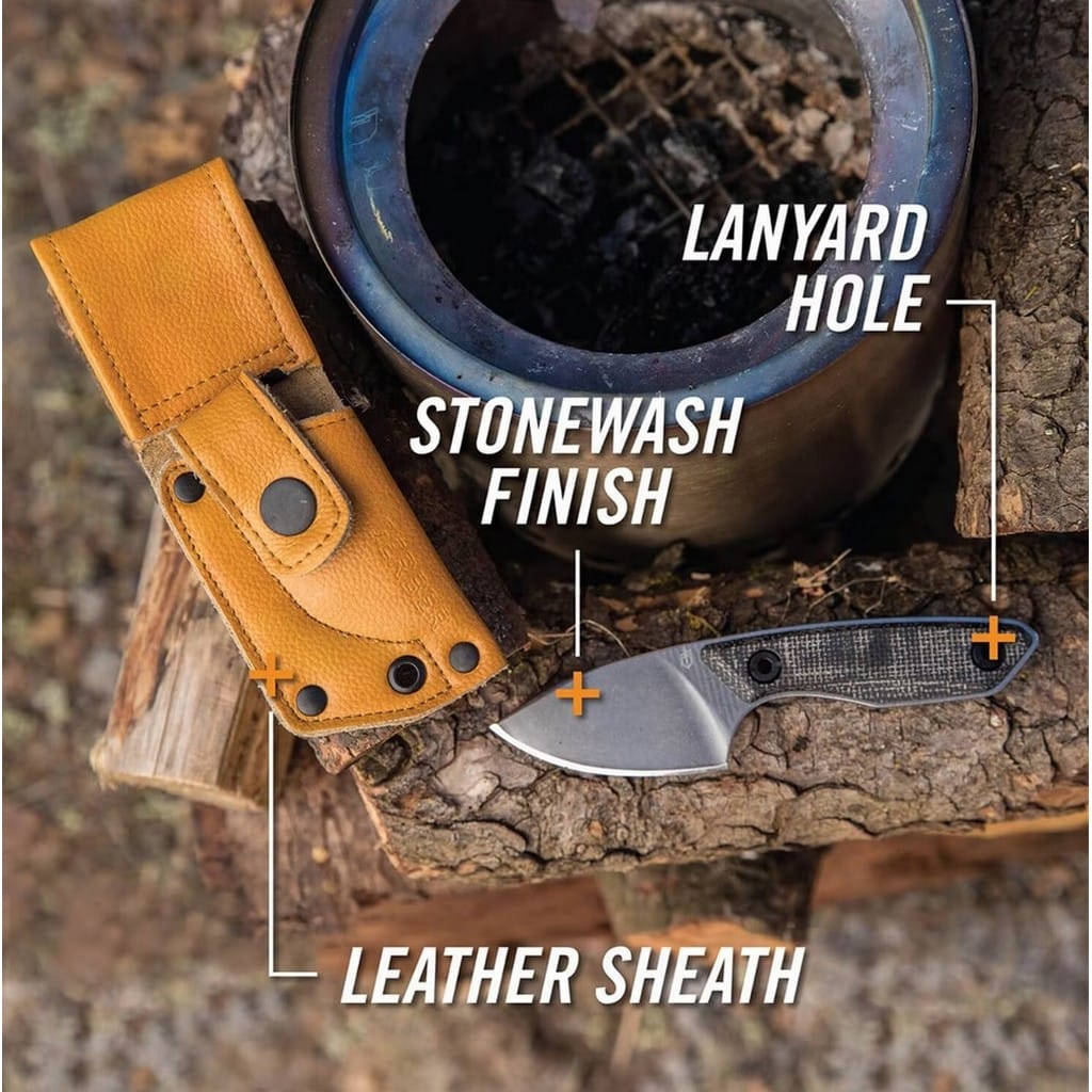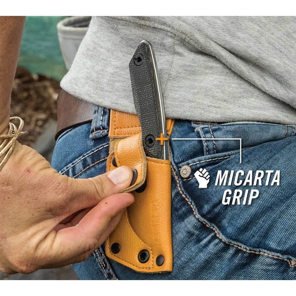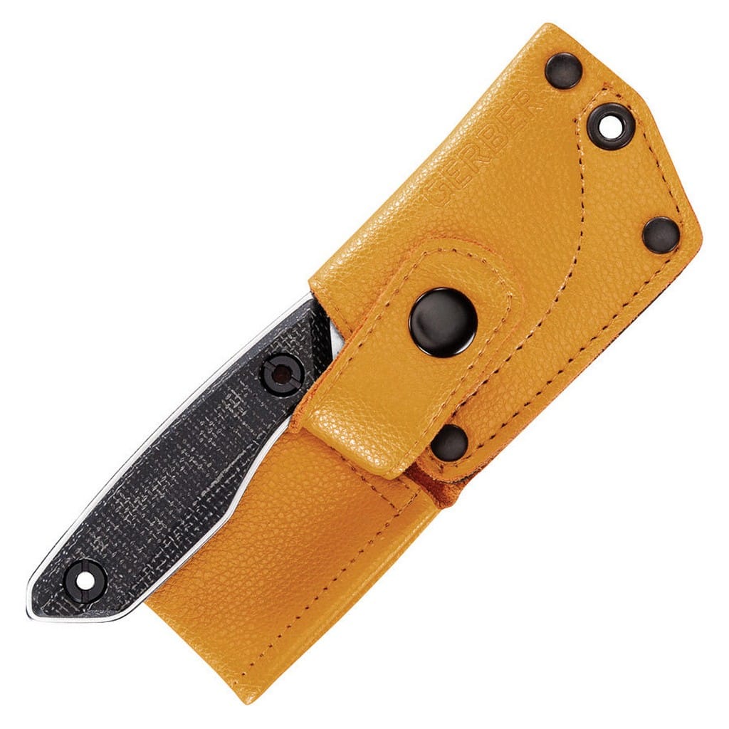 Stowe amerykańskiej firmy Gerber to połączenie siły i kompaktowości. Nóż doskonale sprawdzi się w terenie do drobnych prac survivalowych oraz na polowaniu, czy kempingu. Model charakteryzuje się wytrzymałą konstrukcją full tang, która zwiększa możliwości tego niedużego narzędzia. Ostrze o uniwersalnym profilu Clip Point zostało wykonane ze stali nierdzewnej 440A. Wykończenie głowni metodą Stonewash pozostawia nieregularną powłokę dobrze maskującą rysy powstające podczas eksploatacji. Okładziny rękojeści z przyjemnej w dotyku Micarty gwarantują pewny chwyt w każdych warunkach. Na zakończeniu znajduje się otwór umożliwiający zamocowanie kawałka paracordu i stworzenie oplotu na nadgarstek. Całość dopełnia skórzana pochwa w widocznym, żółtym kolorze do wygodnego transportowania noża na pasku, blisko ciała.