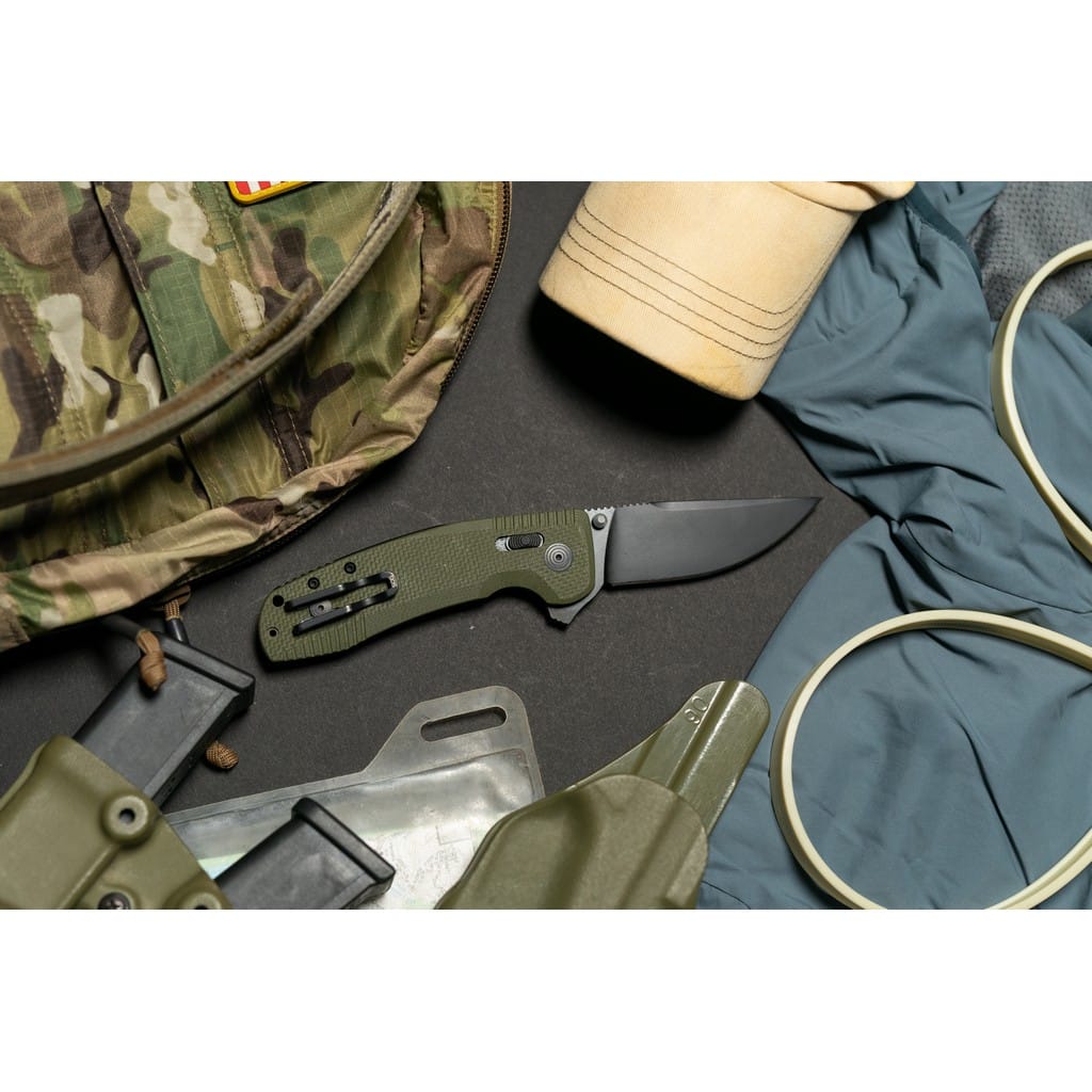 SOG-TAC XR to idealne rozwiązanie dla umundurowanych profesjonalistów charakteryzujące się niezawodnością i funkcjonalnością działania. Ostrze o profilu Clip Point zostało wykonane z wysokiej jakości stali narzędziowej D2 poddanej kriogenicznej obróbce cieplnej, dzięki czemu pozostaje ona dłużej ostra i jest bardziej odporna na pęknięcia i wykruszenia. Pokryto ją czarnym azotkiem tytanu, odpornym na zarysowania oraz chroniącym przed korozją i odblaskami. Ergonomicznie wyprofilowana rękojeść z lekkiego tworzywa G10 w zielonym kolorze gwarantuje dobrą przyczepność do dłoni i pewny chwyt w każdych warunkach otoczenia. Karbowany backspacer oraz grzbiet klingi zwiększają kontrolę nad nożem, zaś flipper pełniący jednocześnie funkcję jelca zabezpiecza rękę przed jej przypadkowym zsunięciem się na krawędź tnącą. Model posiada innowacyjny systemem blokującym XR umożliwiający wysunięcie ostrza na trzy różne sposoby. Przy pomocy obustronnego kołka, flippera lub suwakiem umieszczonym na rękojeści. Wybór należy do użytkownika w zależności od indywidualnych preferencji i przyzwyczajeń. Konstrukcję uzupełnia dwupozycyjny klips do wygodne przenoszenie narzędzia w kieszeni spodni lub przy wyposażeniu oraz otwór na linkę do zamocowania paracordu.