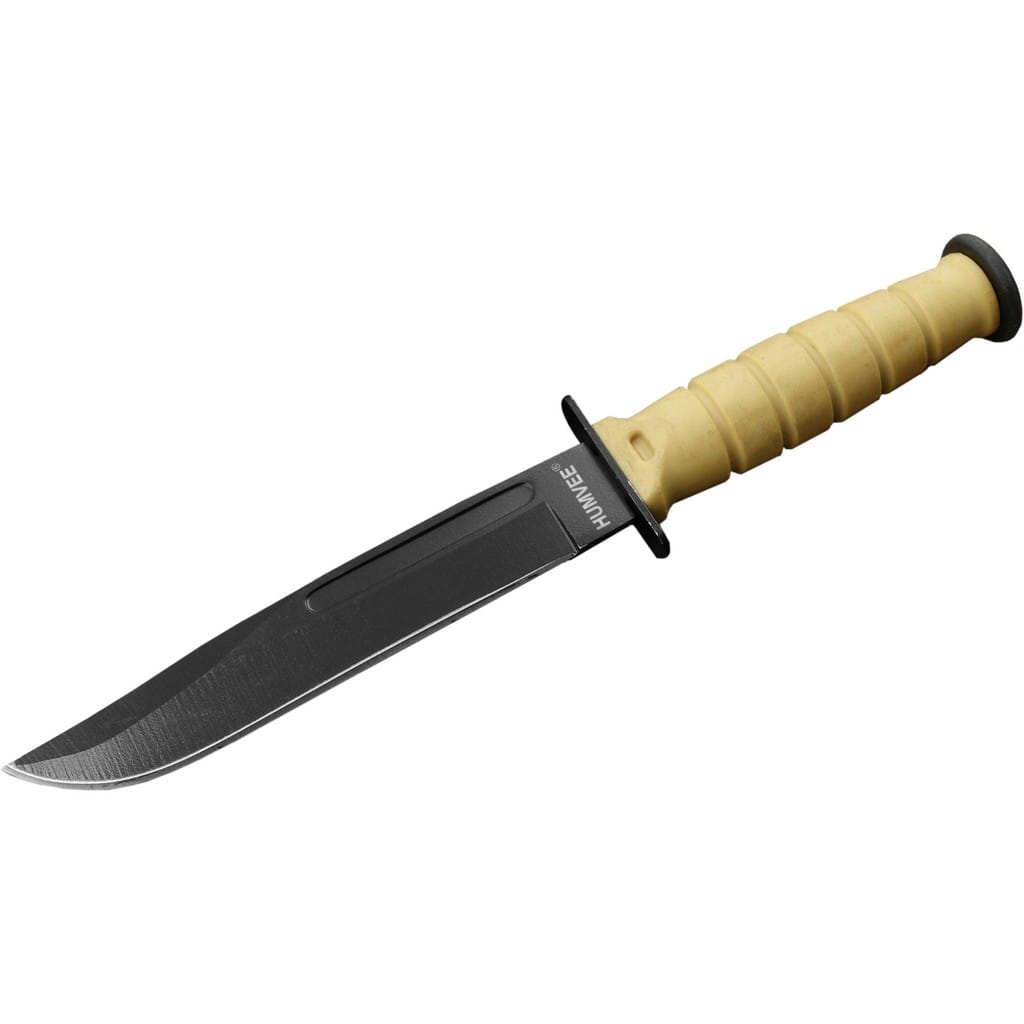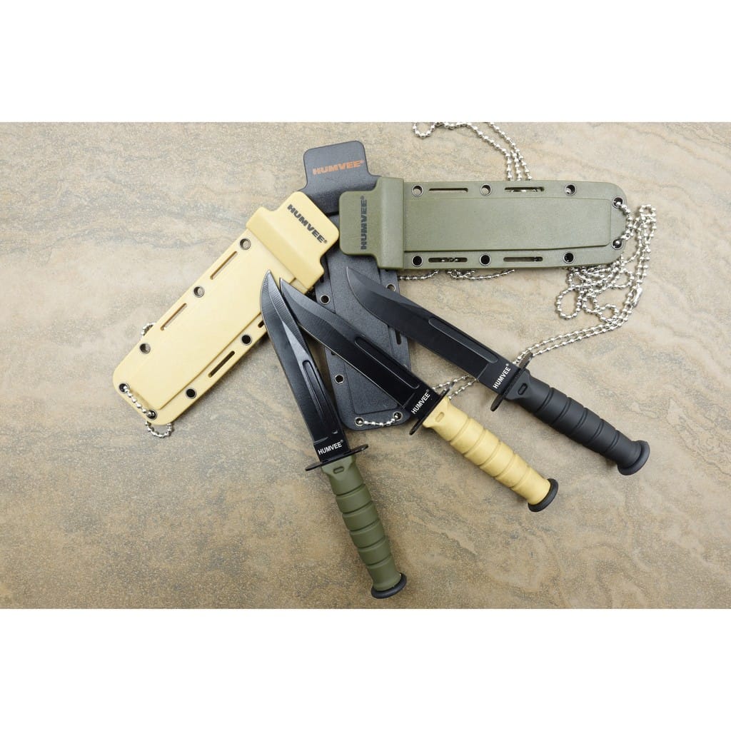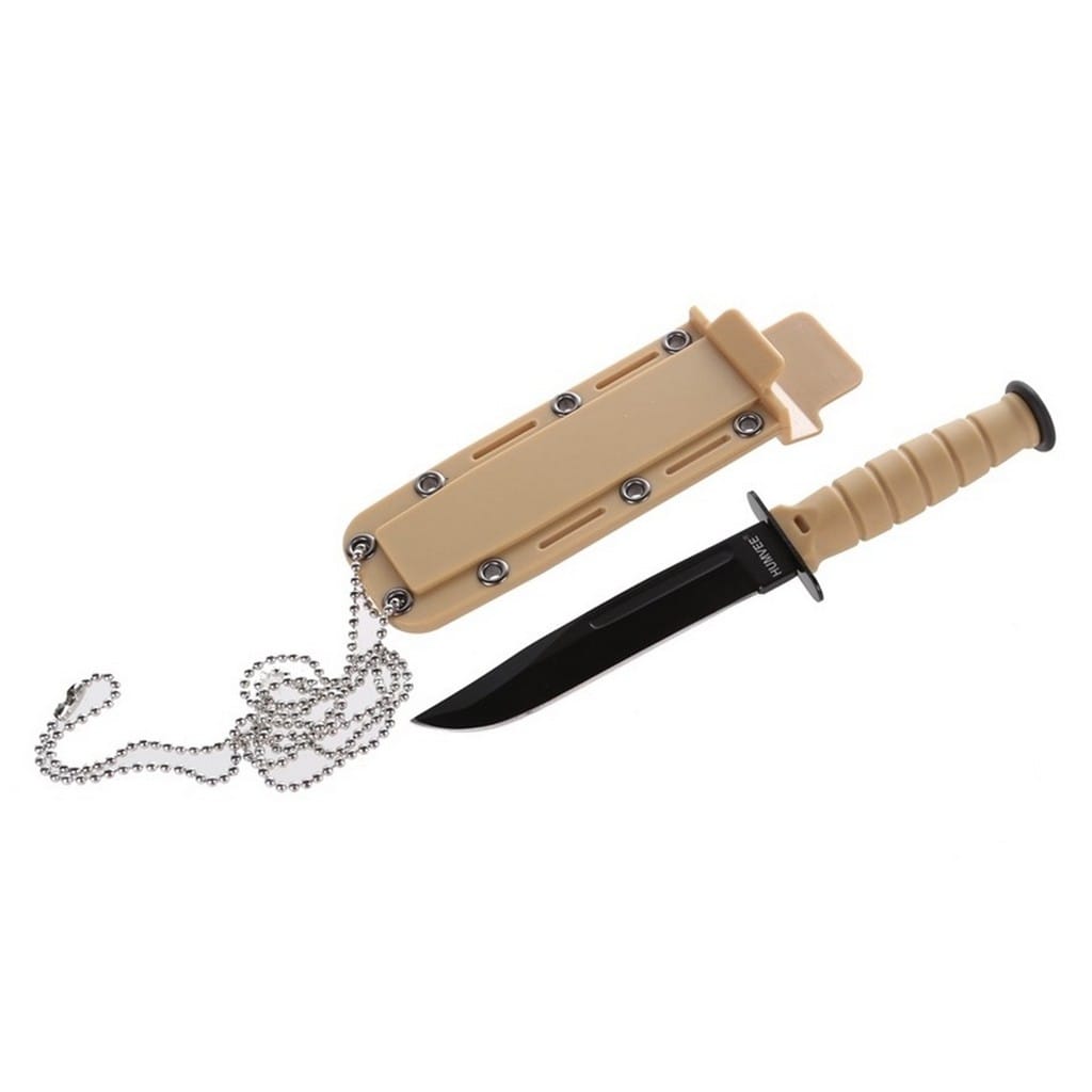 Niewielki nóż survivalowy od firmy Humvee spełniający wszystkie cechy pełnowymiarowego odpowiednika. Ostrze o profilu Drop Point zostało wykonane ze stali nierdzewnej i pokryte czarną farbą zabezpieczającą przed korozją i odblaskami. Niewielka rękojeść z tworzywa zapewnia antypoślizgowy chwyt, a dużych rozmiarów jelec zabezpiecza dłoń przed zsunięciem się na ostrze. Całość uzupełnia pochwa z kydexu wyposażona w łańcuszek kulkowy, dzięki któremu możemy zawiesić nóż na szyi. Otwory w pokrowcu umożliwiają zamocowanie go również do wyposażenia. Model doskonale sprawdzi się w codziennym noszeniu, a jego mała waga z pewnością nie obciąży naszego zestawu EDC. Nóż dostępny w trzech wersjach kolorystycznych: czarnej, zielonej oraz pustynnej. Kolor wysyłany jest losowo.