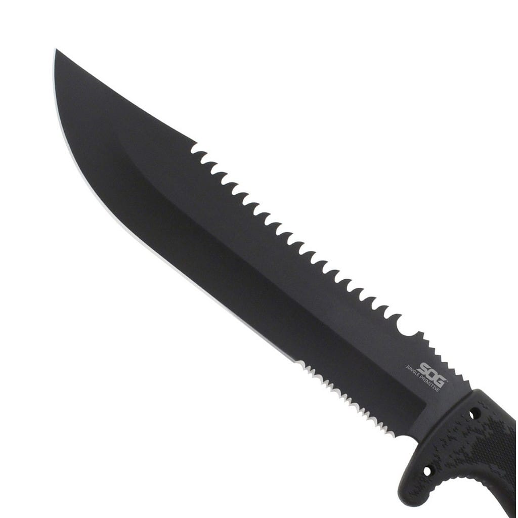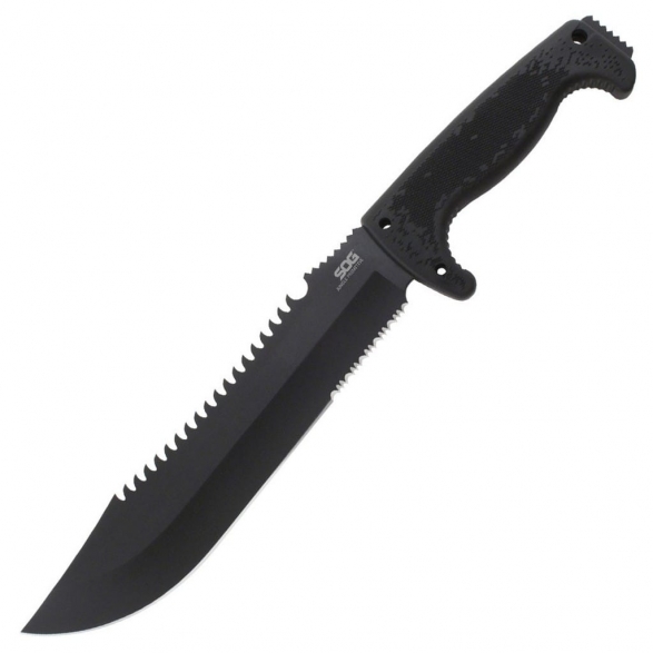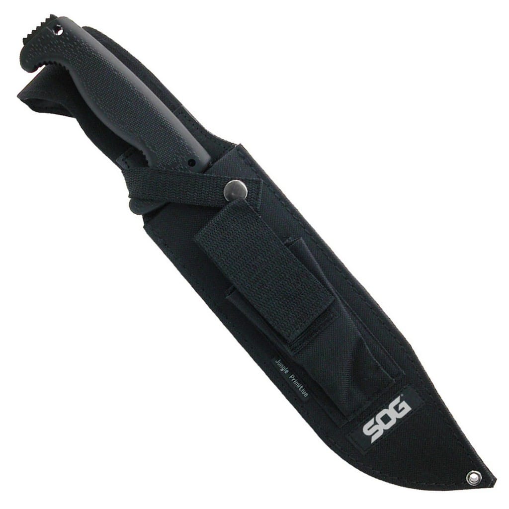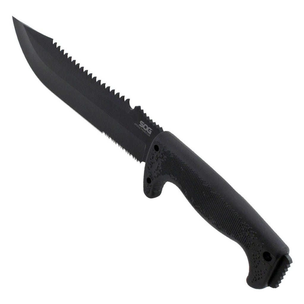 Jungle Primitive to sporych rozmiarów nóż stały zaprojektowany przez firmę SOG. Jego wszechstronne zastosowanie świetnie sprawdzi się na wyprawach za miasto, a nawet przy pracach w ogrodzie. Żadne zadanie mu nie straszne od rąbania, siekania, cięcia, piłowania, a nawet może posłużyć za młotek. Ostrze zostało wykonane ze stali 8Cr13MoV, która cechuje się świetną wytrzymałością oraz ostrością. Rękojeść z kratonu zapewnia pewne i wygodne trzymanie w każdych warunkach pogodowych. Do zestawu została dołączona nylonowa pochwa z małą kieszonką z przodu, w której można przenosić krzesiwo, ostrzałkę czy inne potrzebne elementy na wyprawie.