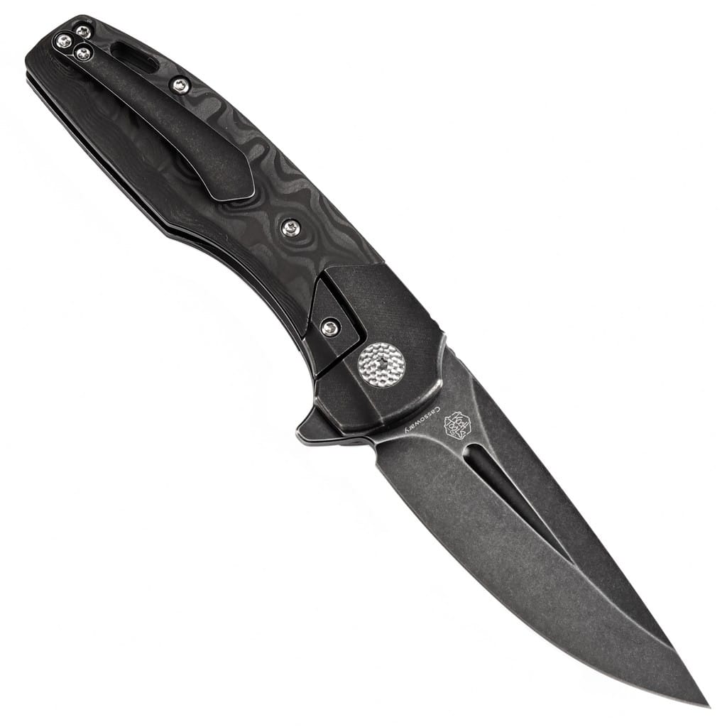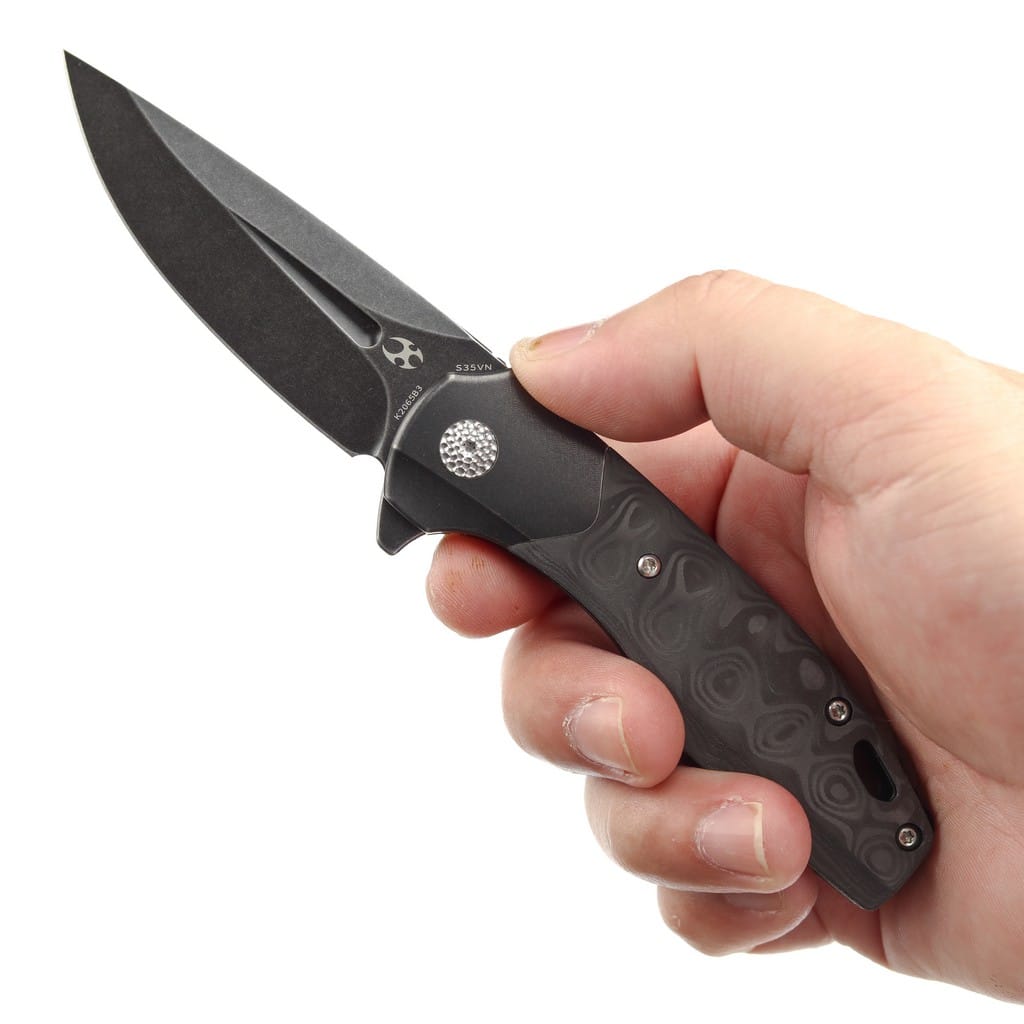 Cassowary to elegancki folder zaprojektowany przez Justina Kocha, właściciela Koch Tools, potrafiącego łączyć innowacyjność z estetycznym wyglądem i niezbędną na co dzień funkcjonalnością. Ostrze o uniwersalnym profilu Clip Point zostało wykonane z amerykańskiej stali nierdzewnej klasy premium CPM S35VN. Odpowiednio dobrane proporcje wanadu i niobu wpływają na jej twardość, wytrzymałość i odporność na korozję. Wykończenie jej na czarno metodą Stonewash pozostawia nieregularną powłokę dobrze maskującą rysy i zadrapania powstające podczas eksploatacji. Klingę osadzono na ceramicznych łożyskach kulkowych, która przy wykorzystaniu dużego flippera, pełniącego jednocześnie funkcję jelca, wysuwa się płynnie i gładko. Prosta obsługa jedną ręką zadowoli zarówno osoby prawo jak i leworęczne. Bezpieczeństwo pracy zapewnia solidny i niezawodny mechanizm Frame Lock blokujący narzędzie po rozłożeniu oraz delikatnie karbowany grzbiet głowni stanowiący stabilne wsparcie dla kciuka. Do tytanowej ramy przymocowano okładziny rękojeści zrobione z włókna węglowego o interesującym wzorze przypominającym róże. Na zakończeniu umieszczono otwór umożliwiający przełożenie breloka ozdobnego lub paracordu, co ułatwi chwytanie noża. Całość uzupełnia tytanowy klips mocujący umożliwiający wygodne przenoszenie narzędzia w kieszeni spodni. W zestawie znajduje się ściereczka z mikrofibry oraz wysokiej jakości pokrowiec do bezpiecznego transportowania produktu, a całość zapakowano w czarne pudełko prezentowe. Kansept Knives to uosobienie najnowocześniejszych technologii i praktycznego designu. Jej motto brzmi “Nie tylko produkujemy noże, czynimy je lepszymi”, co doskonale oddaje charakter tej marki. Firma wyróżnia się z tłumu innowacyjnymi koncepcjami angażując do współpracy najlepszych projektantów z branży. Każdy element jest skrupulatnie obrabiany ręcznie lub za pomocą zaawansowanych maszyn, co stanowi znakomite połączenie kunsztu i estetyki.