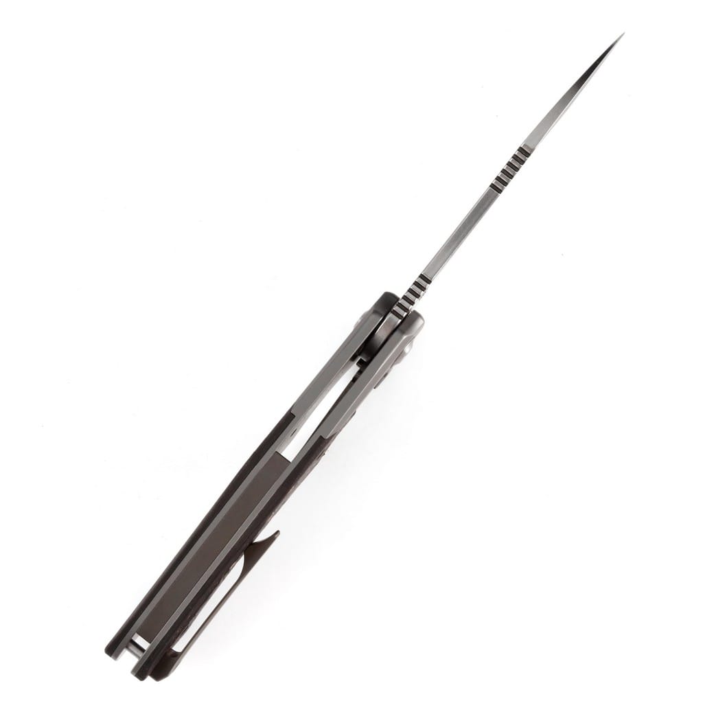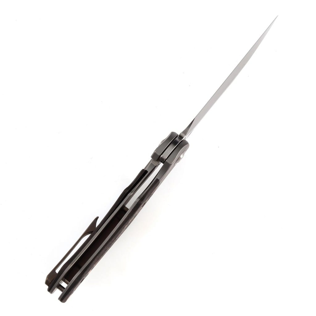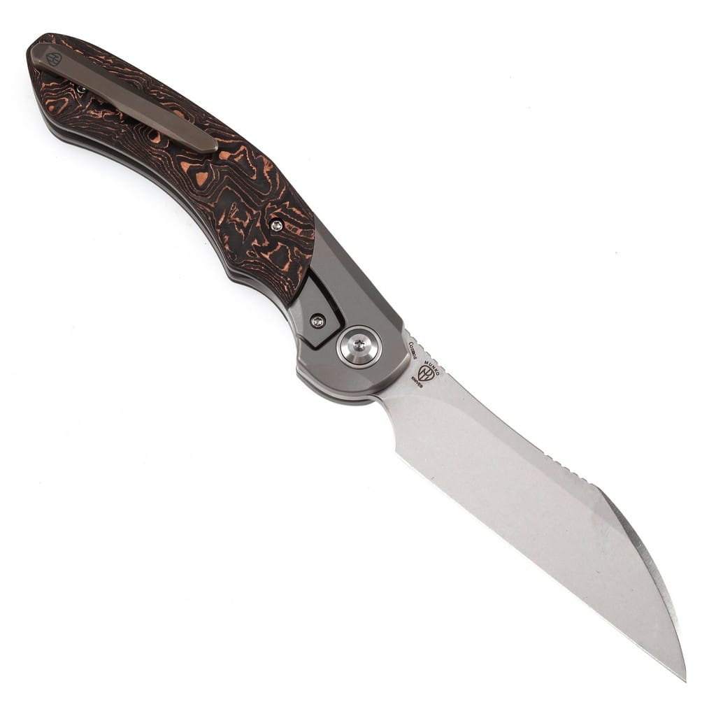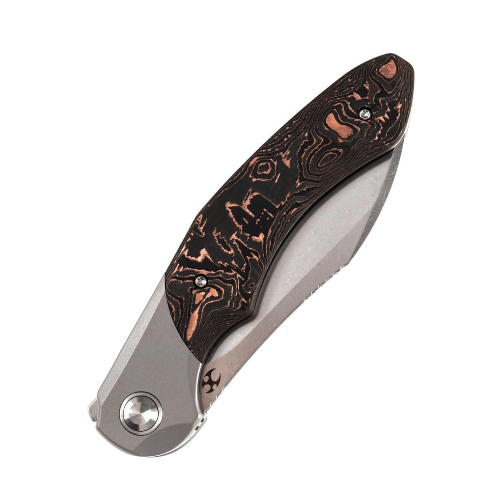 Paul Munko, artysta z Connecticut, zaprojektował dla firmy Kanspet Knives piękny model Cosmos. Ten wysokiej jakości folder stanowi świetny wybór na niezawodnego towarzysza codziennej przygody, a także idealną ozdobę gablety kolekcjonerskiej. Głownia o profilu Wharncliffe została wykonana ze stali nierdzewnej klasy premium CPM 20CV o dużej zawartości chromu, co zwiększa odporność na korozję i pozwala długo utrzymać właściwą ostrość krawędzi tnącej. Wykończenie jej metodą Stonewash pozostawia nieregularną powłokę dobrze maskującą rysy i zadrapania powstające podczas eksploatacji. Klingę osadzono na ceramicznych łożyskach kulkowych, która przy wykorzystaniu dyskretnego front flippera wysuwa się płynnie i gładko. Prosta obsługa jedną ręką zadowoli zarówno osoby prawo jak i leworęczne. Bezpieczeństwo pracy zapewnia solidny i niezawodny mechanizm Frame Lock, zaś karbowany grzbiet ostrza daje stabilne podparcie dla kciuka, co jest niezwykle przydatne przy precyzyjnych zadaniach. Do tytanowej ramy przymocowano eleganckie okładziny z włókna węglowego z dodatkiem miedzi. Ergonomiczne wyprofilowanie rękojeści gwarantuje pewny chwyt w każdych warunkach. Konstrukcję uzupełnia klips mocujący, pozwalający na wygodne przenoszenie narzędzia w kieszeni spodni. W zestawie znajduje się ściereczka z mikrofibry oraz gatunkowy pokrowiec do bezpiecznego transportowania produktu, a całość zapakowano w czarne pudełko prezentowe. Kansept Knives to uosobienie najnowocześniejszych technologii i praktycznego wzornictwa. Jej motto brzmi “Nie tylko produkujemy noże, czynimy je lepszymi”, co doskonale oddaje charakter tej marki. Firma wyróżnia się z tłumu innowacyjnymi koncepcjami angażując do współpracy najlepszych projektantów z branży. Każdy element obrabiany jest skrupulatnie ręcznie lub za pomocą zaawansowanych maszyn, co tworzy znakomite połączenie kunsztu i estetyki.