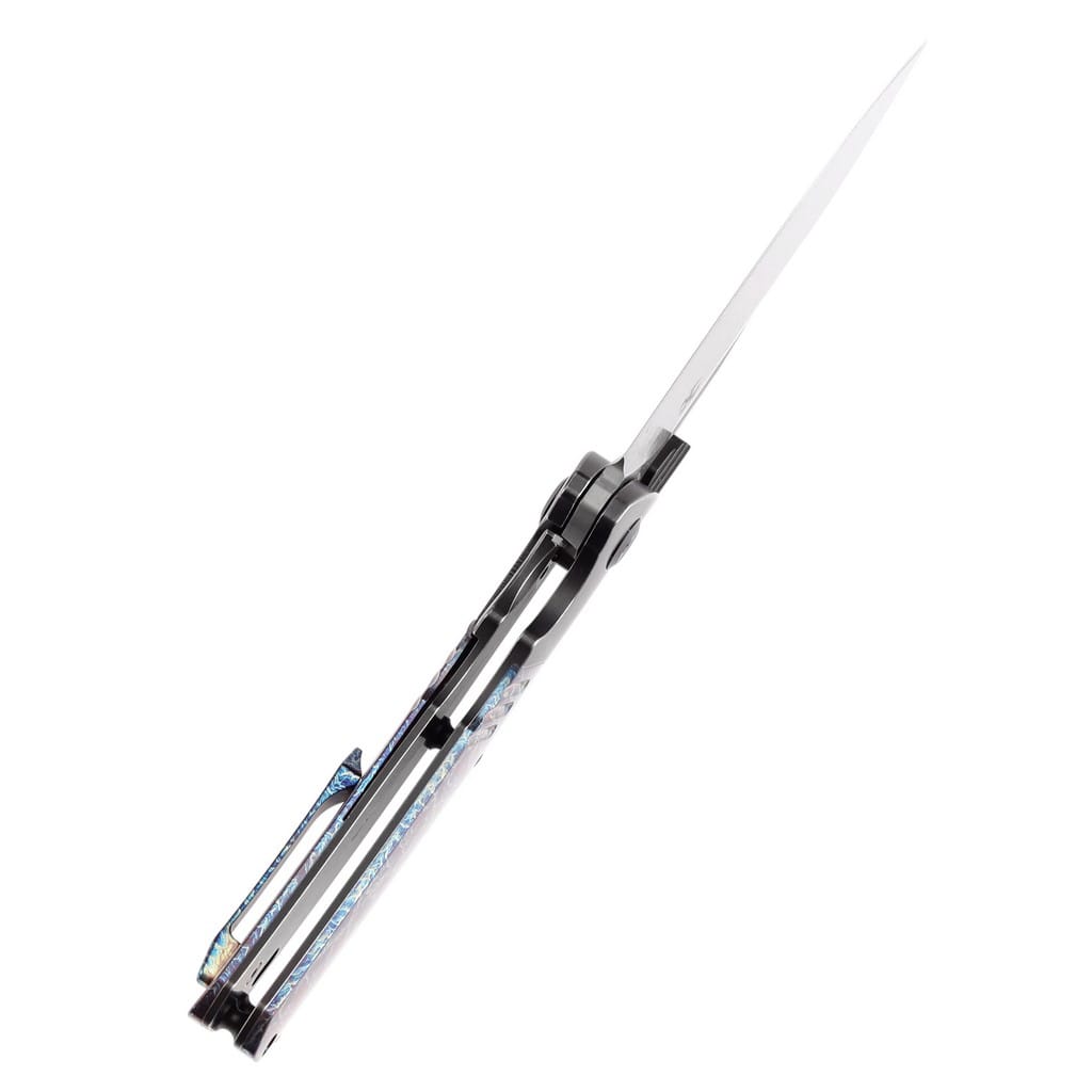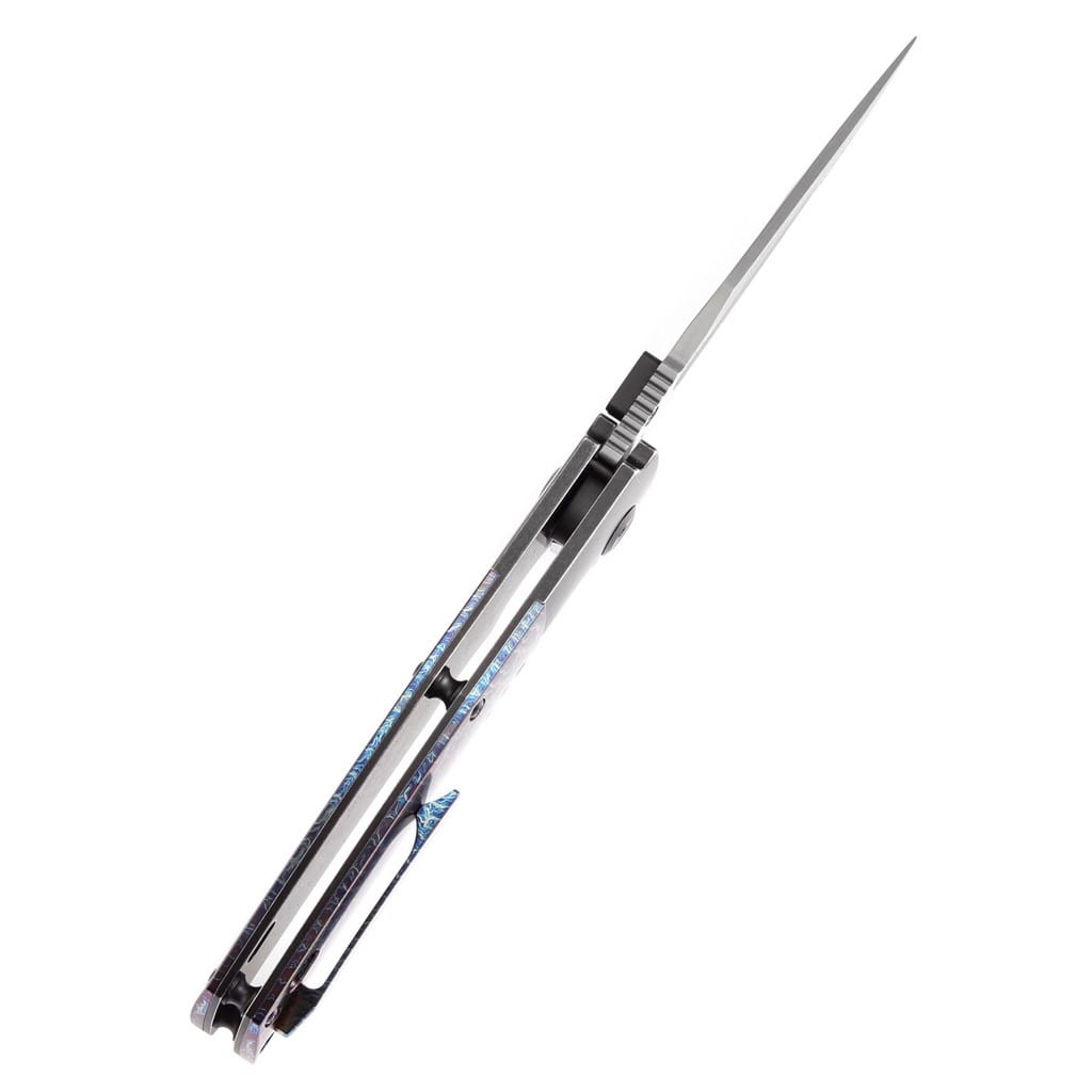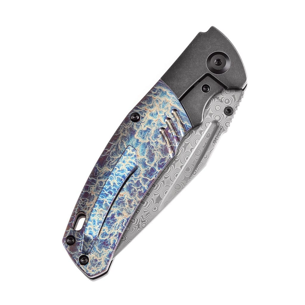 Morgan Koens posiada bogate doświadczenie w projektowaniu niestandardowych noży z ostrzem stałym. Wraz z firmą Kansept Knives stworzył ciekawy model składany do codziennej pracy, który wysoką jakością wykonania i niezawodnością działania oczaruje niejednego kolekcjonera. Szerokie ostrze o profilu Clip Point zrobiono ze stali damasceńskiej o interesującym wzorze, bardzo dobrze ukrywającym wszelkie niedoskonałości powstające podczas eksploatacji. Klingę osadzono na ceramicznych łożyskach kulkowych, która przy wykorzystaniu kołka lub podłużnego zagłębienia, znajdującego się po obu stronach głowni, wysuwa się płynnie i gładko. Solidny i niezawodny mechanizm Frame Lock chroni przed przypadkowym złożeniem się narzędzia, gdy jest w użyciu. Karbowany grzbiet ostrza daje stabilne podparcie dla kciuka ułatwiając tym samym realizację zadań wymagających większej precyzji. Rękojeść z tytanu, o intrygującym i pięknym wykończeniu, dzięki głębokiemu wyprofilowaniu pod palec gwarantuje dobrą przyczepność do dłoni i pewny chwyt. Na zakończeniu umieszczono otwór umożliwiający przełożenie breloka ozdobnego lub paracordu. Konstrukcję uzupełnia tytanowy klips mocujący do wygodnego przenoszenie foldera w kieszeni spodni. W zestawie znajduje się ściereczka z mikrofibry oraz gatunkowy pokrowiec transportowy, a całość zapakowano w czarne pudełko prezentowe. Kansept Knives to uosobienie najnowocześniejszych technologii i praktycznego wzornictwa. Jej motto brzmi “Nie tylko produkujemy noże, czynimy je lepszymi”, co doskonale oddaje charakter tej marki. Firma wyróżnia się z tłumu innowacyjnymi koncepcjami angażując do współpracy najlepszych projektantów z branży. Każdy element jest skrupulatnie obrabiany, za pomocą zaawansowanych maszyn lub ręcznie, tworząc znakomite połączenie kunsztu i estetyki.